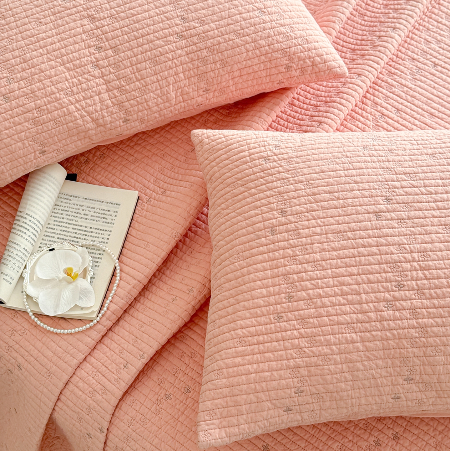 (总)床盖工厂店 2026新款双面水洗全棉填充棉花床盖三件套-朵拉系列,朵拉-粉,朵拉-灰,朵拉-咖,朵拉-绿,组合图