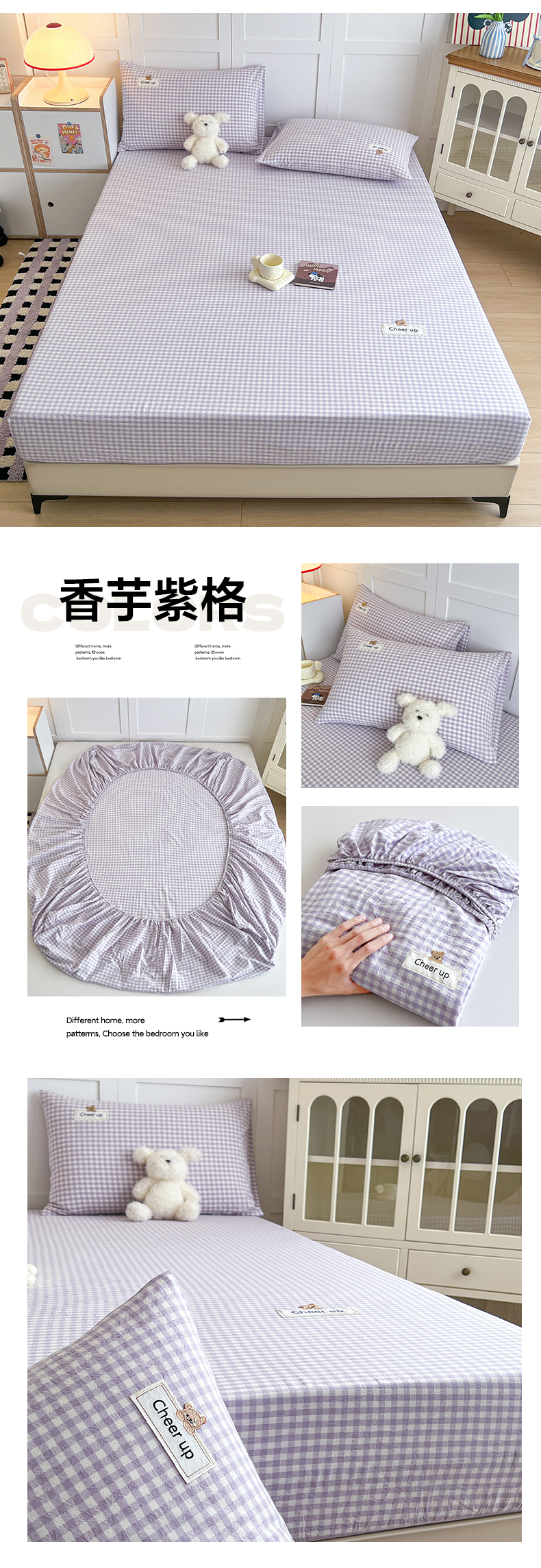 • 91家纺网 家纺一手货源 找家纺 佳笠家居 2026年新款kimi熊a类全棉色织水洗棉大尺寸单床笠 香芋紫格