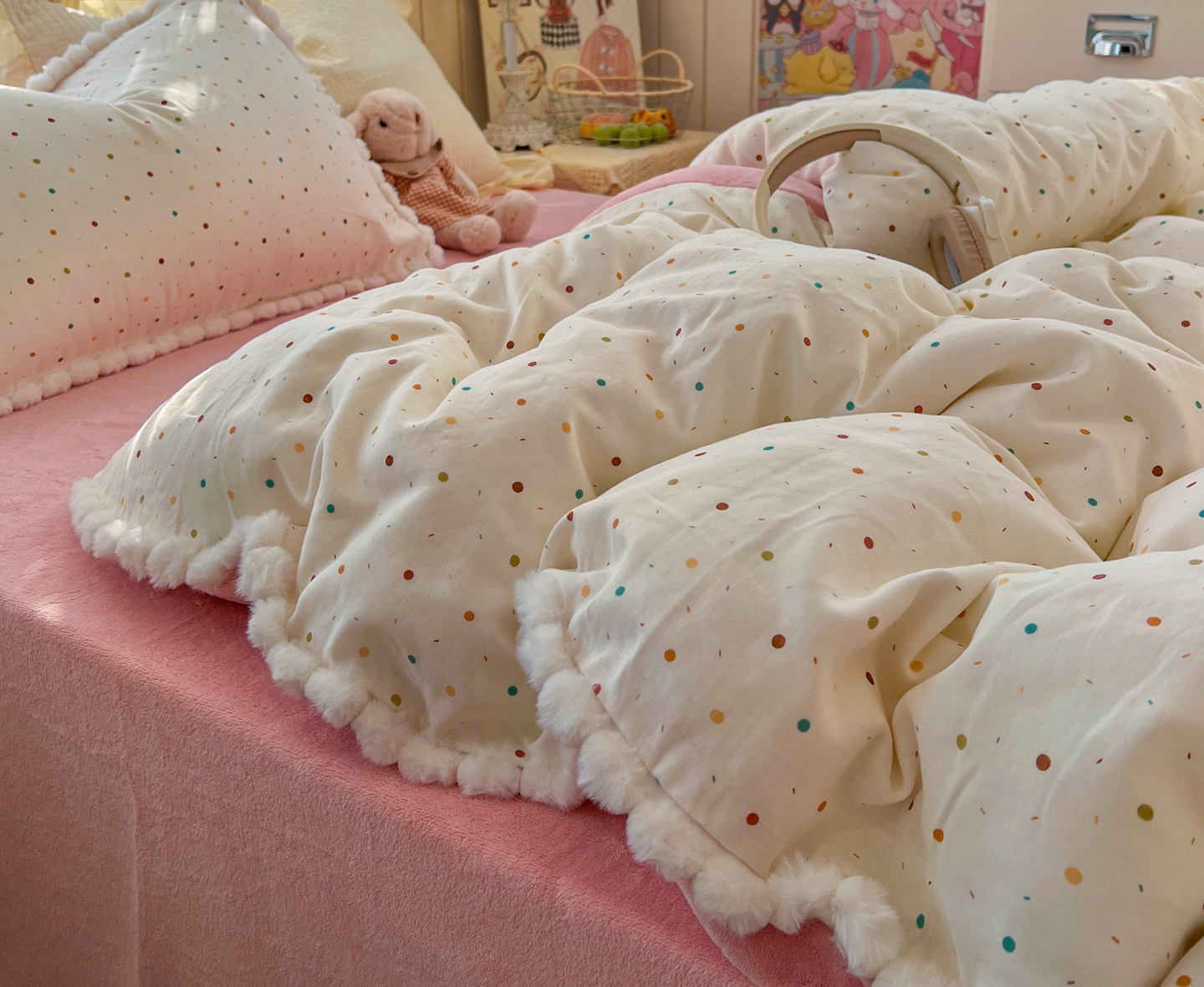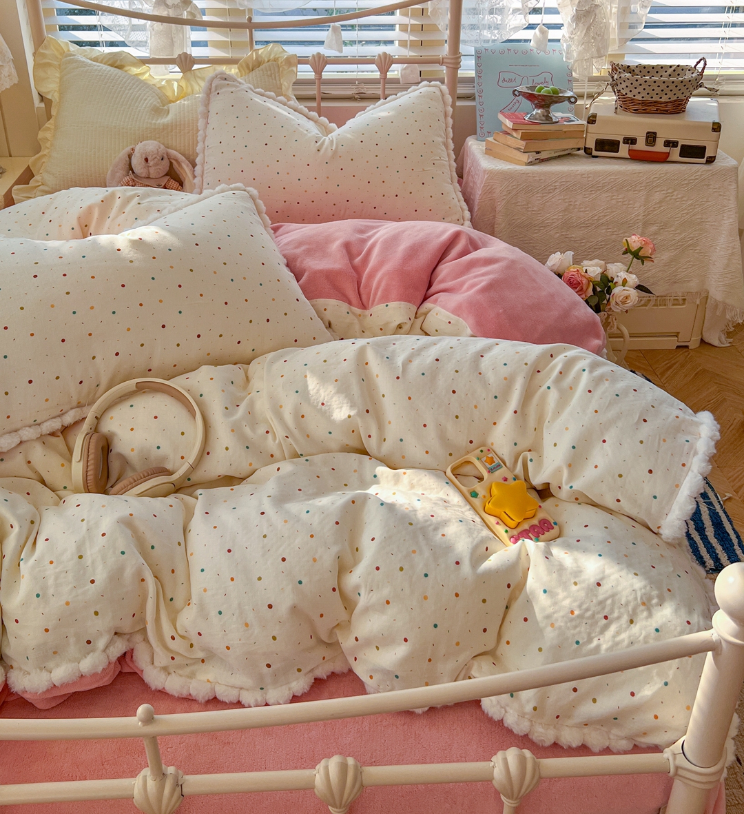 当前位置: 91家纺网 > 商品网购 > 床品套件 > 四件套 > 其它四件套 > (总)金丝鸟家纺 2026新款全棉双层纱加牛奶绒毛球花边四件套