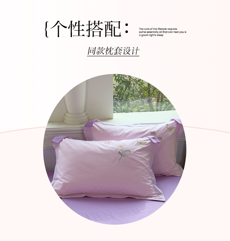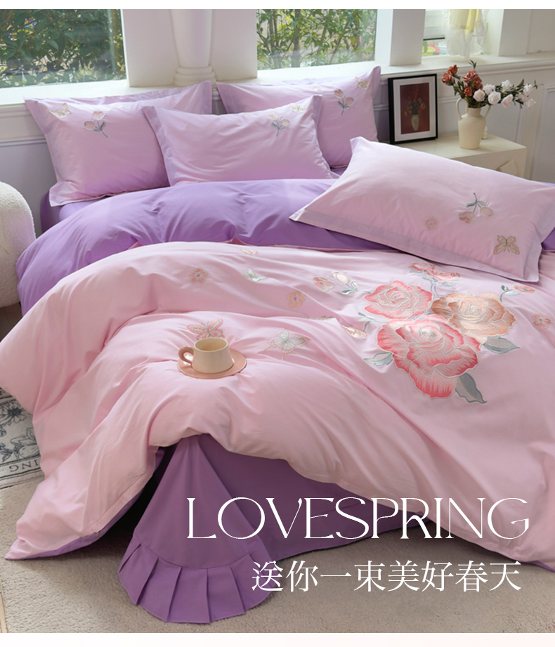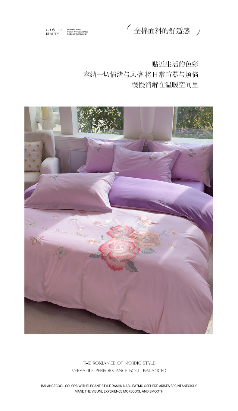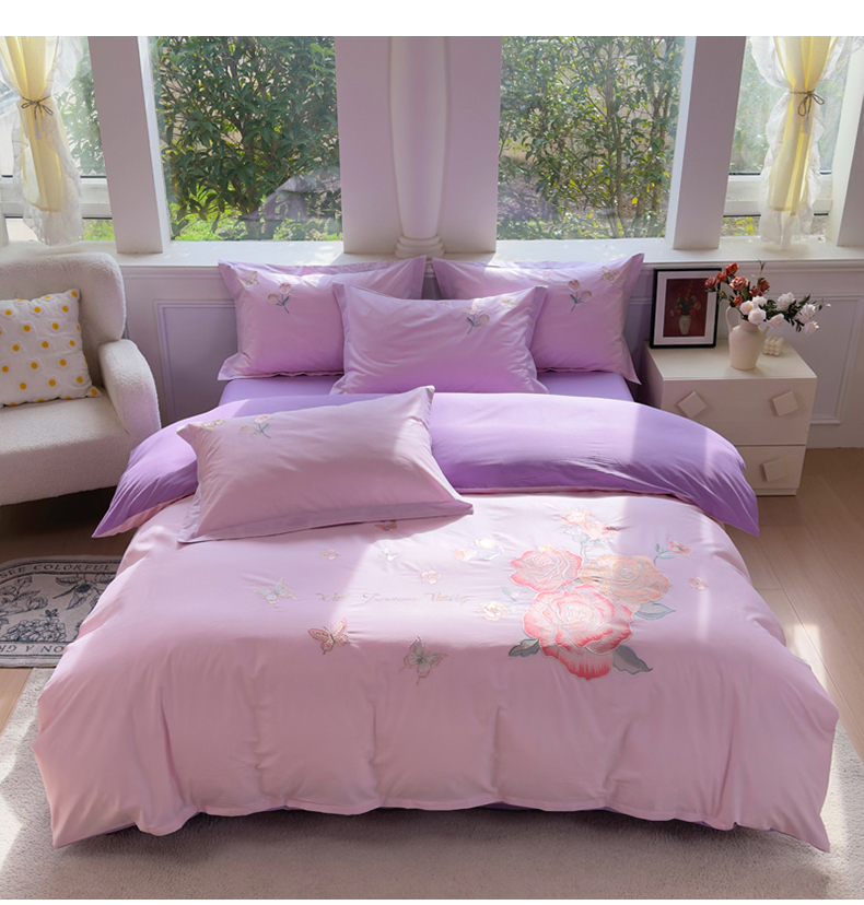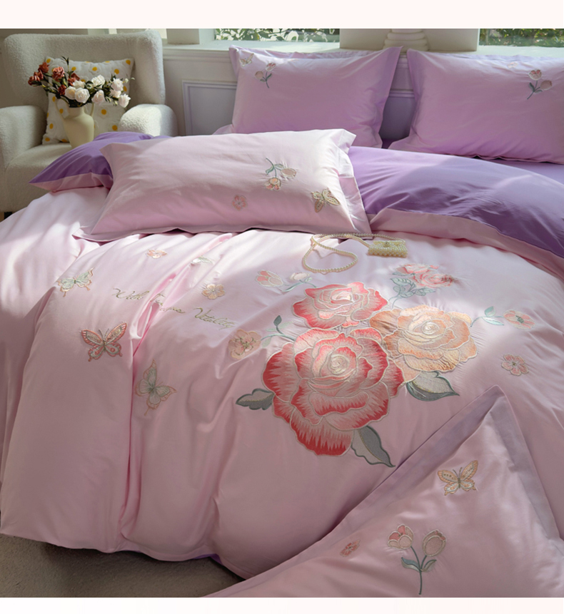 商品名称:铭博家纺 2026新款13372新款100%全棉刺绣工艺款四件套-蝶舞玫瑰系列 蝶舞玫瑰-槿紫