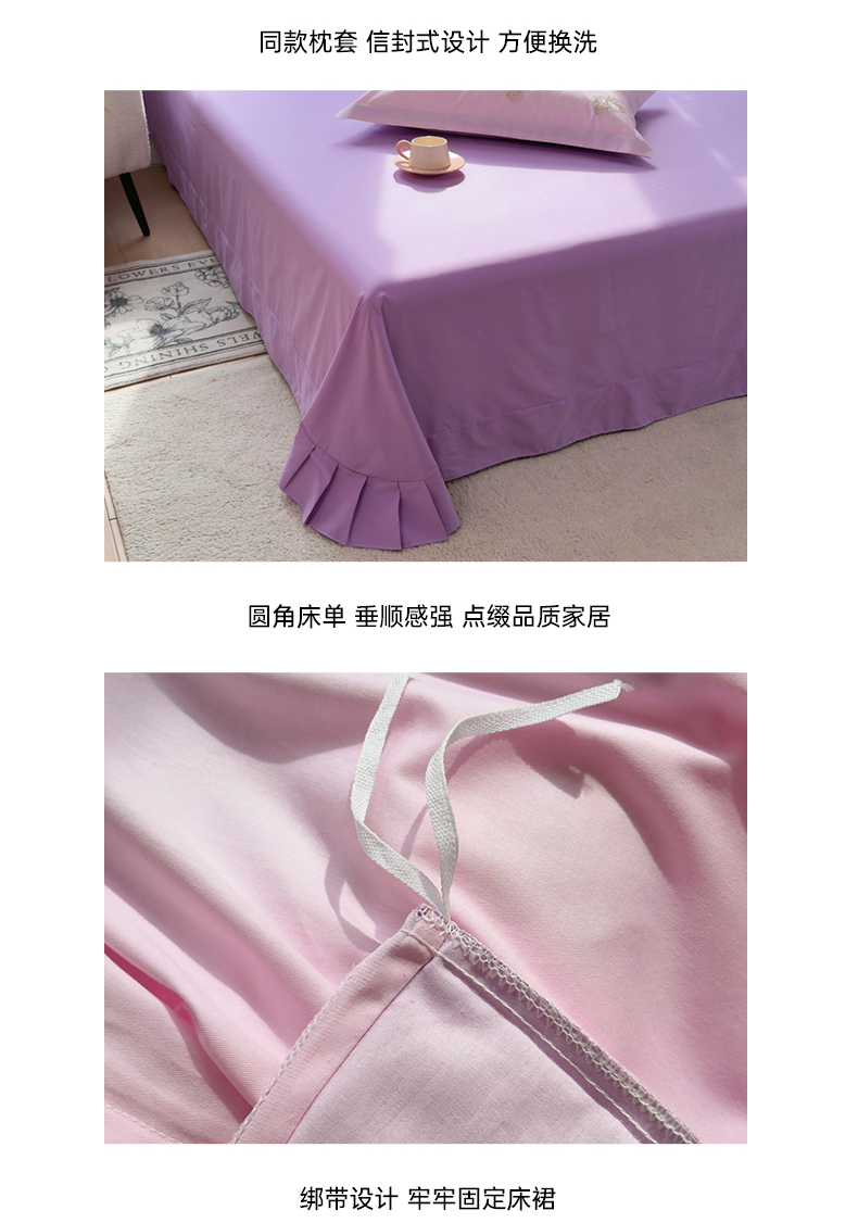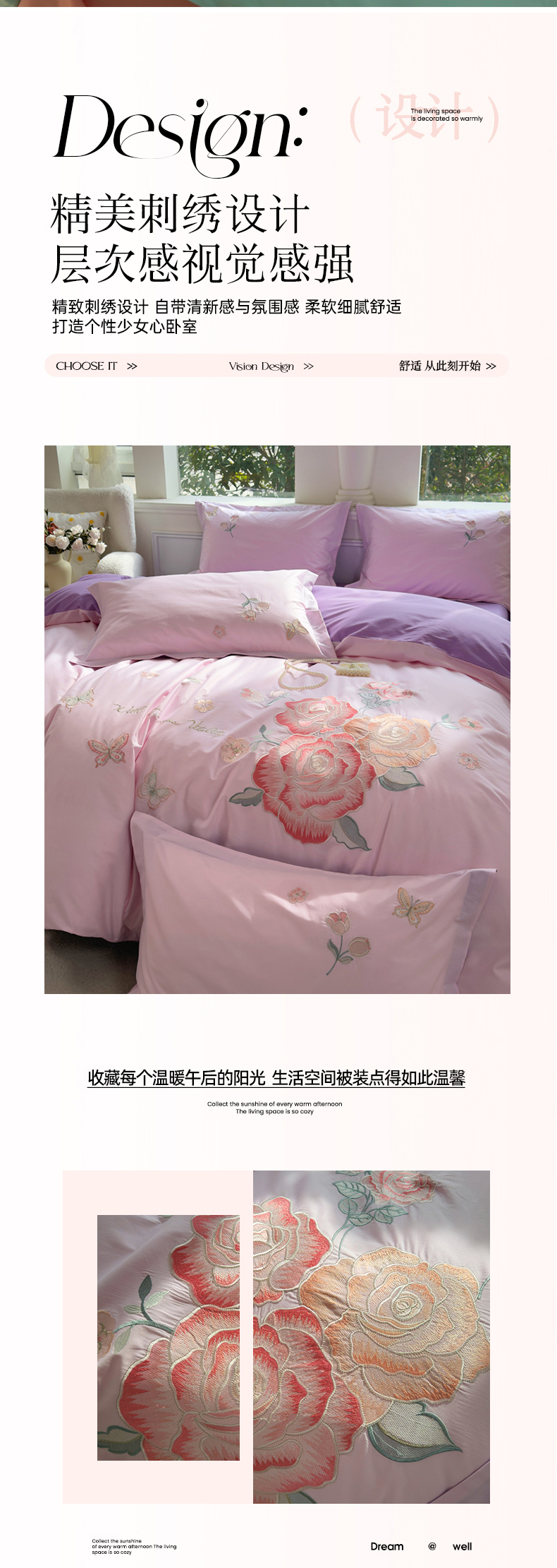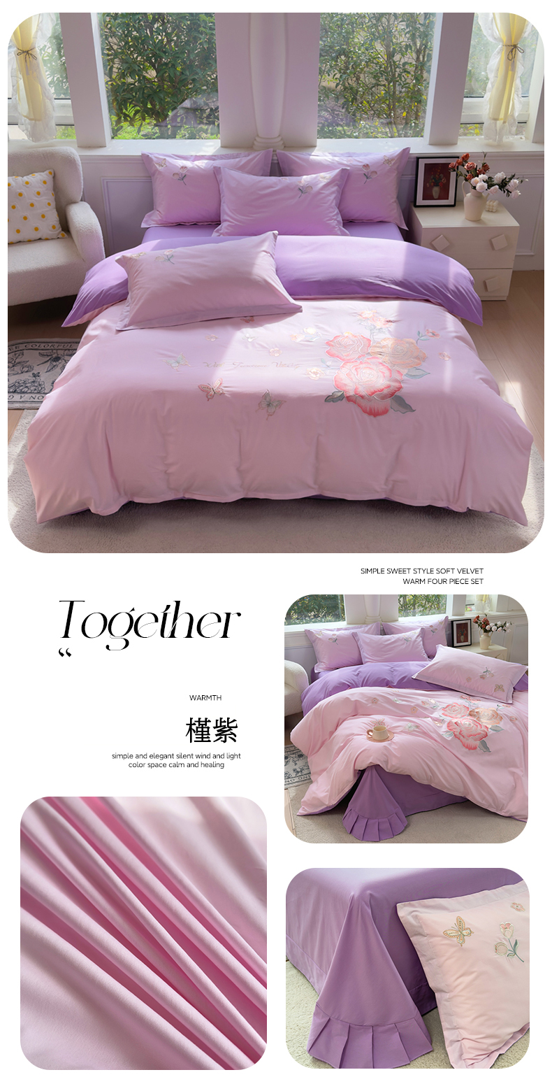 商品名称:铭博家纺 2026新款13372新款100%全棉刺绣工艺款四件套-蝶舞玫瑰系列 蝶舞玫瑰-槿紫