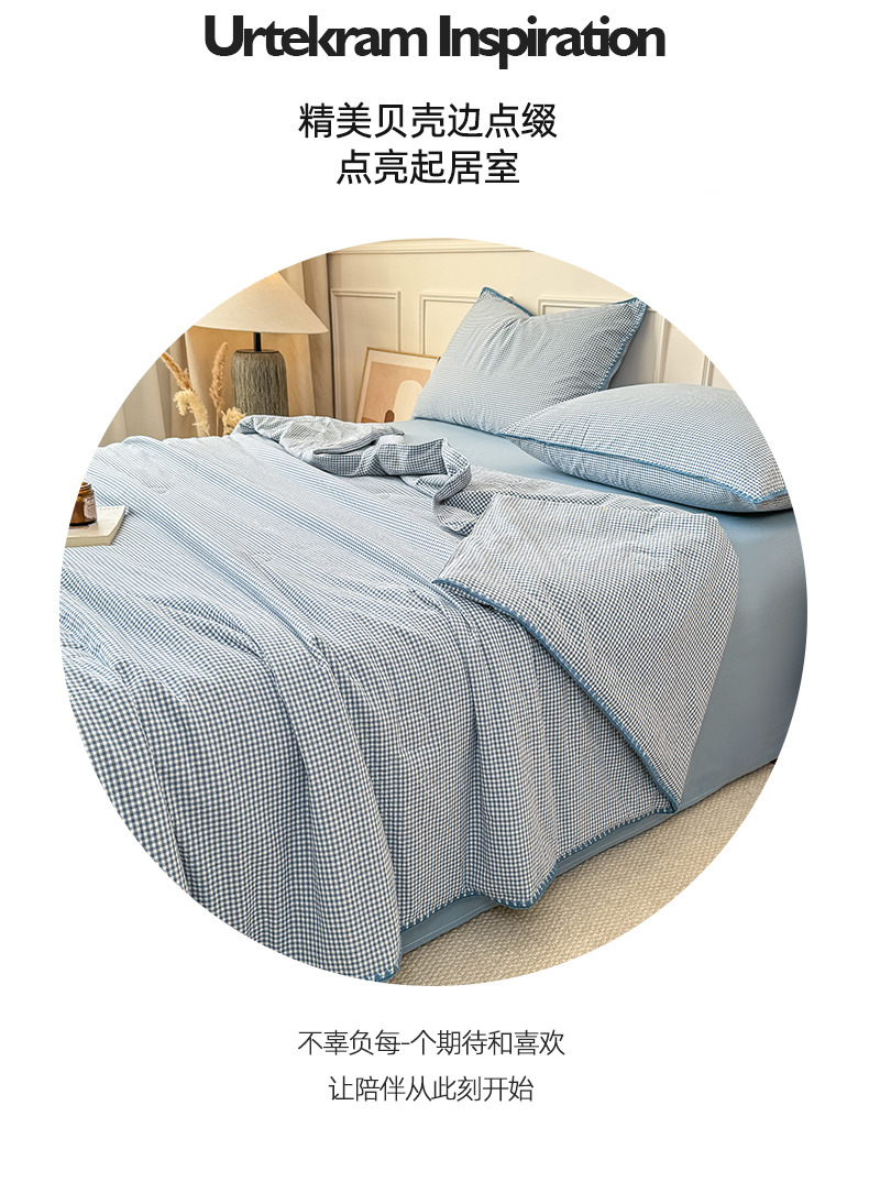 • 91家纺网 家纺一手货源 找家纺 (总)鸣升家纺 2026新款全棉色织水洗棉贝壳边棉花空调被夏凉被夏被四件套,果绿,姜黄,莎粉,天空蓝,月光灰,组合图仅供参考不可下单
