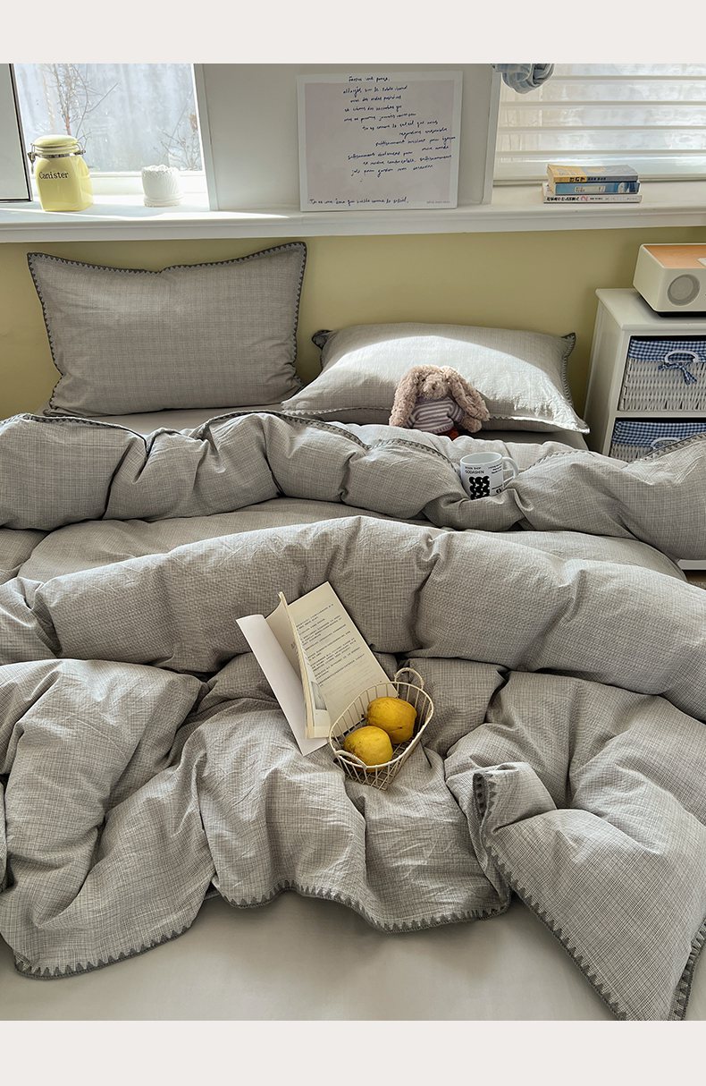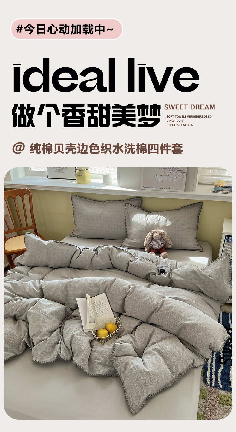 当前位置: 91家纺网 > 商品网购 > 床品套件 > 四件套 > 全棉普通四件套 > XIWEN-希文家纺 2026新款40支全棉色织水洗棉贝壳边四件套 米菲-灰