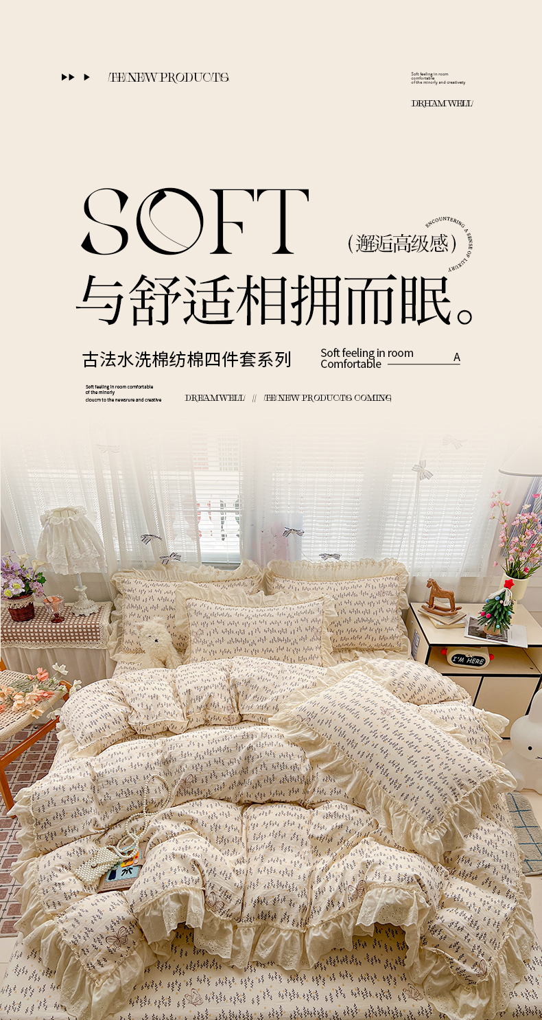 商品名称:(总)韩秀家纺 2026新款古法水洗棉法式蕾丝纯棉大花边仿棉四件套