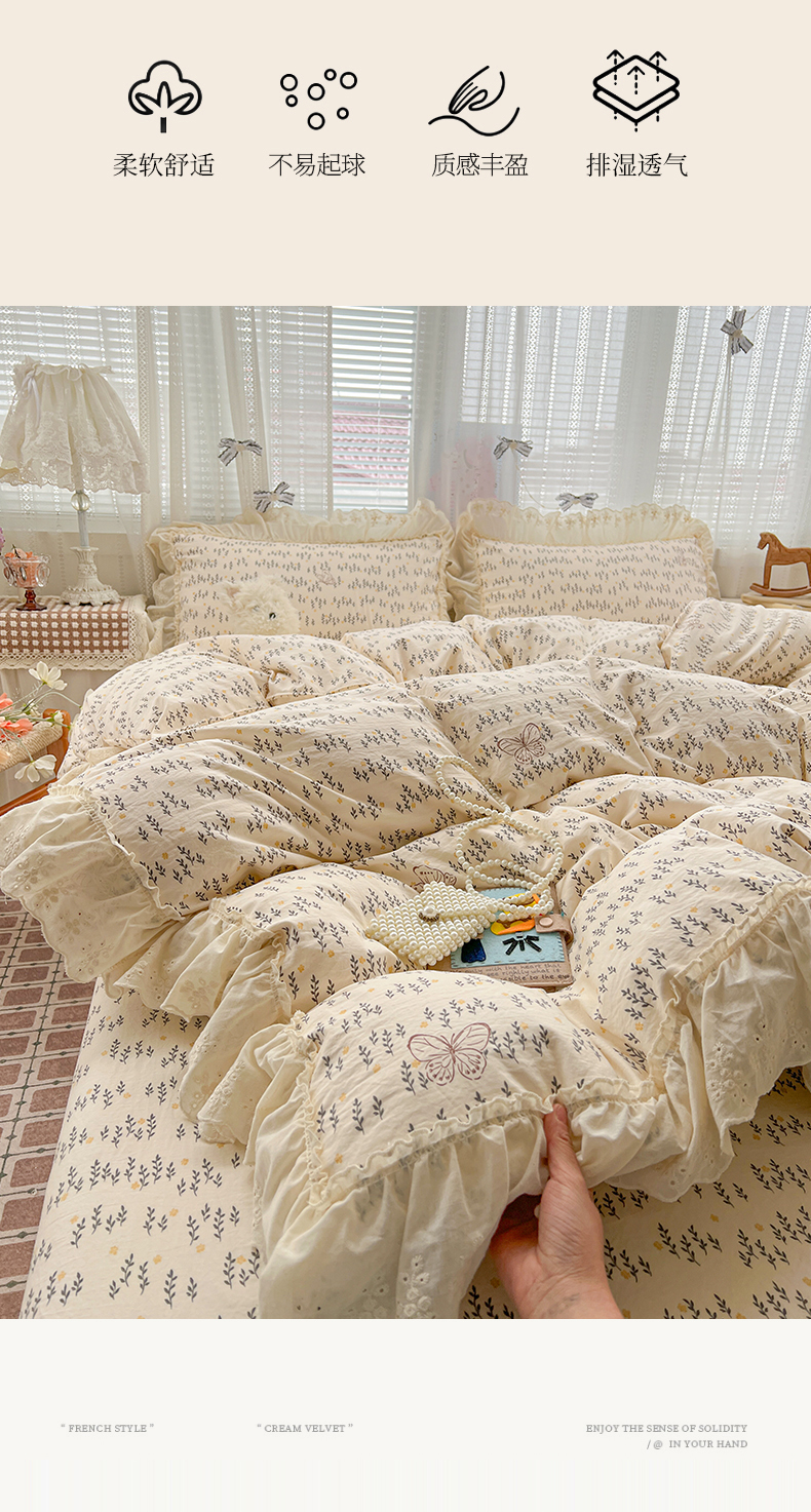(总)韩秀家纺 2026新款A类纺棉四件套全棉花边古法水洗棉法式蕾丝花边四件套,礼赞,蝶纷飞,瑰丽庄园,花街萌宠,绿荫,怦然心动,青柠薄荷,旋转木马