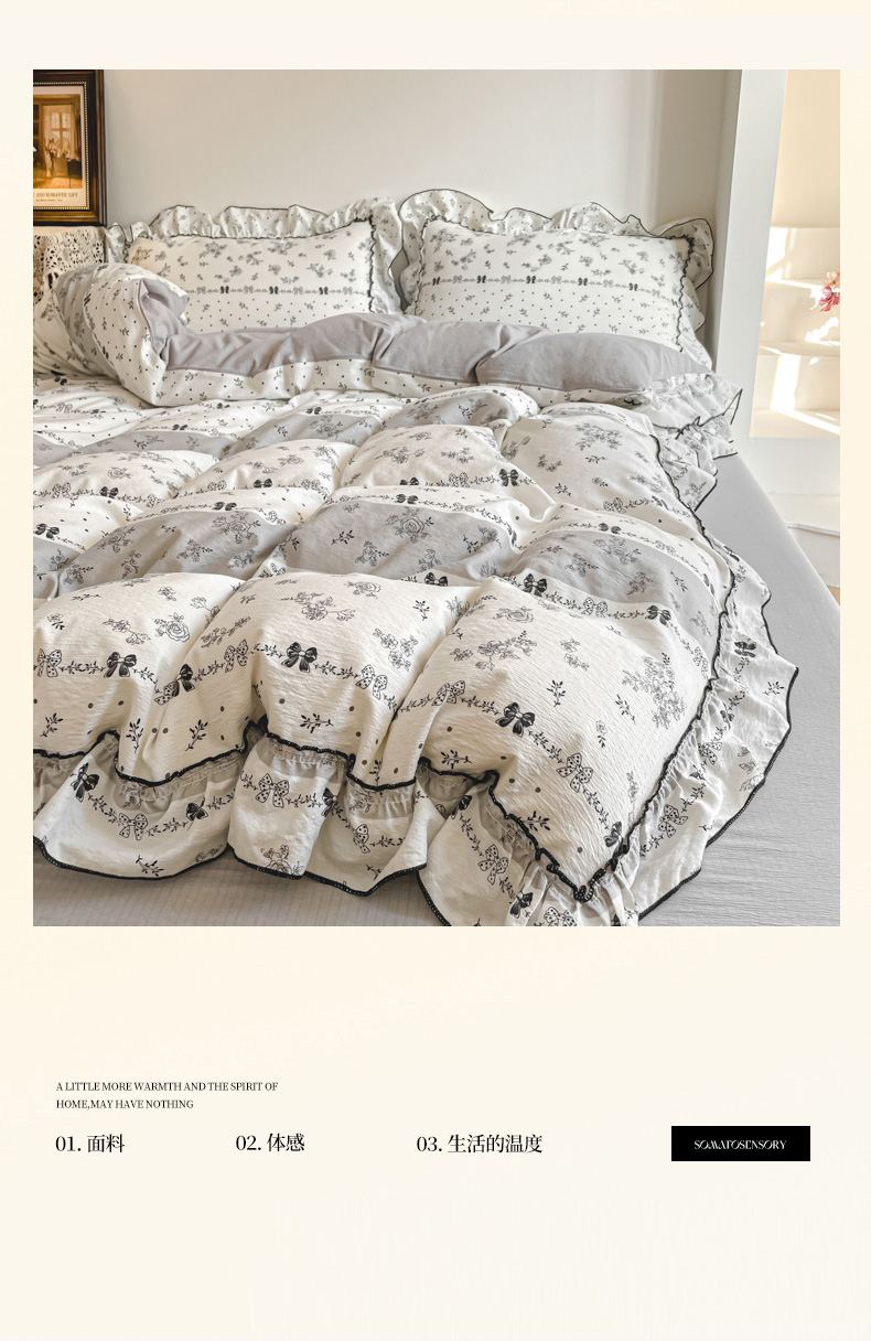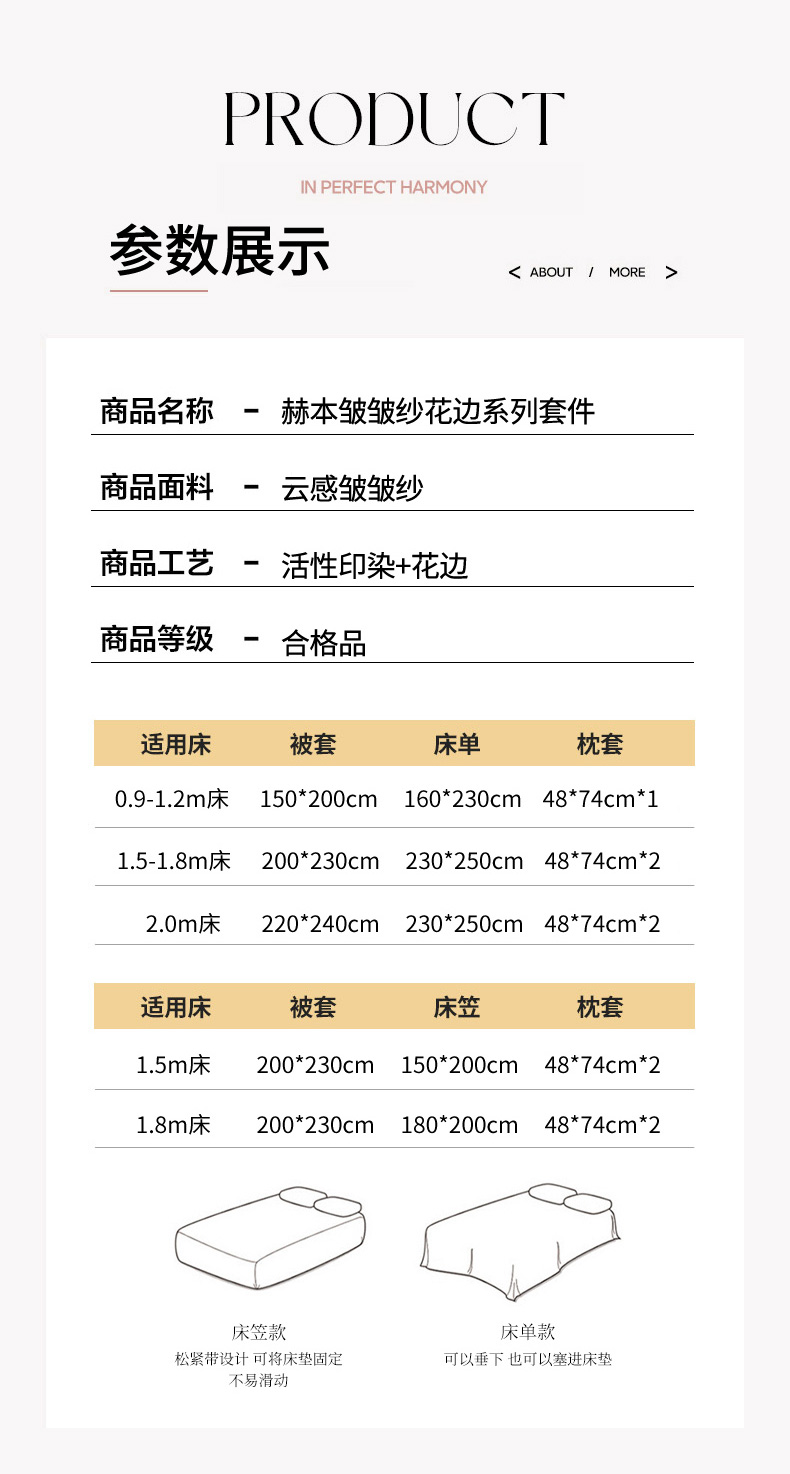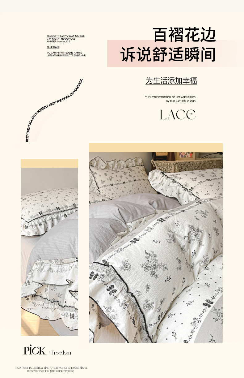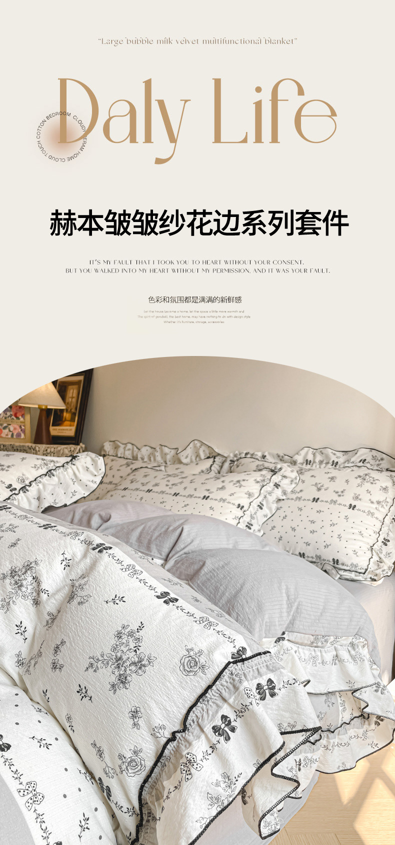 当前位置: 91家纺网 > 商品网购 > 床品套件 > 四件套 > 化纤普通四件套 > 柒月家居 2026新款法式赫本皱皱纱花边四件套 挽花