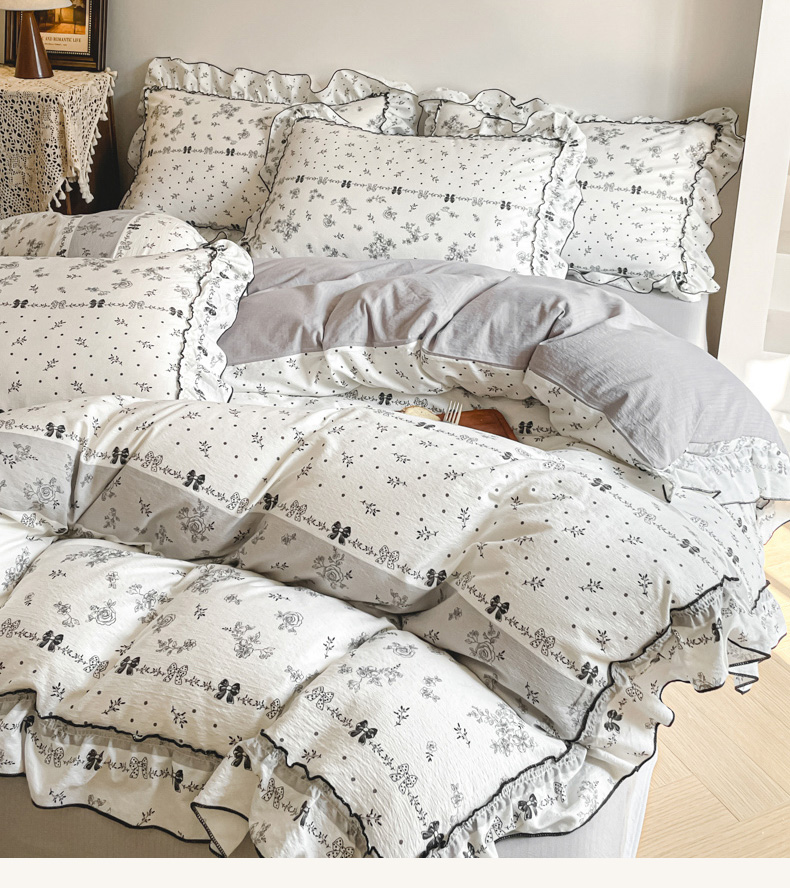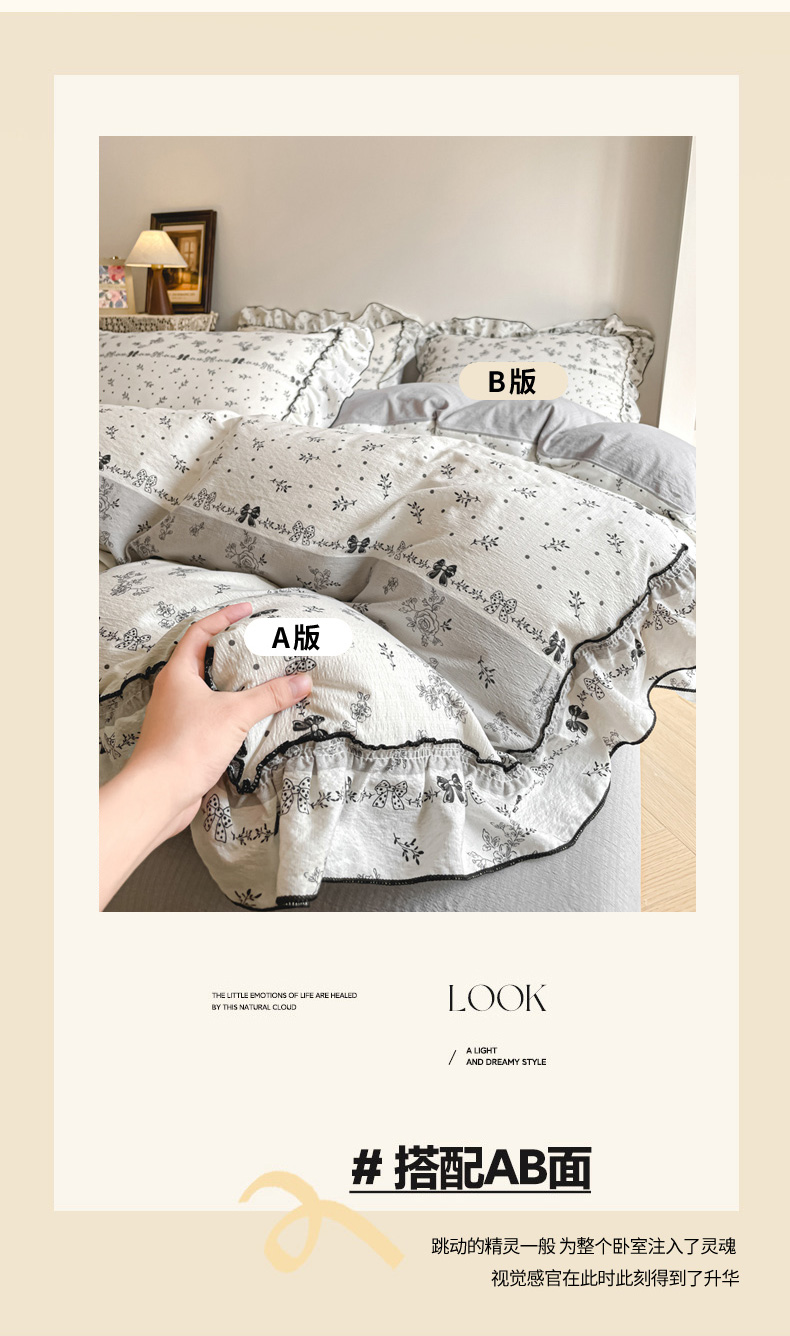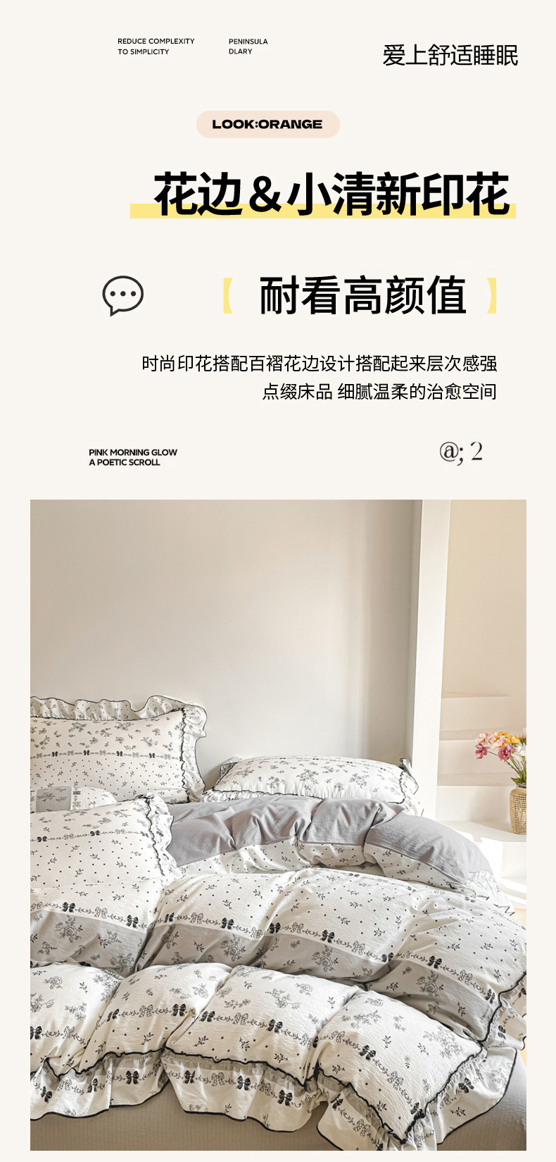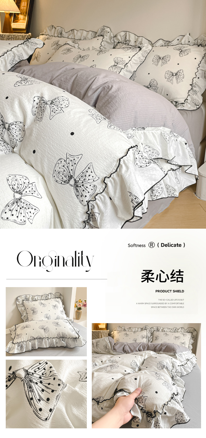 当前位置: 91家纺网 > 商品网购 > 床品套件 > 四件套 > 化纤普通四件套 > 柒月家居 2026新款法式赫本皱皱纱花边四件套 挽花