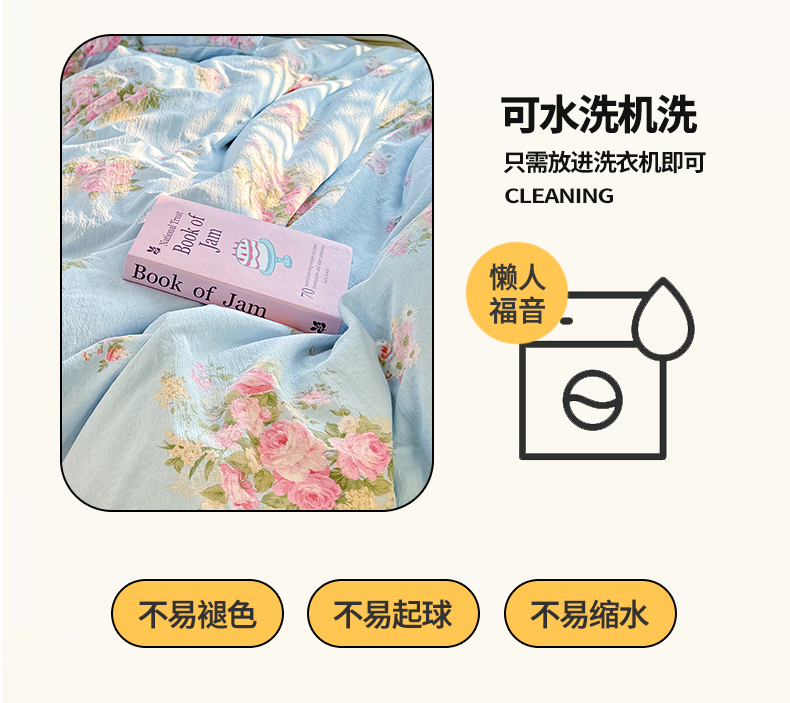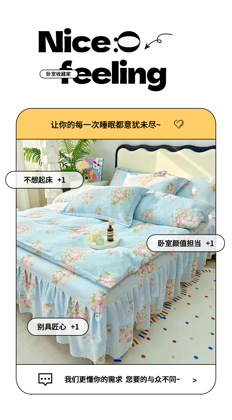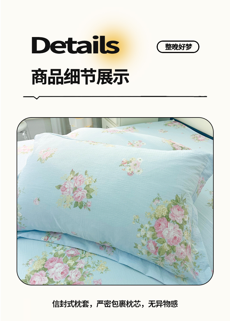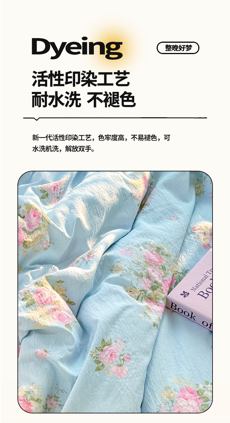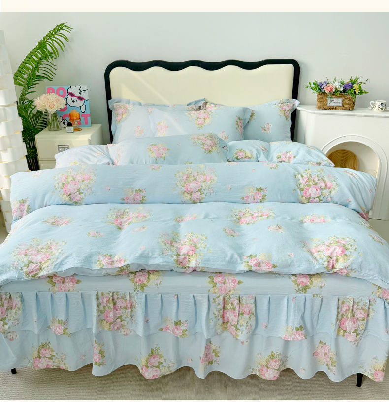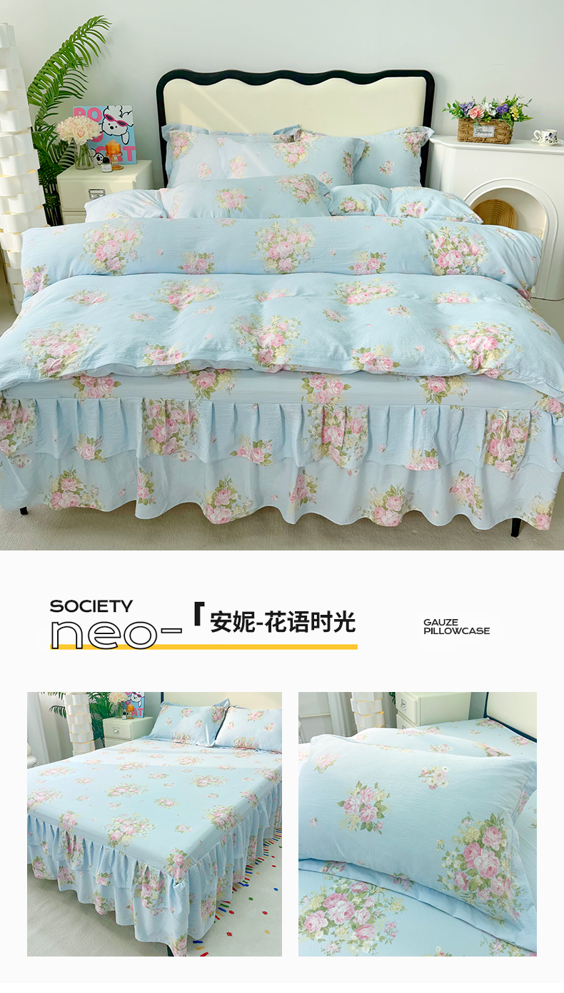 (总)九诺家纺 2025新款活性印花ins风小碎花软糯皱皱棉床盖款四件套双花边款被套,繁花似锦,心相印,花仙子,梦露,爱丽丝-蓝,薄荷之约,流金豹纹