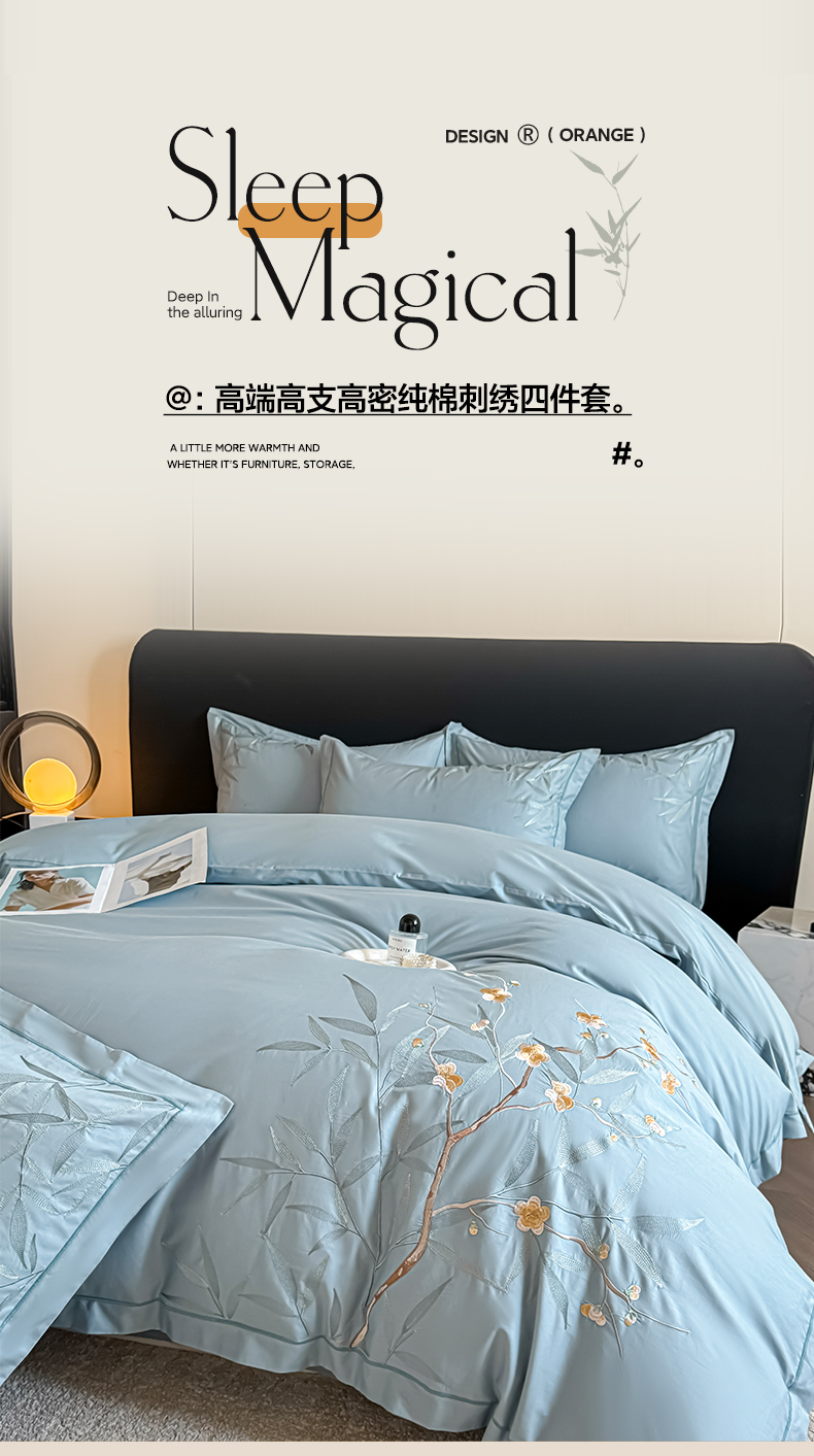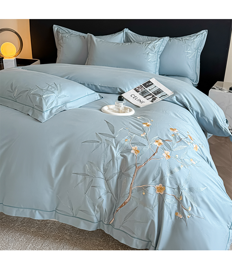 湘雪家居 2026新款纯棉全棉长绒棉刺绣绣花高端礼盒四件套-竹韵系列 竹韵-天青