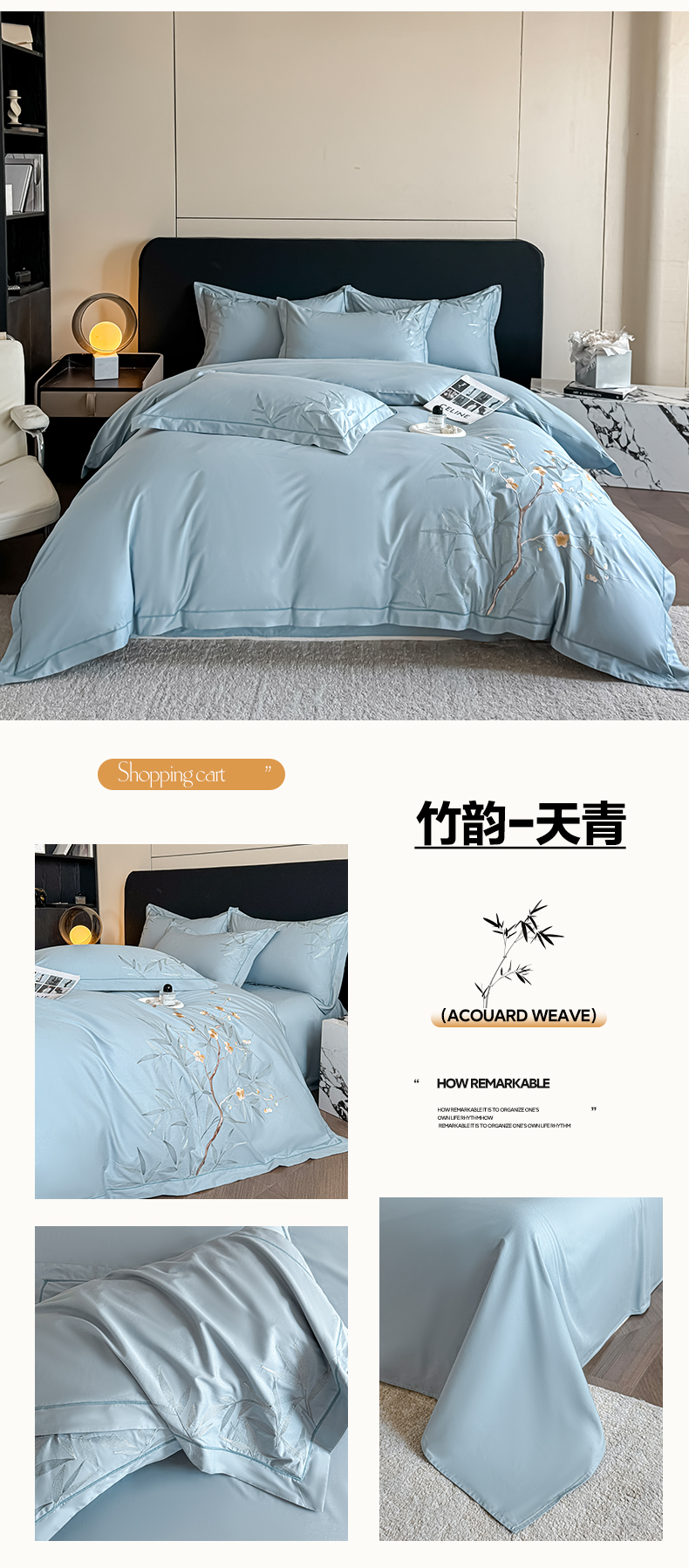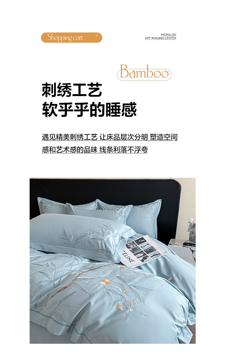 商品名称:湘雪家居 2026新款纯棉全棉长绒棉刺绣绣花高端礼盒四件套-竹韵系列 竹韵-天青