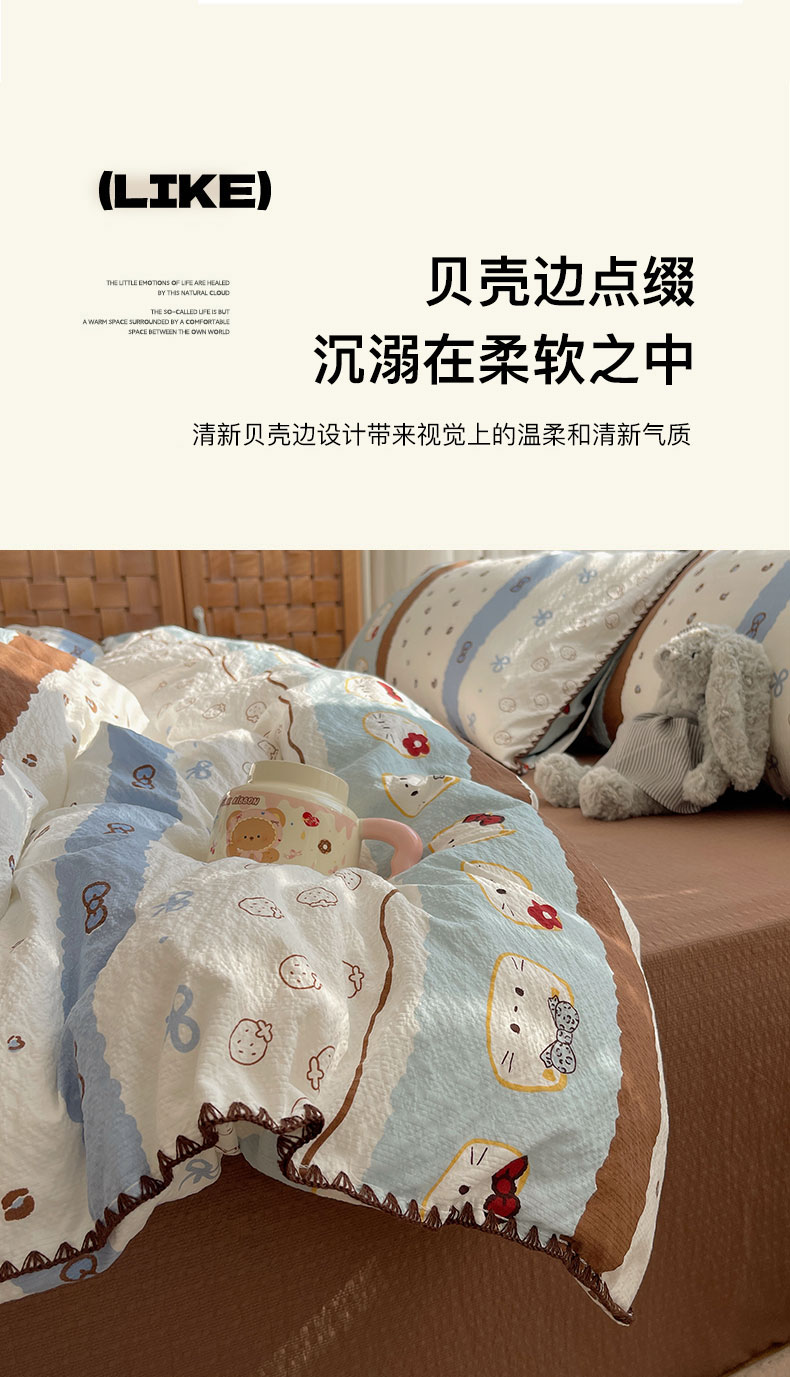 商品名称:(总)桃心家居 2026新款A类费尔岛可爱卡通贝壳边三角针工艺双层纱泡芙棉泡芙纱系列四件套