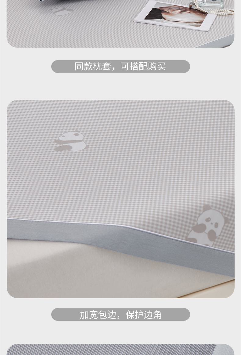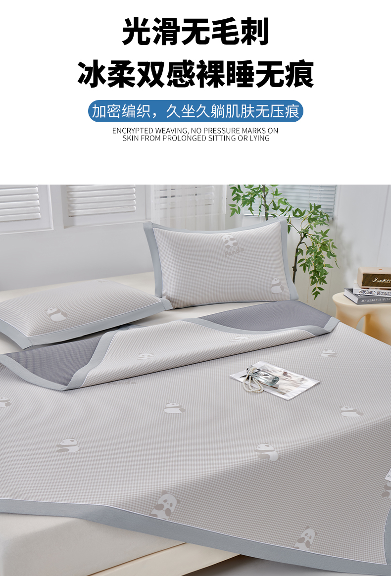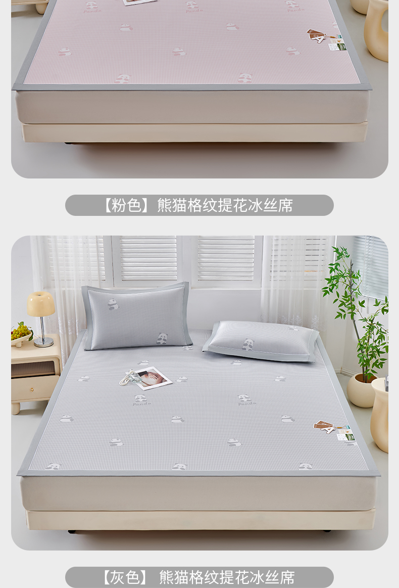 (总)小牛席业 2026新款熊猫格纹提花冰丝席席子凉席-(床笠款)凉席藤席冰藤席冰丝席凉感空调席,粉色,灰色,蓝色,抹茶,香槟