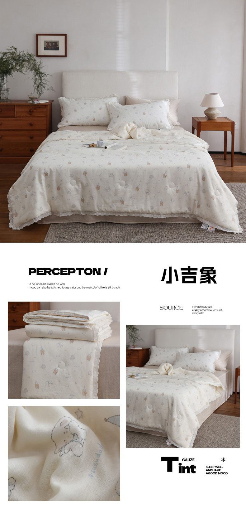 (总)万盛家纺 2026新款全棉双层纱花边印花夏被空调被夏凉被,动物城,简悦,铃兰,曼叶,莫里,浅陌,俏皮小象,素颜,兔子欢喜,小吉象,摇摇木马,月落昙华