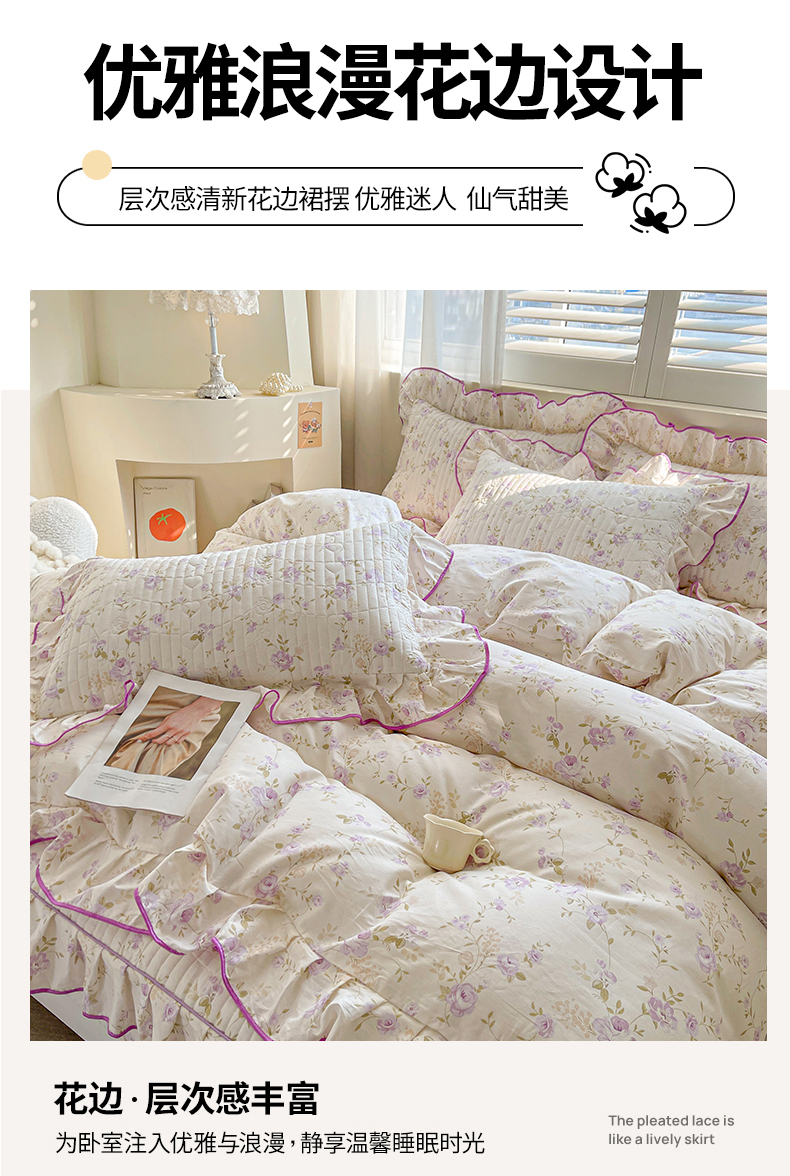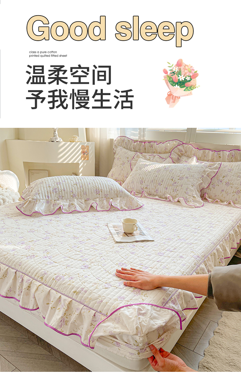 (总)宜凡家纺 2026新款全棉印花夹棉花边床笠三件套,海棠之恋,镜花映月,水苏栀清,玉容昭婉