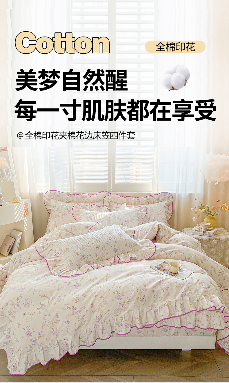 (总)宜凡家纺 2026新款全棉印花夹棉花边床笠四件套