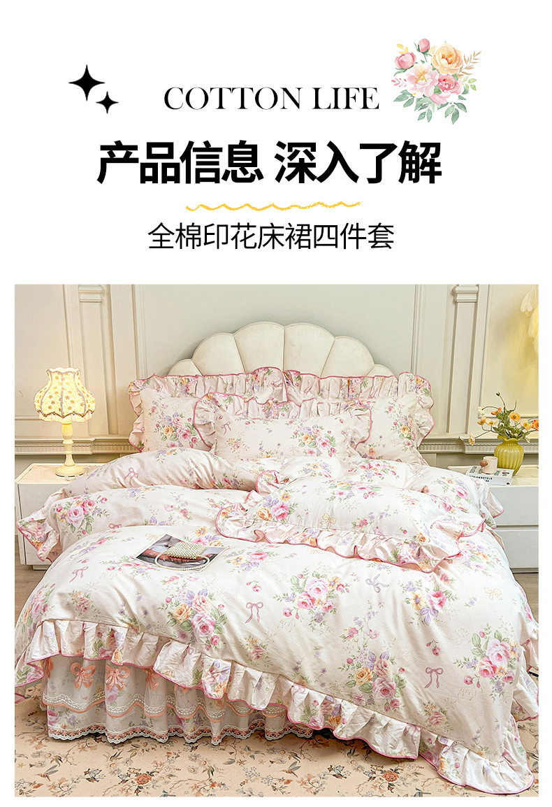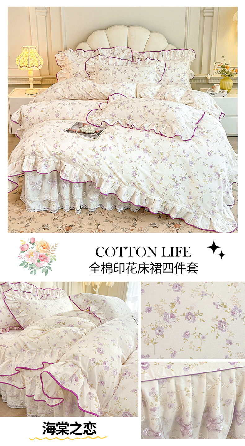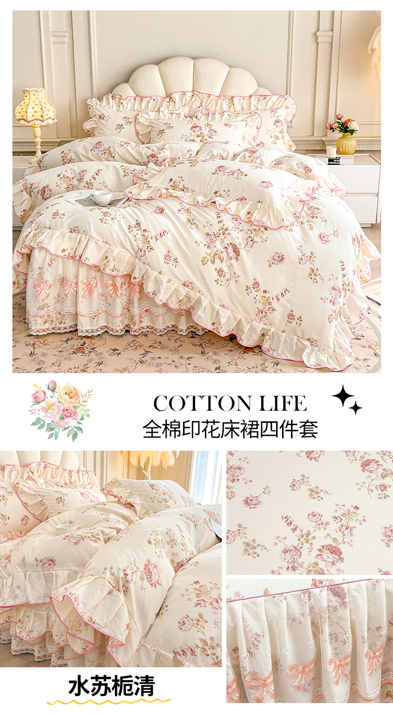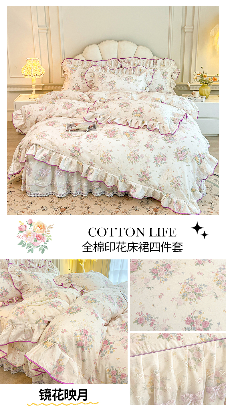 当前位置: 91家纺网 > 商品网购 > 床品套件 > 四件套 > 全棉普通四件套 > 宜凡家纺 2026新款全棉公主风单层床裙四件套 玉容昭婉