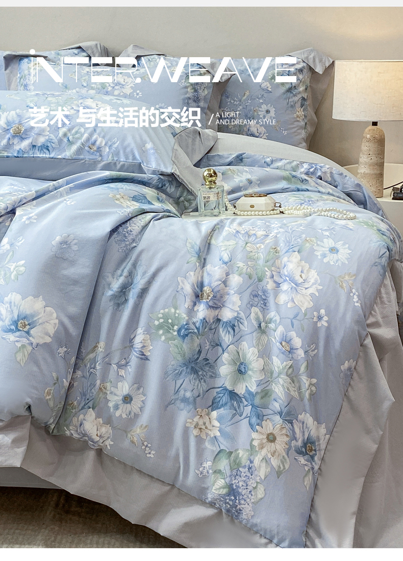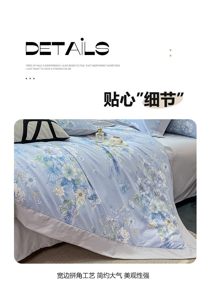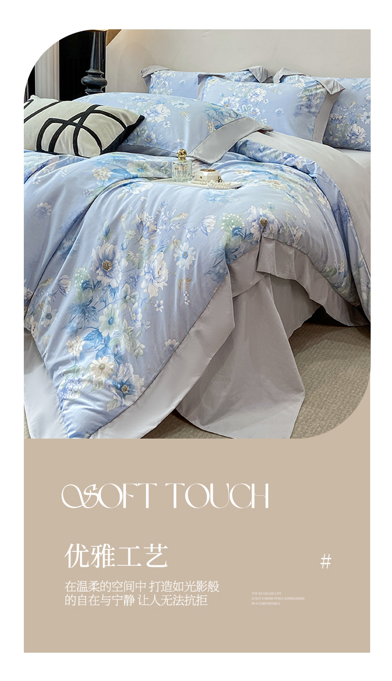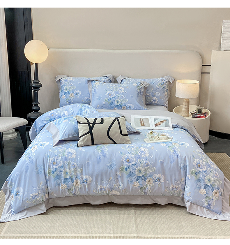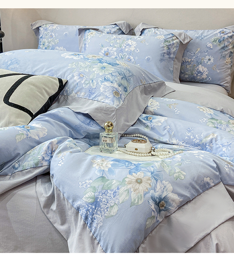 当前位置: 91家纺网 > 商品网购 > 床品套件 > 四件套 > 其它四件套 > 慕木家纺 2026新款A类印花拼角工艺慕斯棉四件套系列(抽空压缩可供跨境)提供买家秀 蓝庭叙+灰