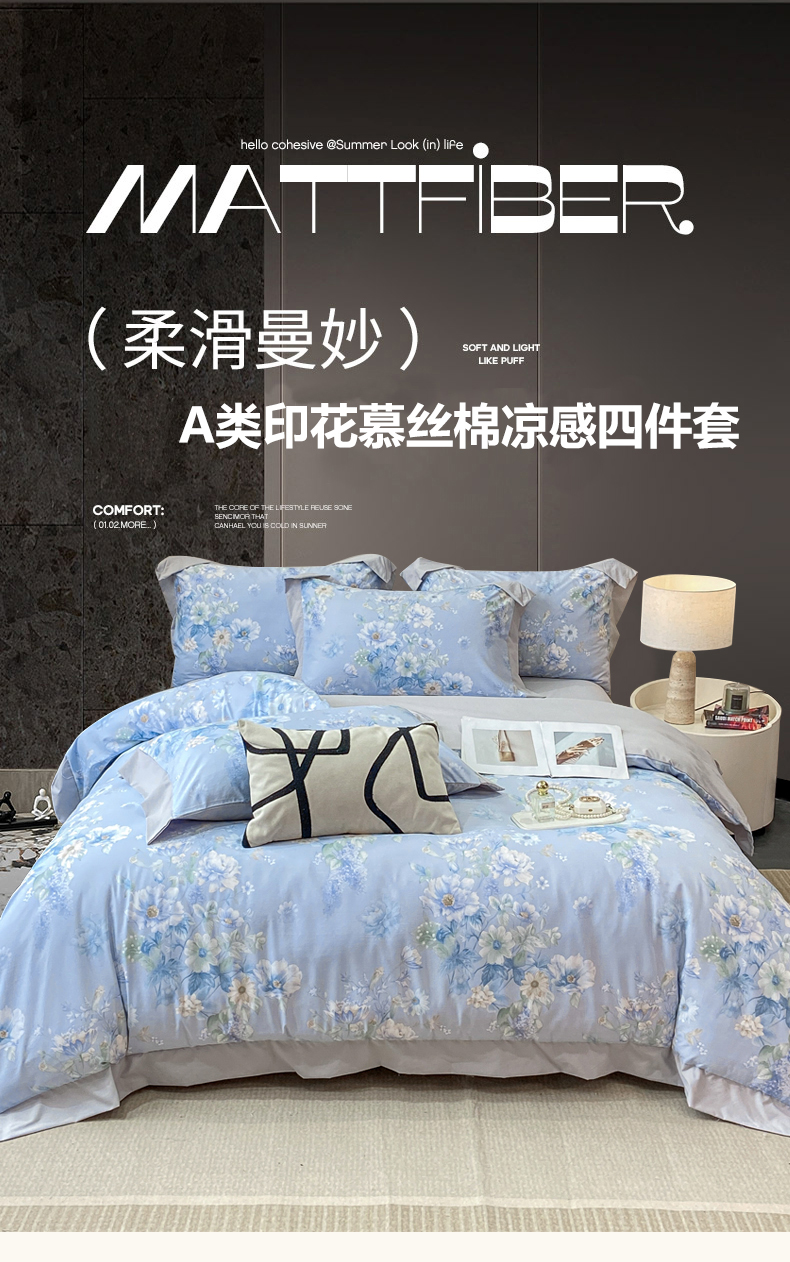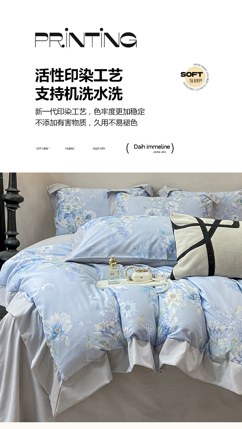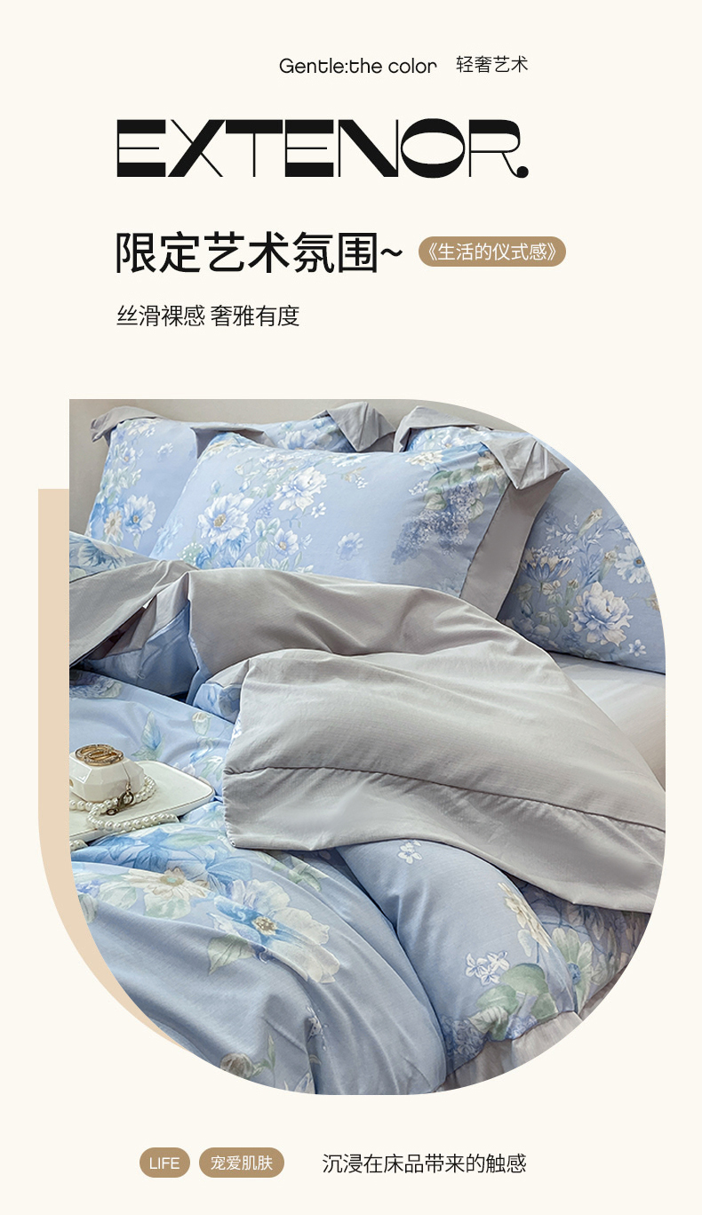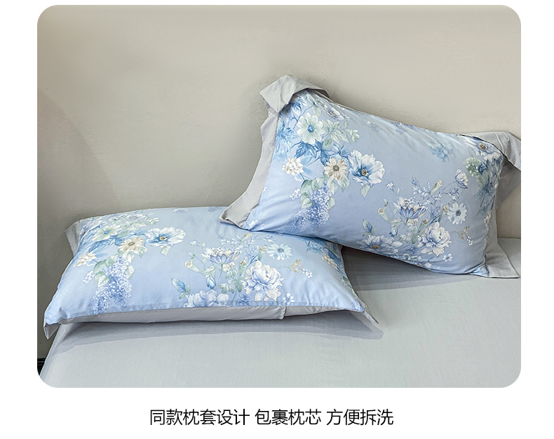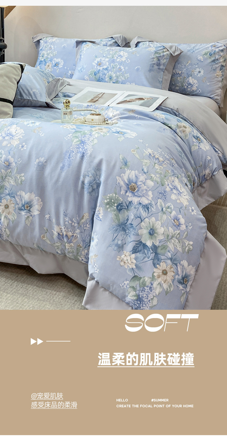 当前位置: 91家纺网 > 商品网购 > 床品套件 > 四件套 > 其它四件套 > 慕木家纺 2026新款A类印花拼角工艺慕斯棉四件套系列(抽空压缩可供跨境)提供买家秀 蓝庭叙+灰
