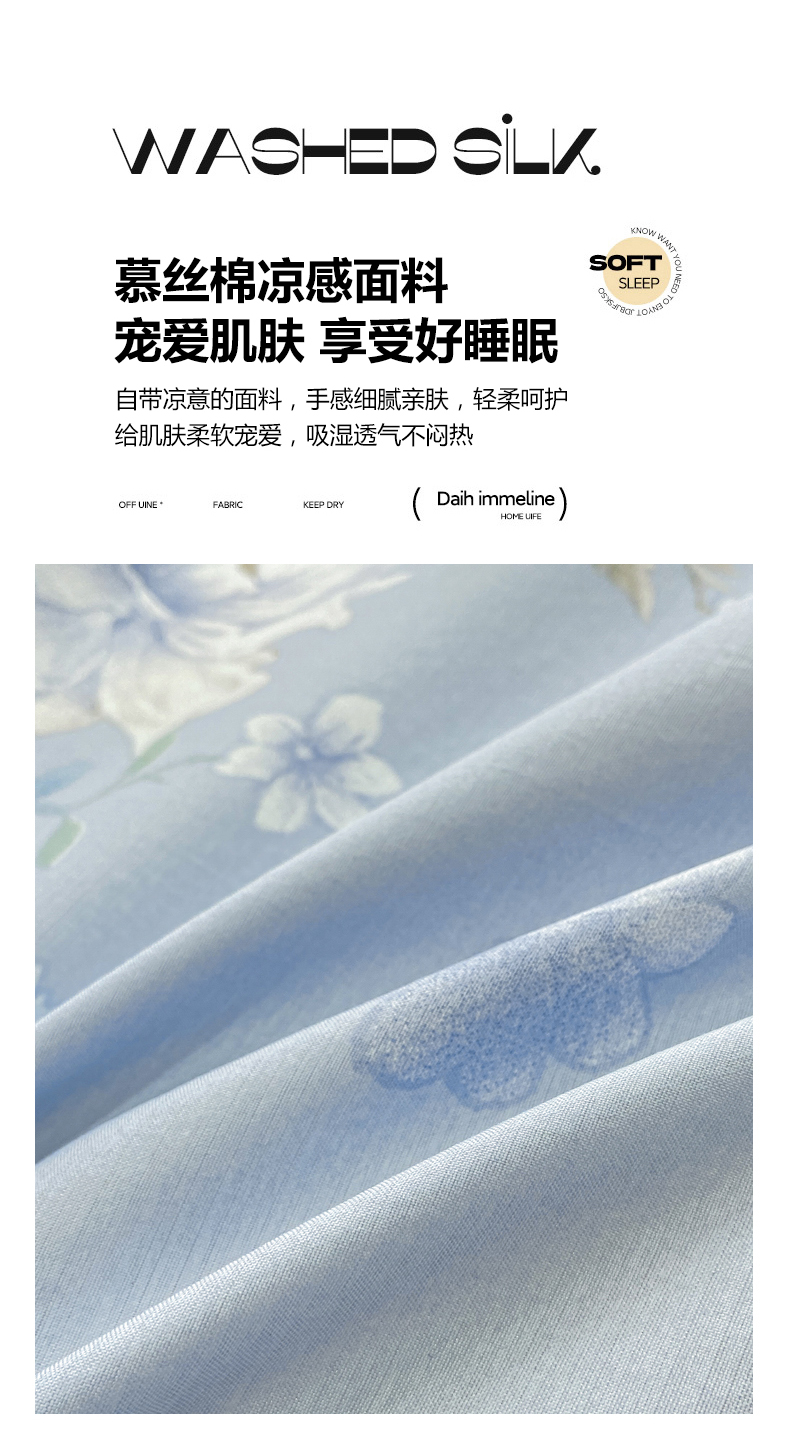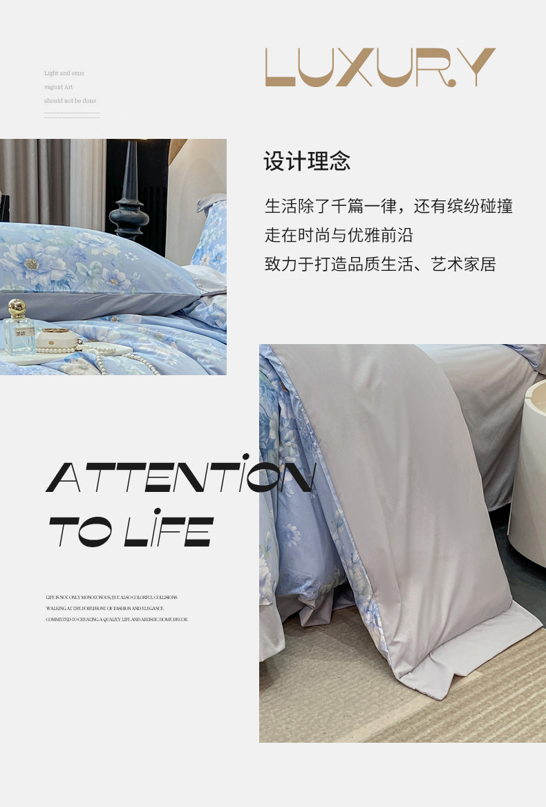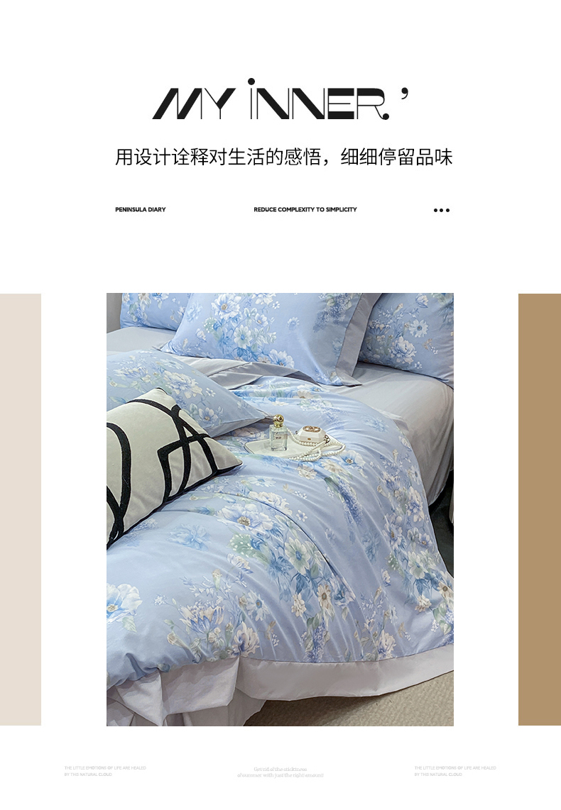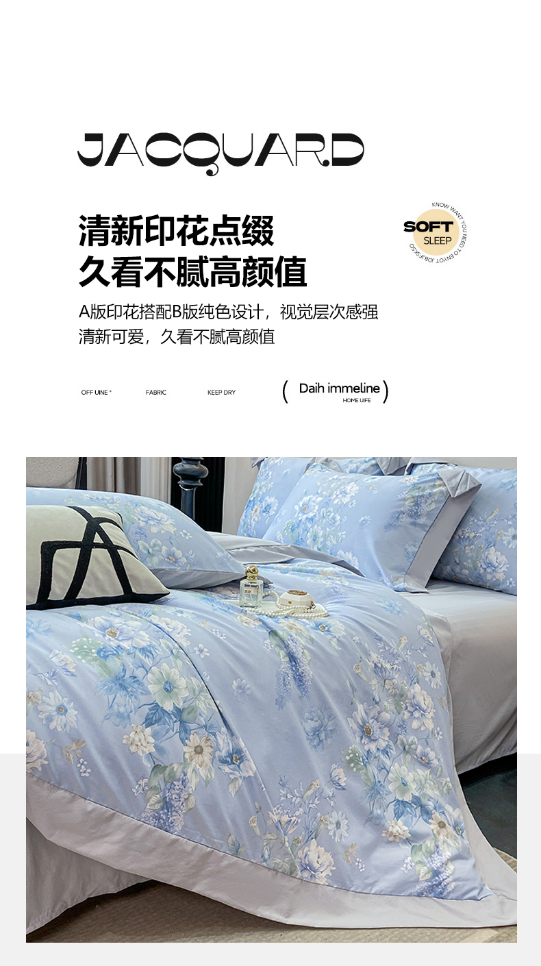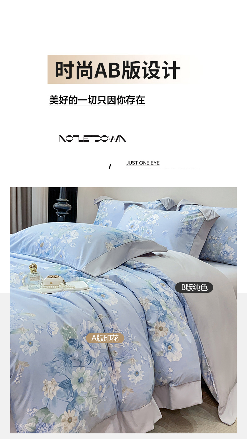 当前位置: 91家纺网 > 商品网购 > 床品套件 > 四件套 > 其它四件套 > 慕木家纺 2026新款A类印花拼角工艺慕斯棉四件套系列(抽空压缩可供跨境)提供买家秀 蓝庭叙+灰