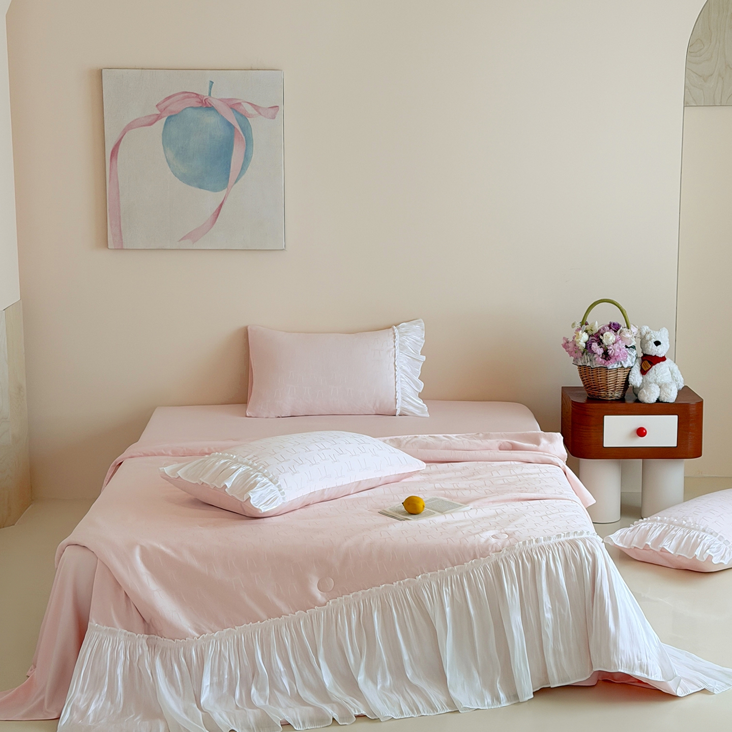 (总)山茶家居-原创设计(原山茶家纺) 2025新款A类水洗棉印花花边四件套-甜梦,甜梦-白色,甜梦-粉色,甜梦-米色