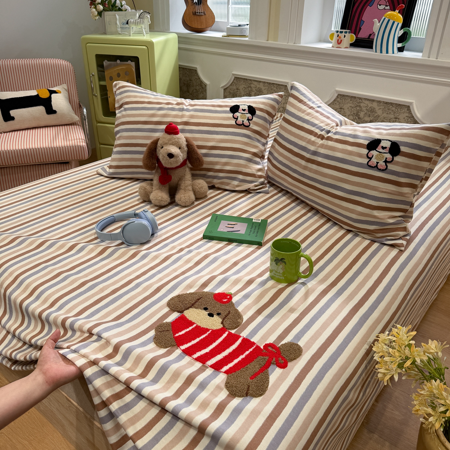 (总)觅糖家纺 2024新款牛奶绒印花小版毛巾绣四件套,爱心蝴蝶结,格子企鹅,马戏团,奶酪派对,扭扭蛋仔,苹果小猫,许愿星,黑白兔兔,咖啡猫,可爱熊粉,快乐小熊蓝,绿色大眼怪,奶牛小狗
