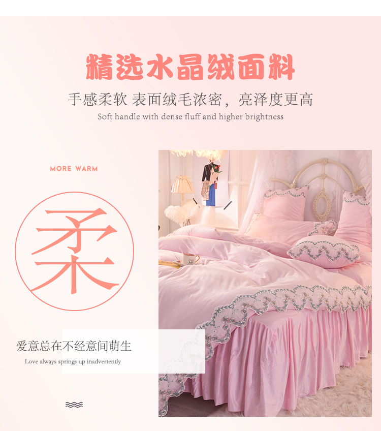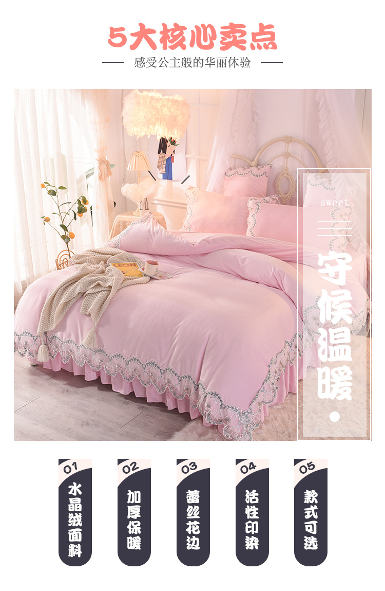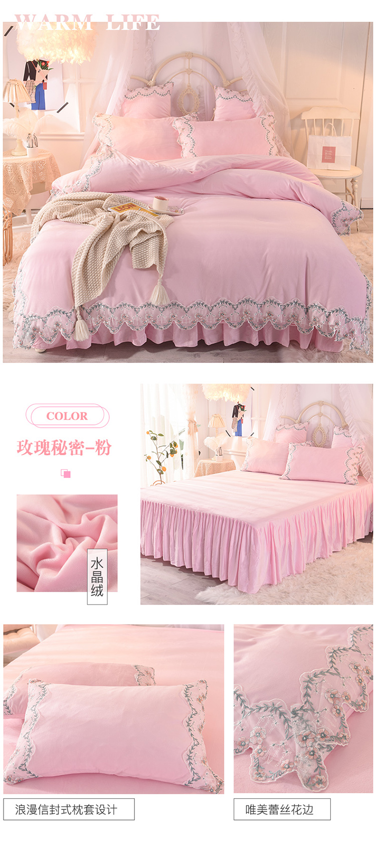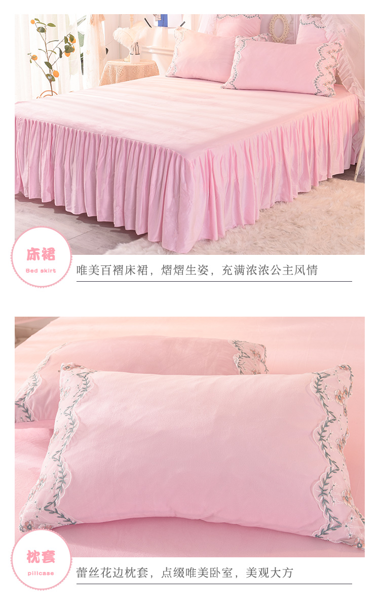 绒世界 秋冬绒款花边款和毛巾绣四件套床裙款 花边款粉色