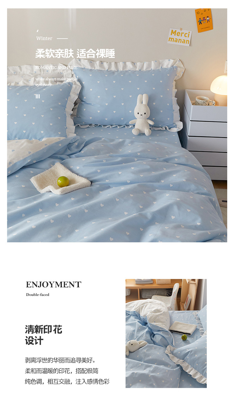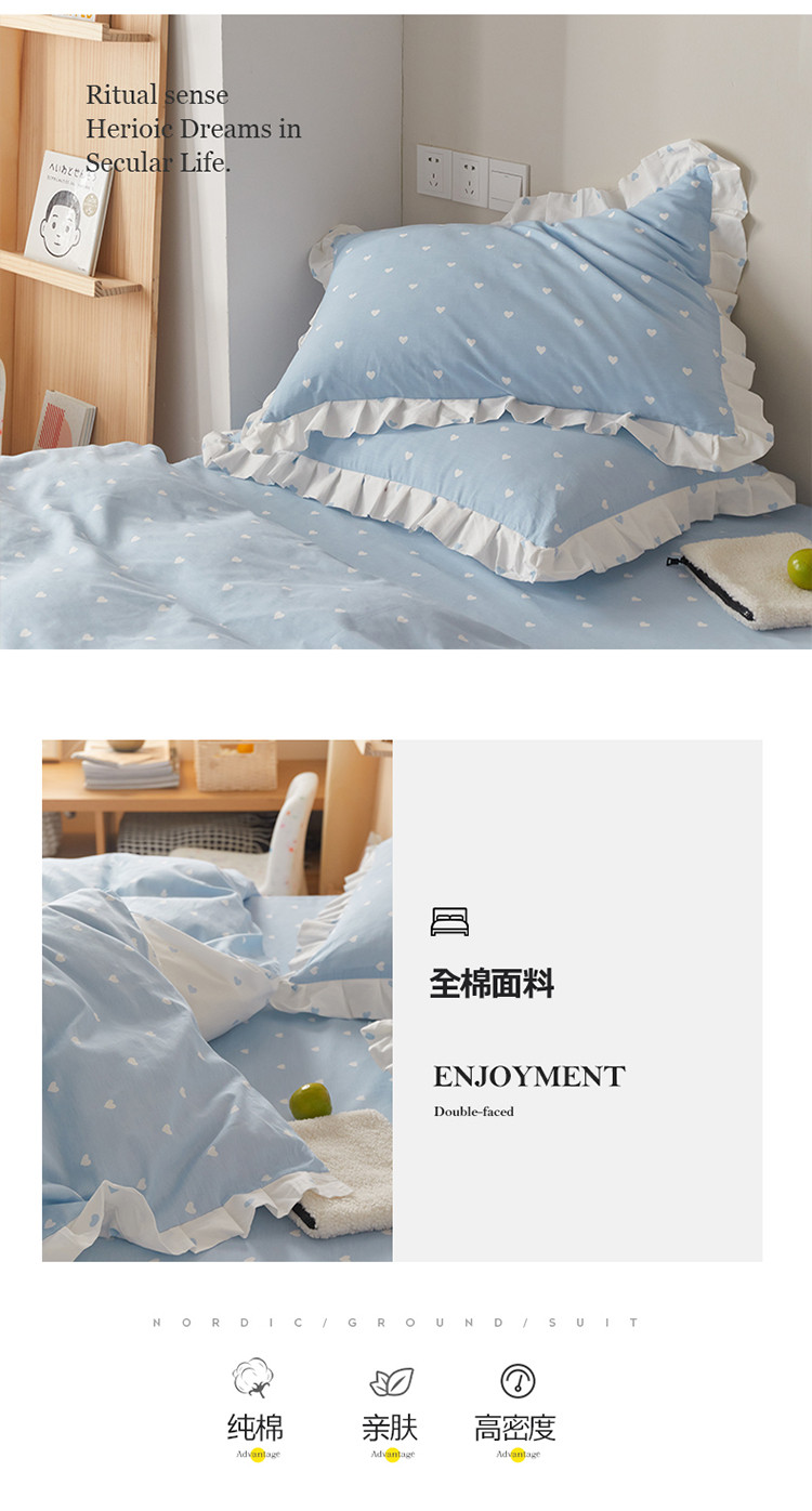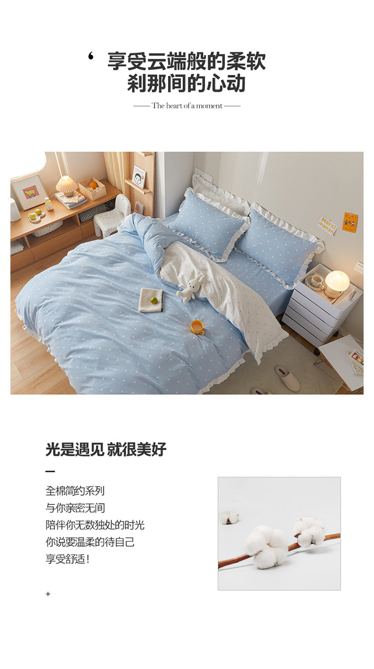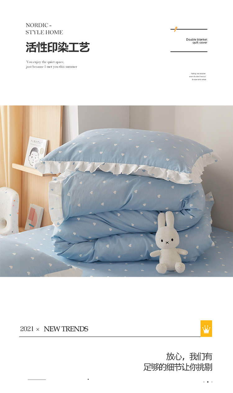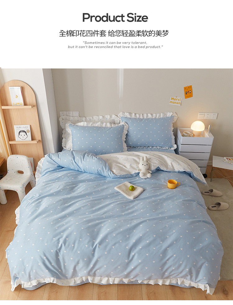 商品名称:沐棉家居2022年新款全棉印花13372荷叶边系列四件套直播爆款 爱心-蓝