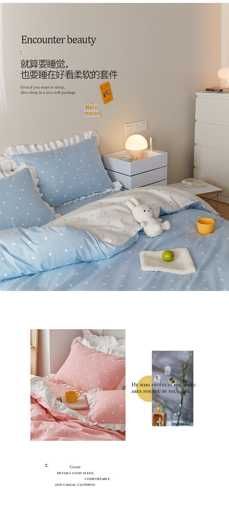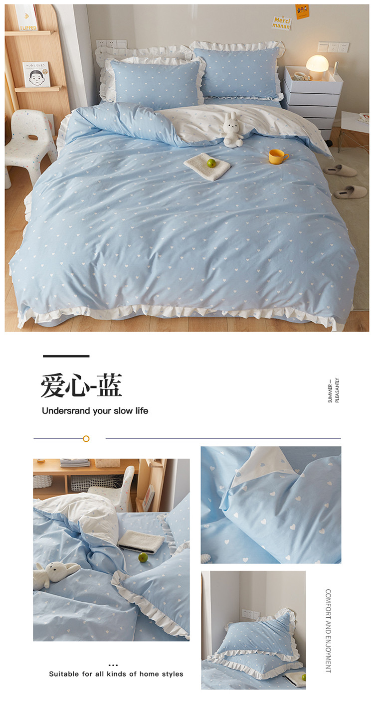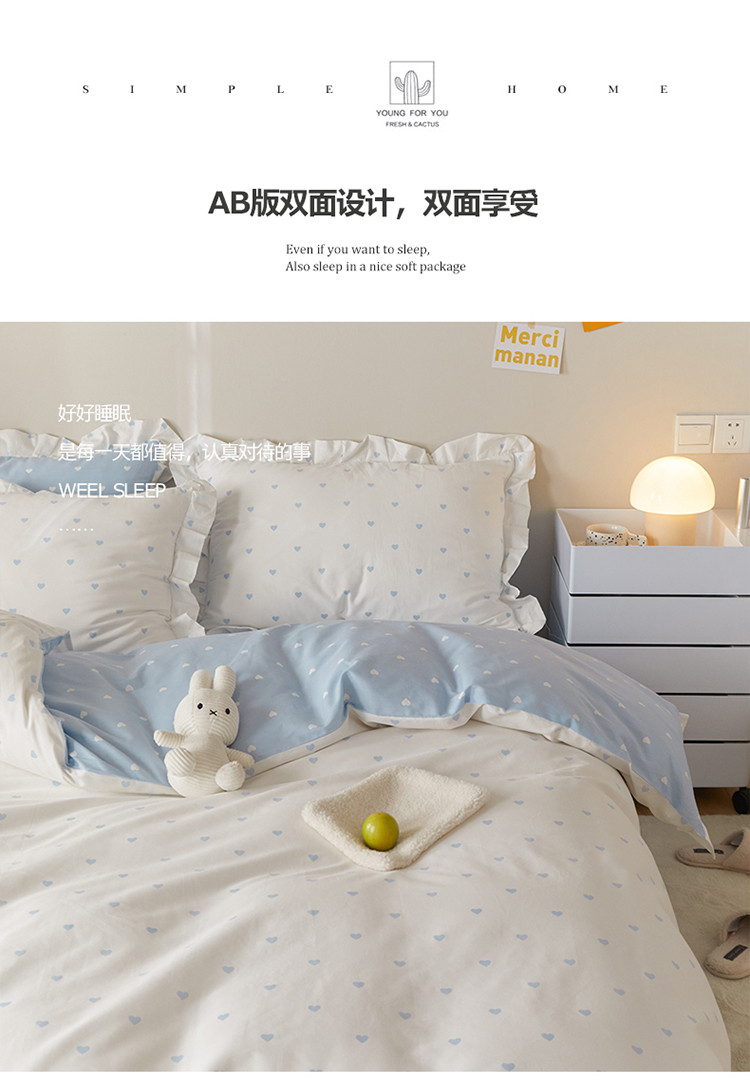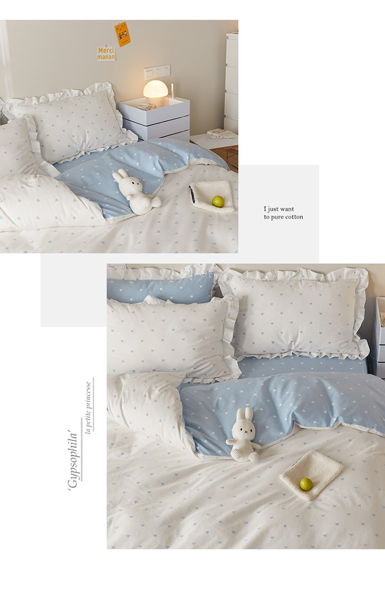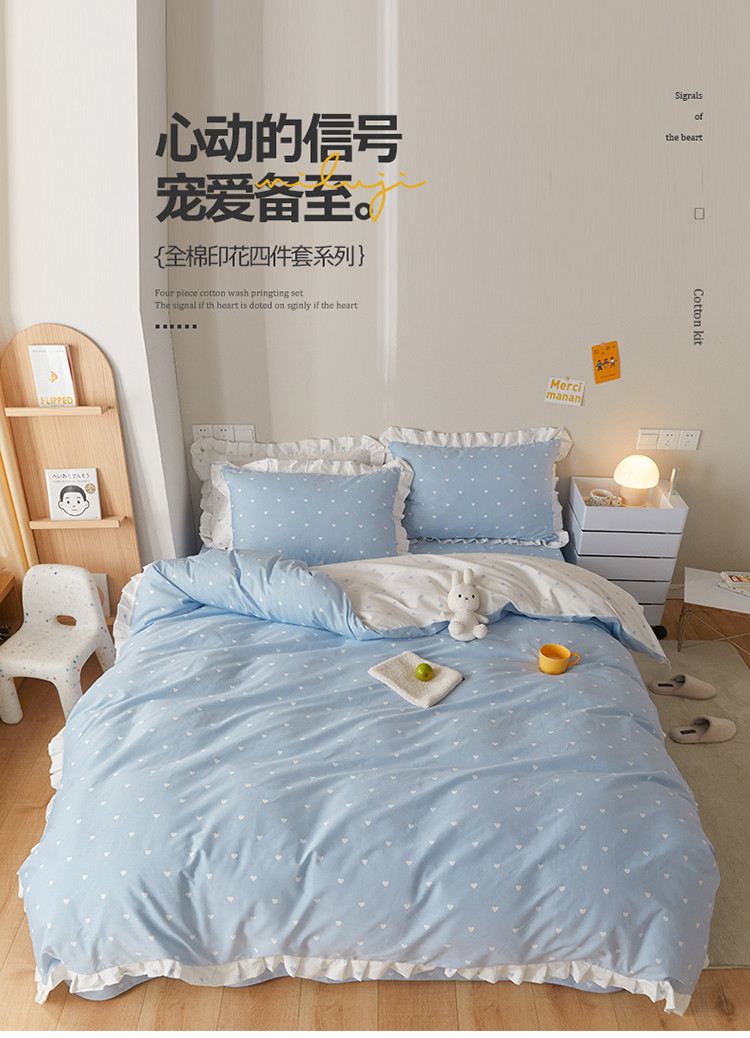 沐棉家居2022年新款全棉印花13372荷叶边系列四件套直播爆款 爱心-蓝