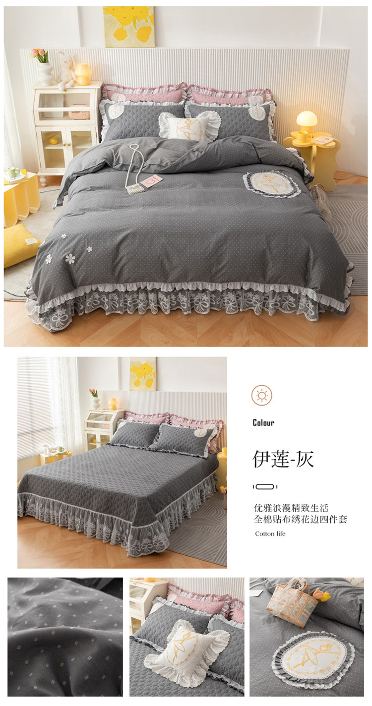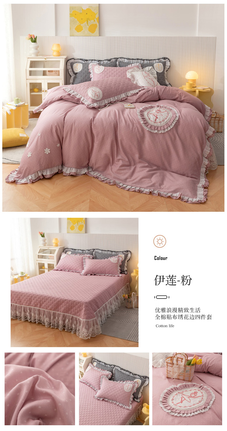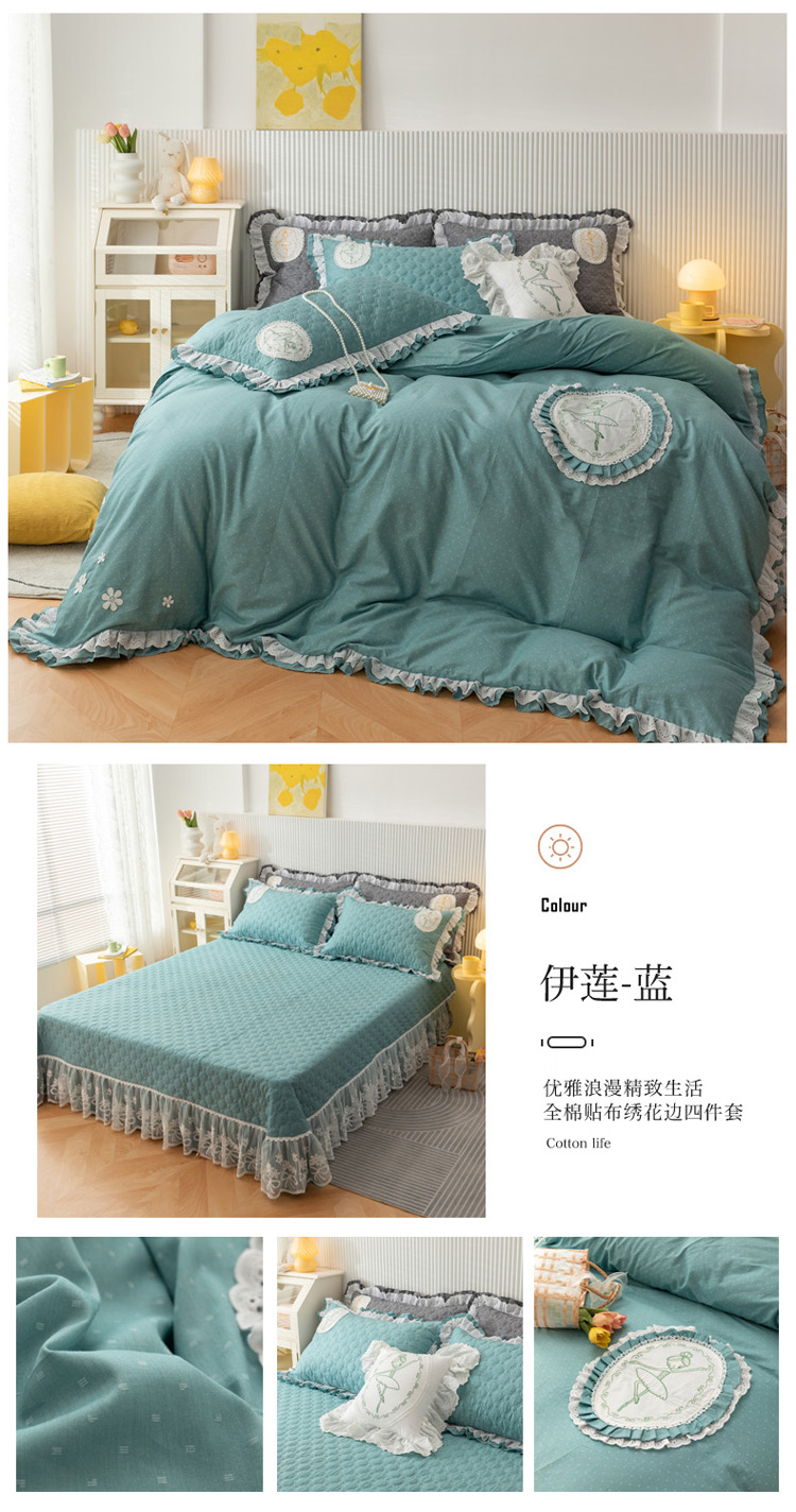 当前位置: 91家纺网 > 商品网购 > 床品套件 > 四件套 > 全棉普通四件套 > (总)菊上家纺 2021新款全棉贴布绣花花边床盖四件套