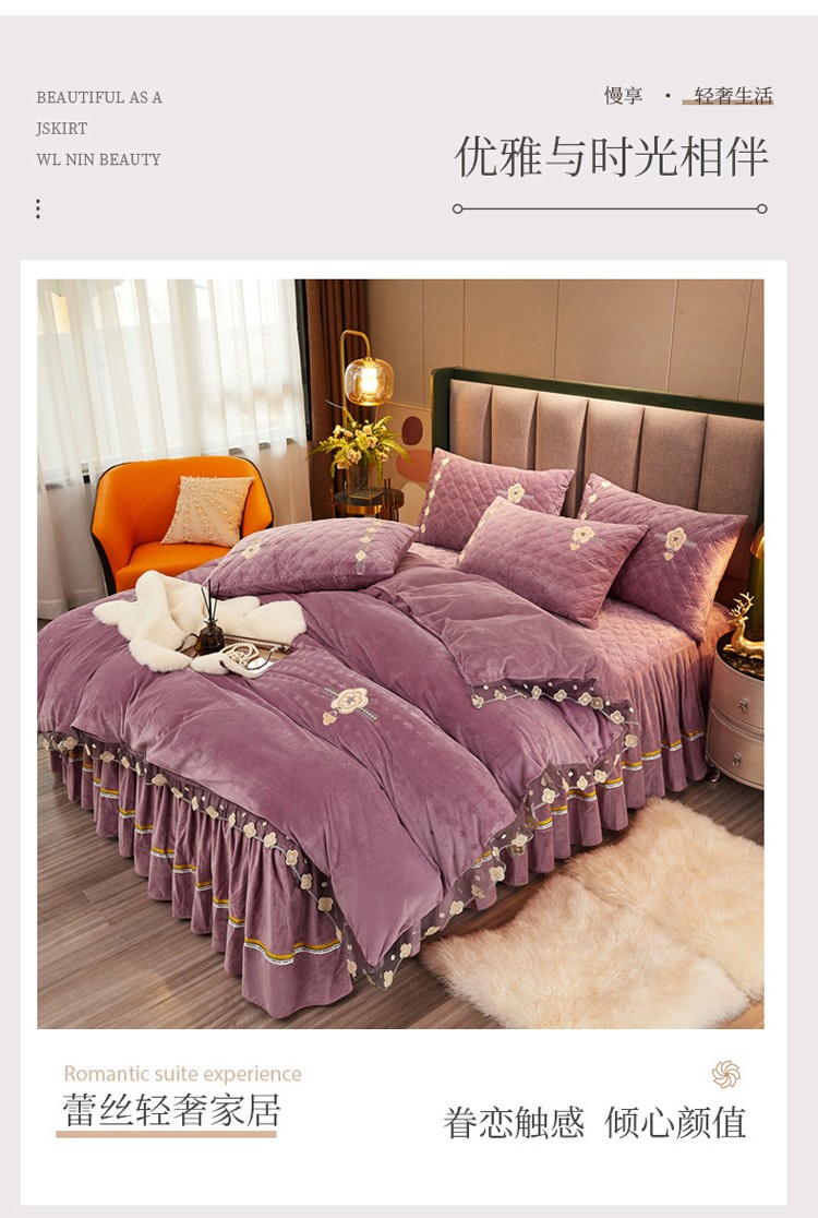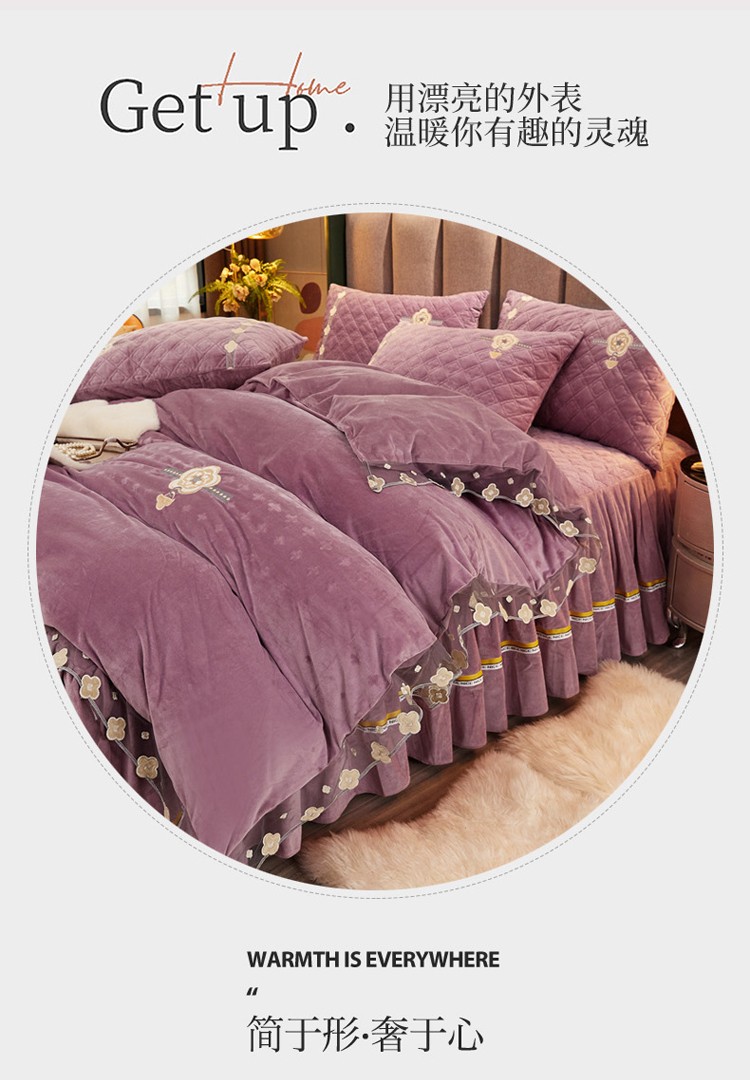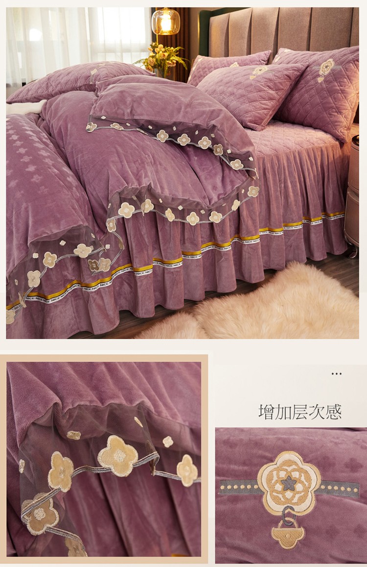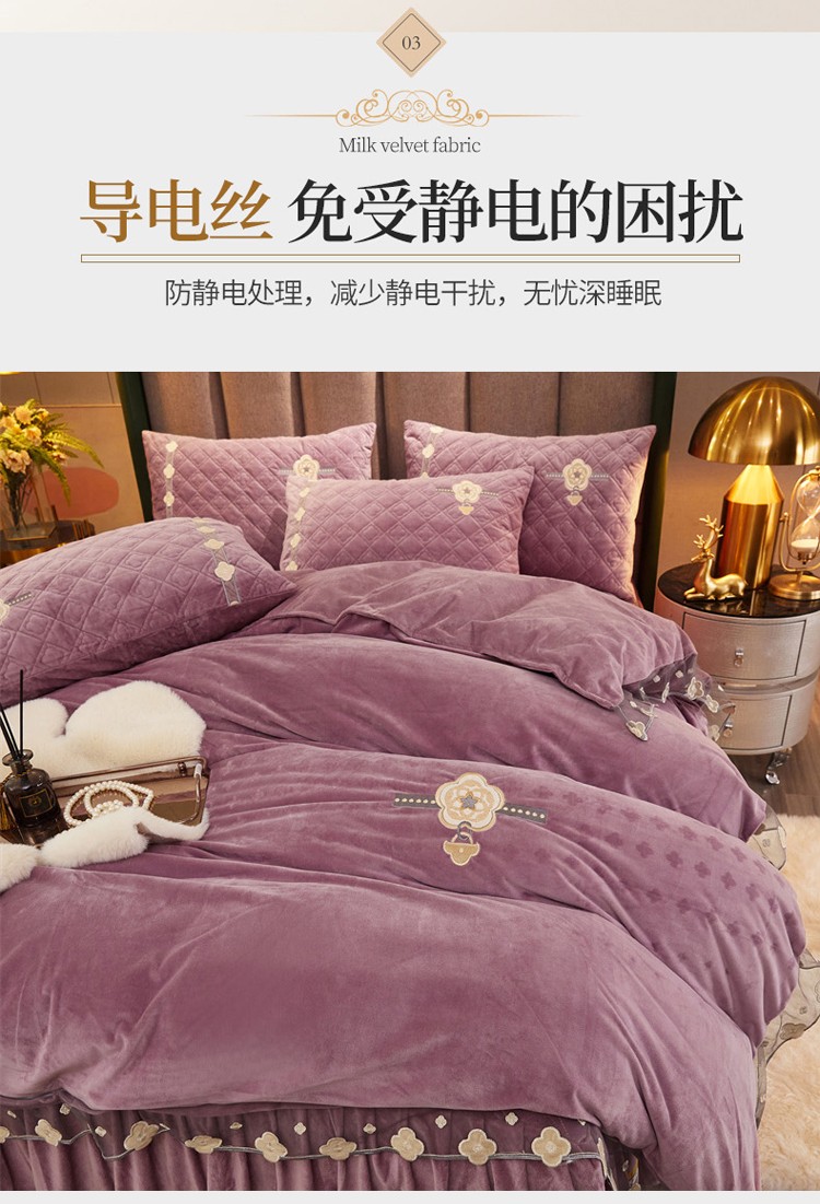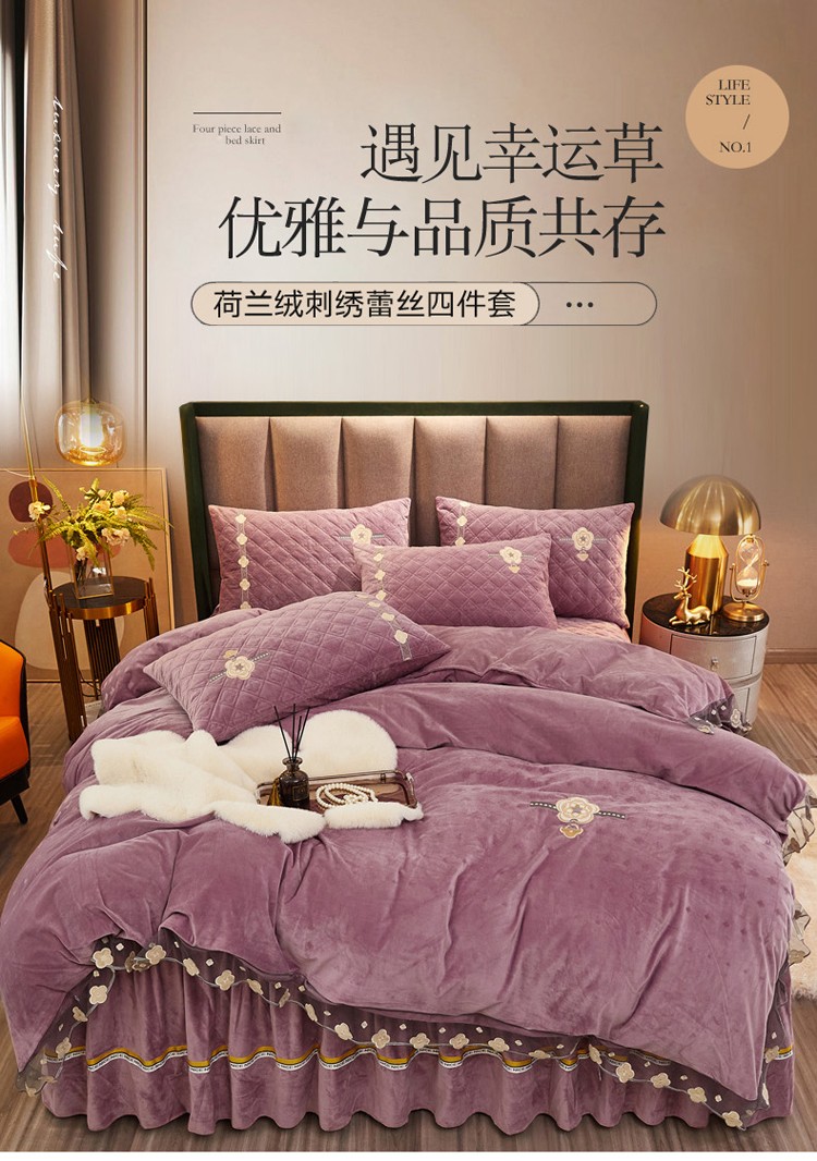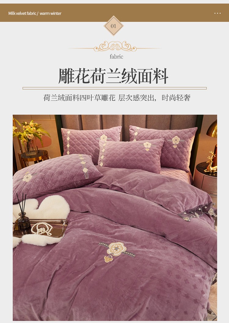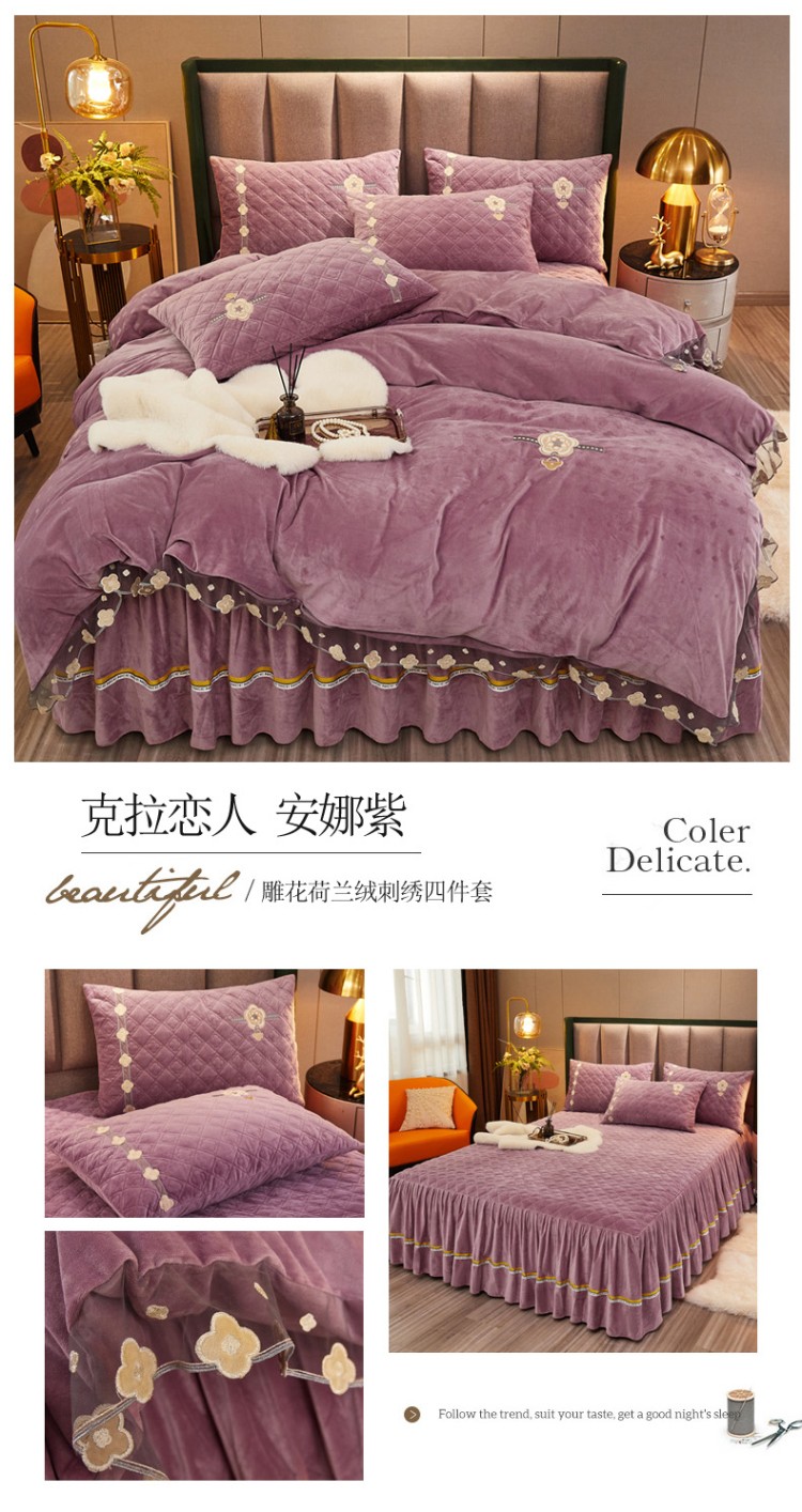 当前位置: 91家纺网 > 商品网购 > 床品套件 > 四件套 > 磨绒四件套 > 菊上家纺 2021新款刺绣雕花克拉恋人荷兰绒四件套 安娜紫