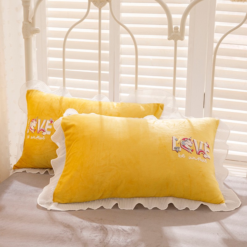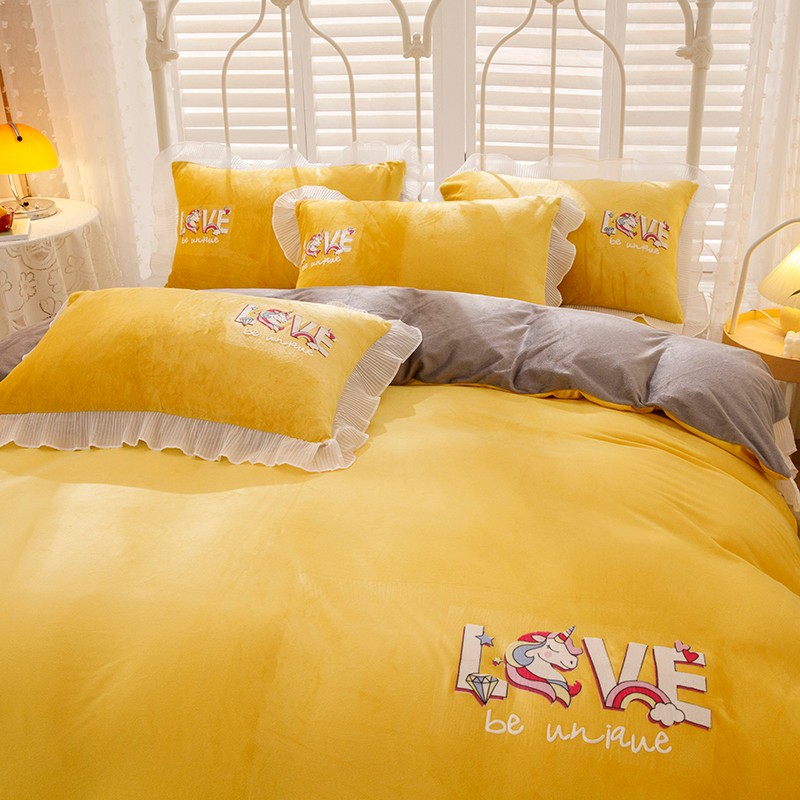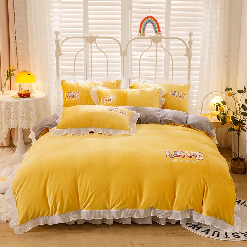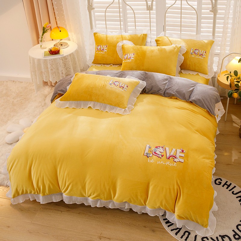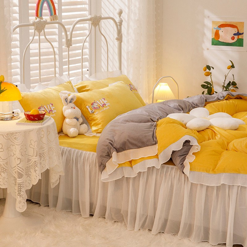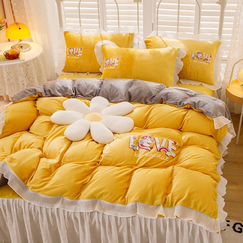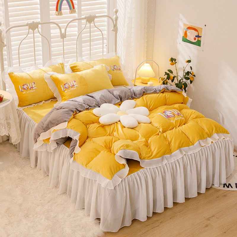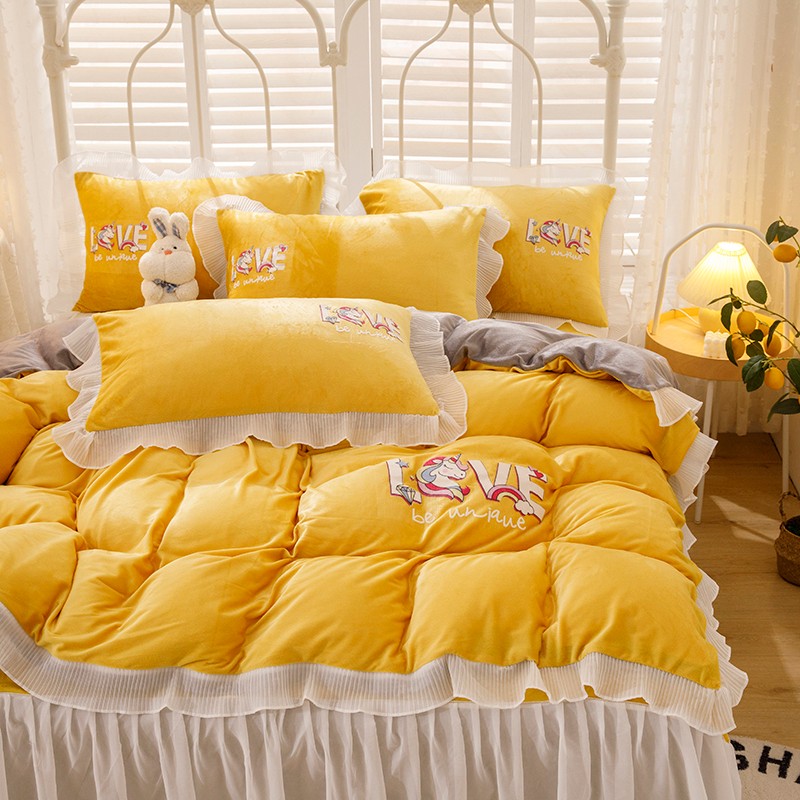 纽缦 2021新款韩版水晶绒床裙四件套 独角兽-姜黄灰