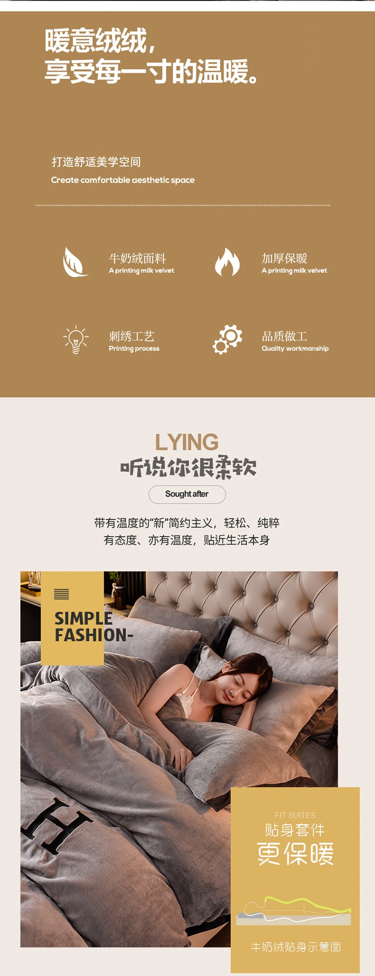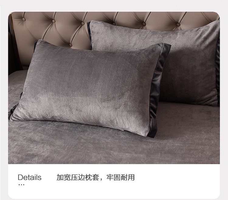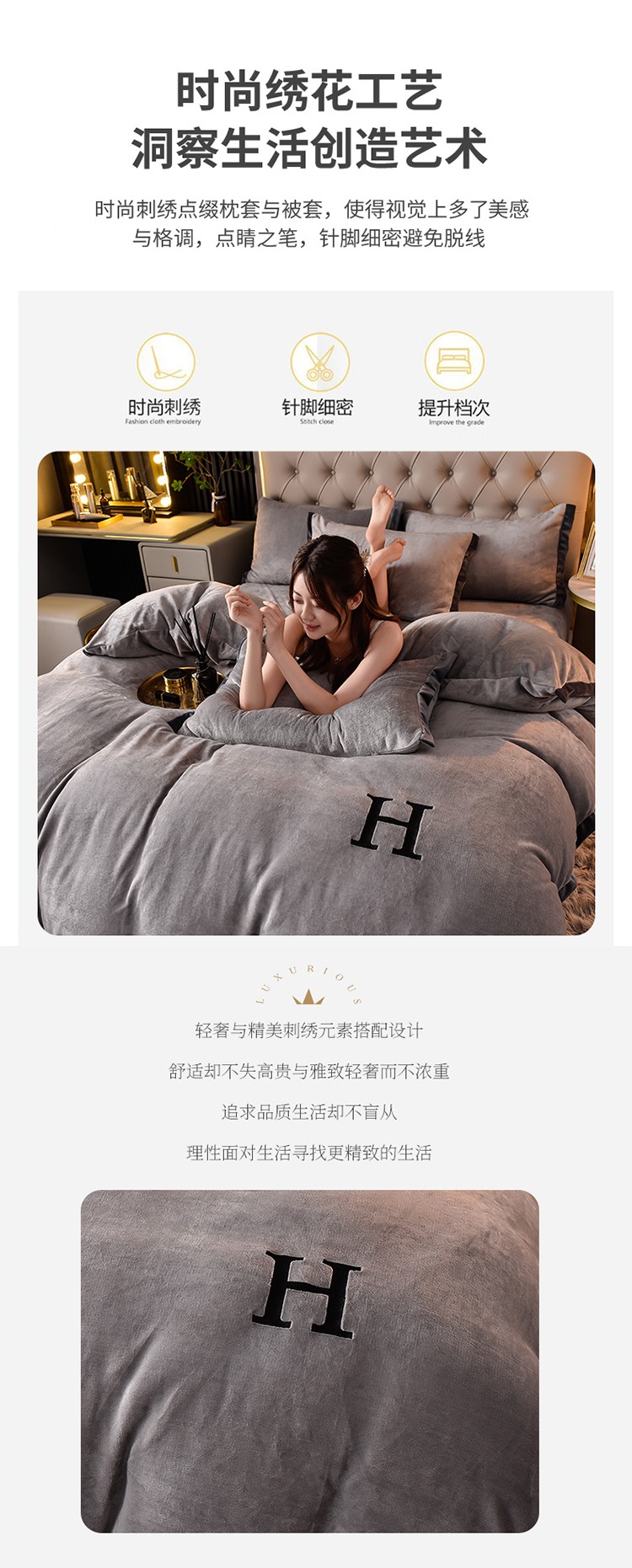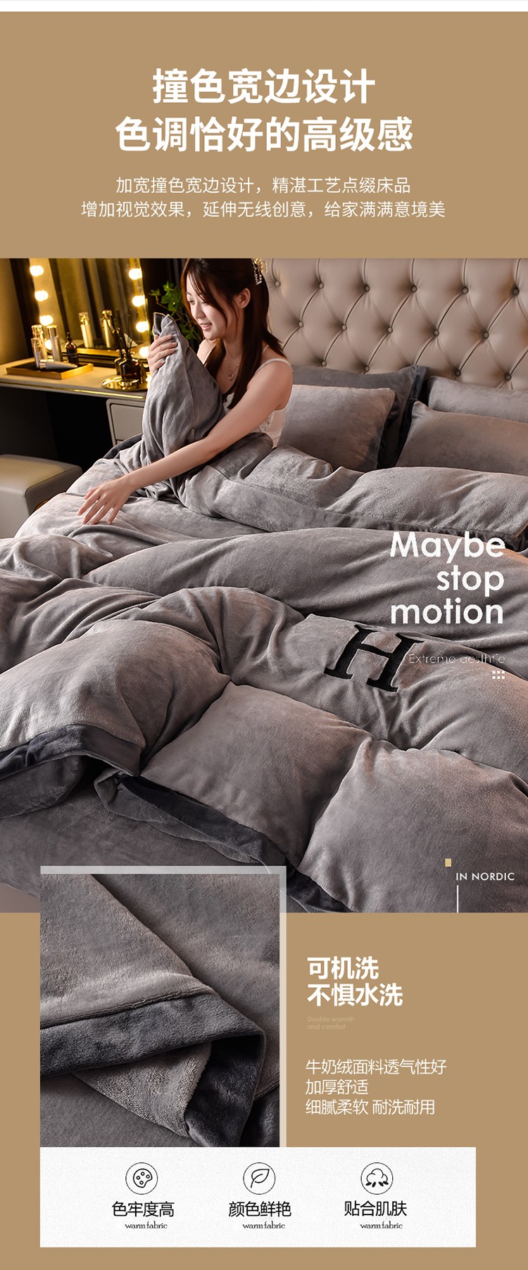 商品名称:简爱家纺2025款高克重牛奶绒拼角工艺四件套 H款-浅灰