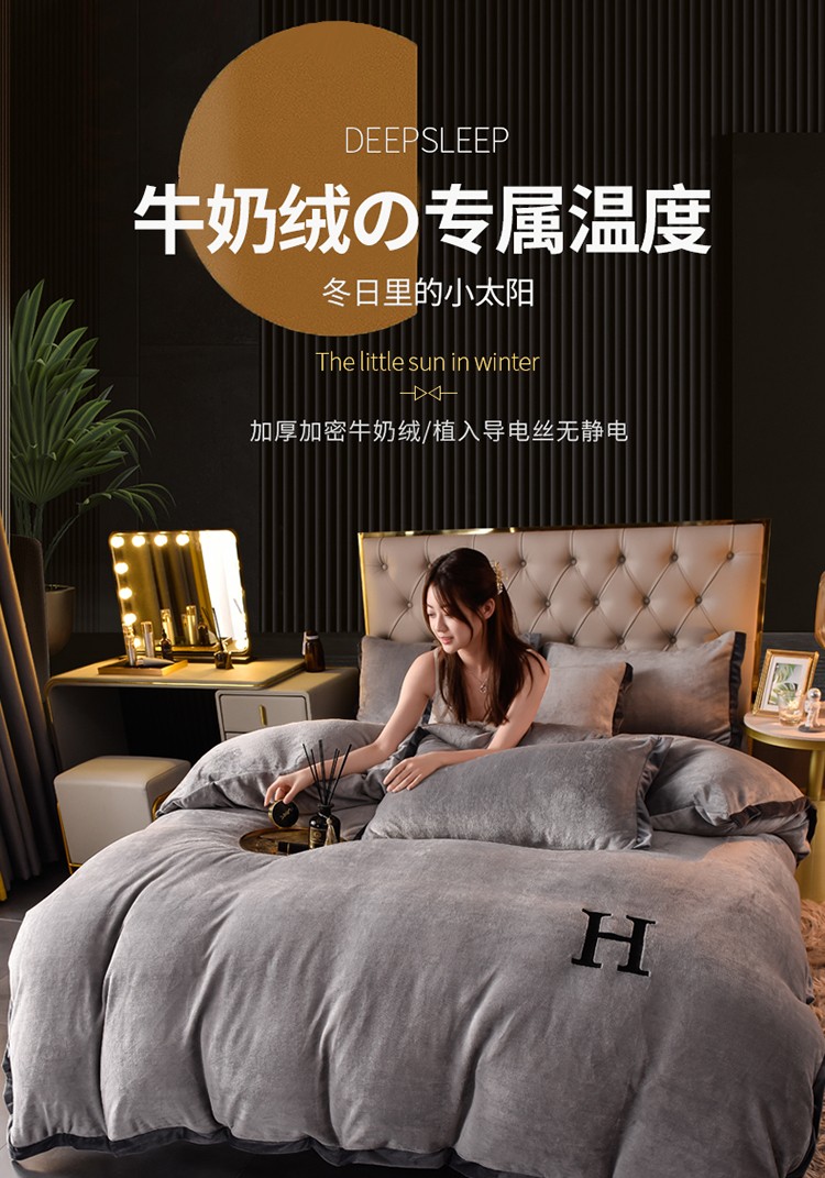 简爱家纺2025款高克重牛奶绒拼角工艺四件套 H款-浅灰