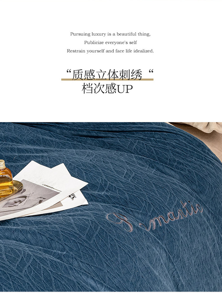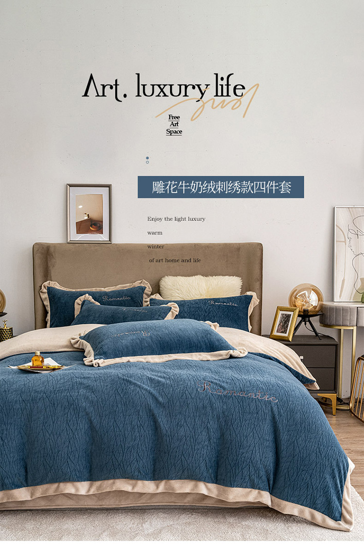 骏腾 2022新款酒店风雕花牛奶绒刺绣款四件套-浪漫满屋 宾利蓝