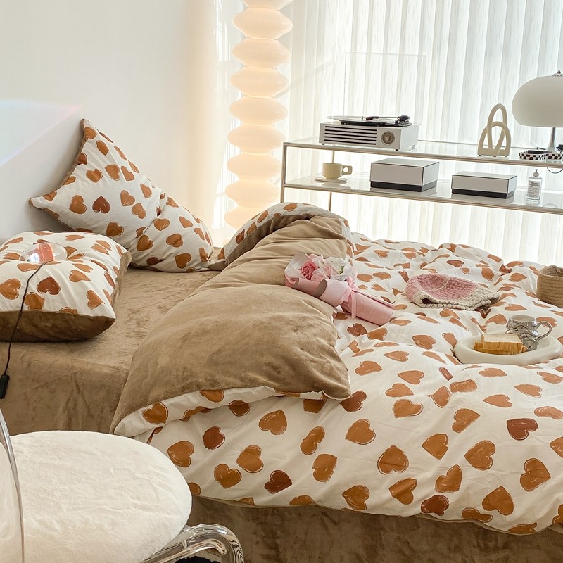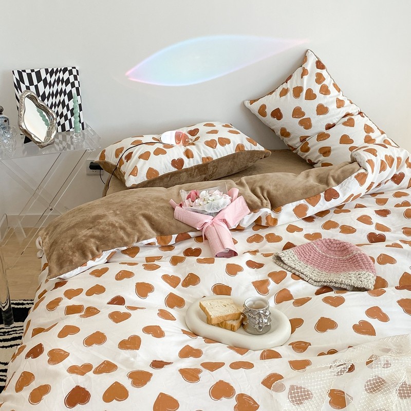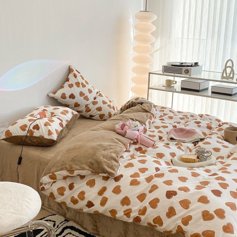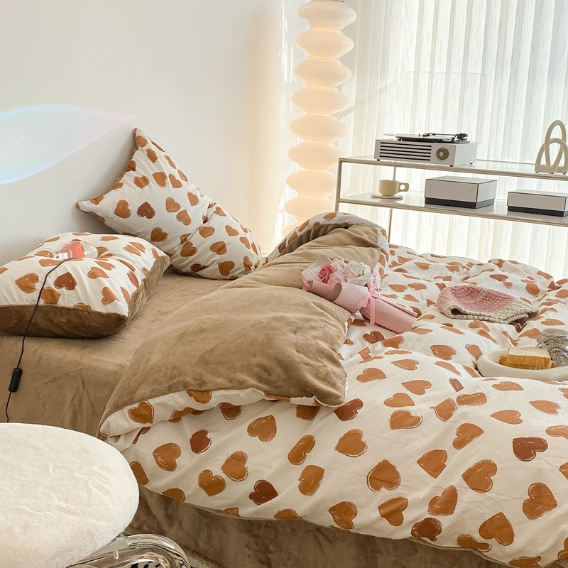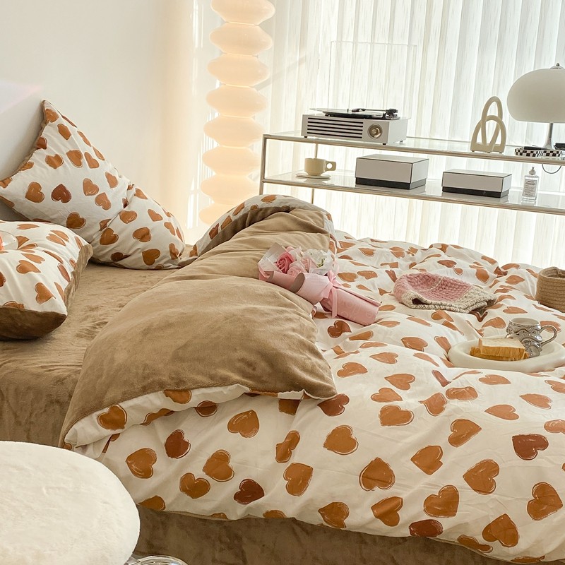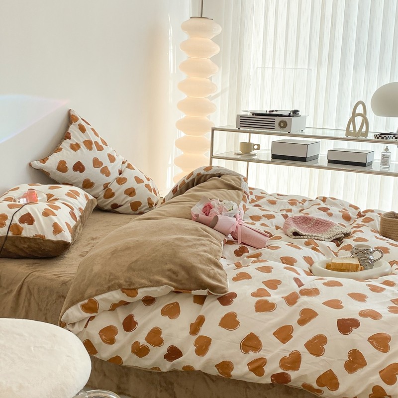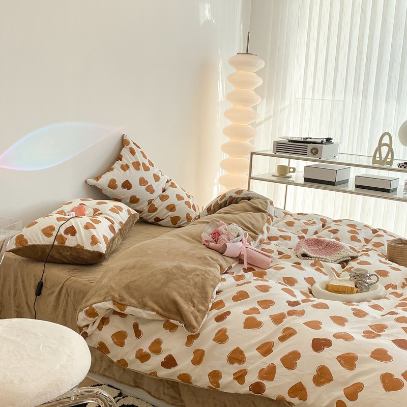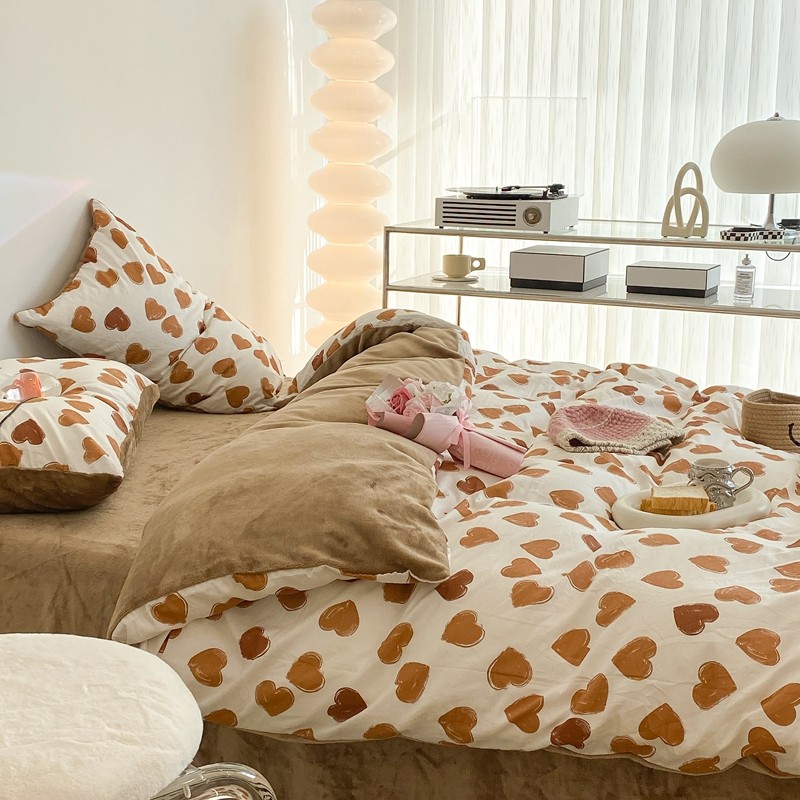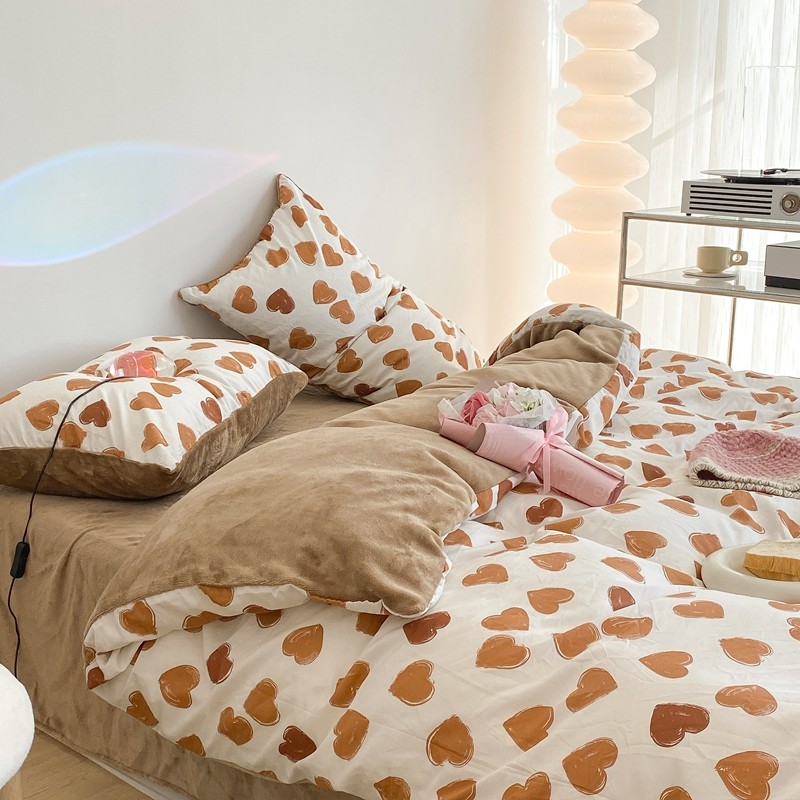 昔可家纺 2021新款棉加牛奶绒四件套 咖色小爱心