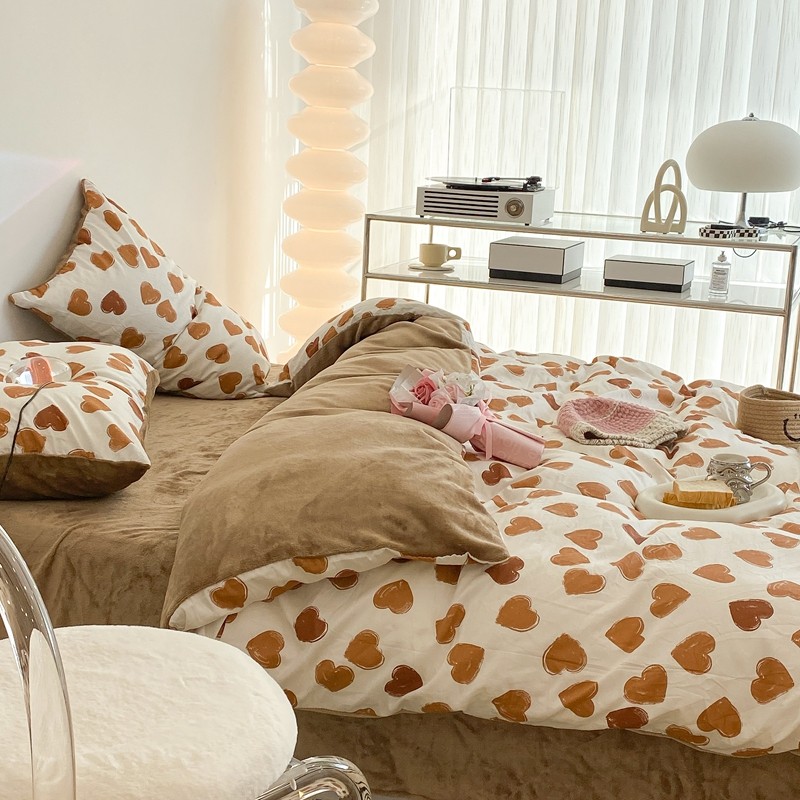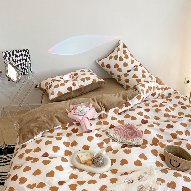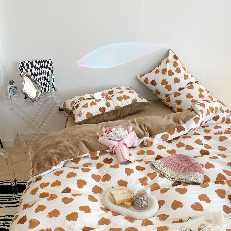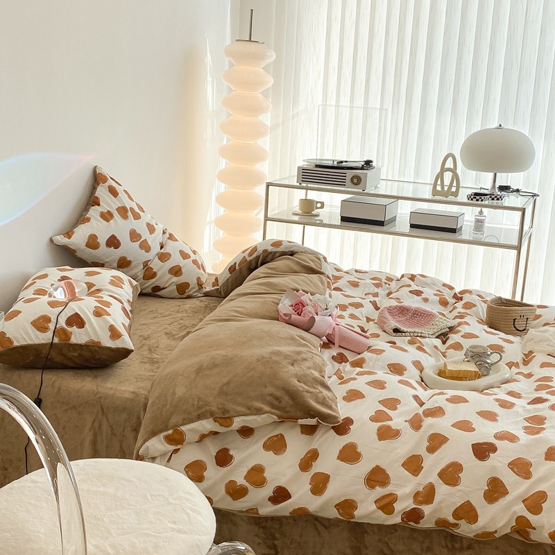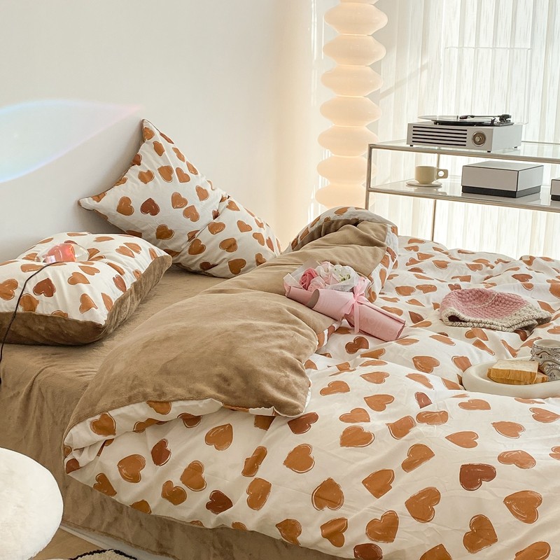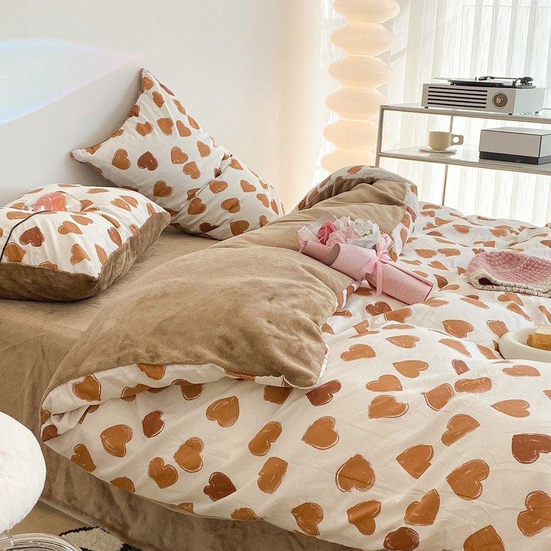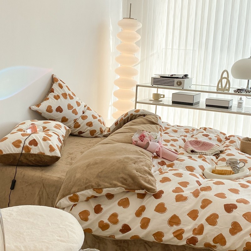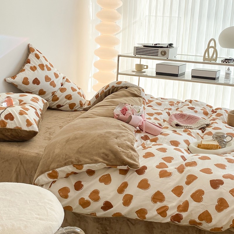 昔可家纺 2021新款棉加牛奶绒四件套 咖色小爱心