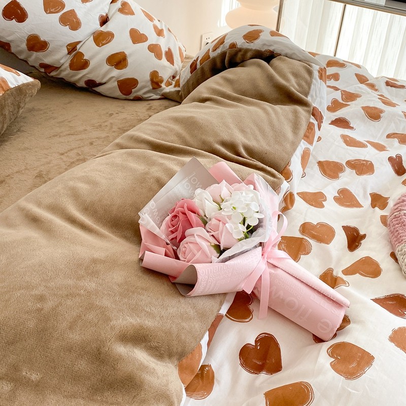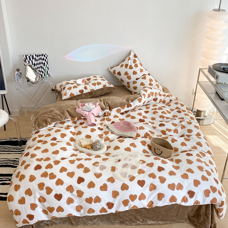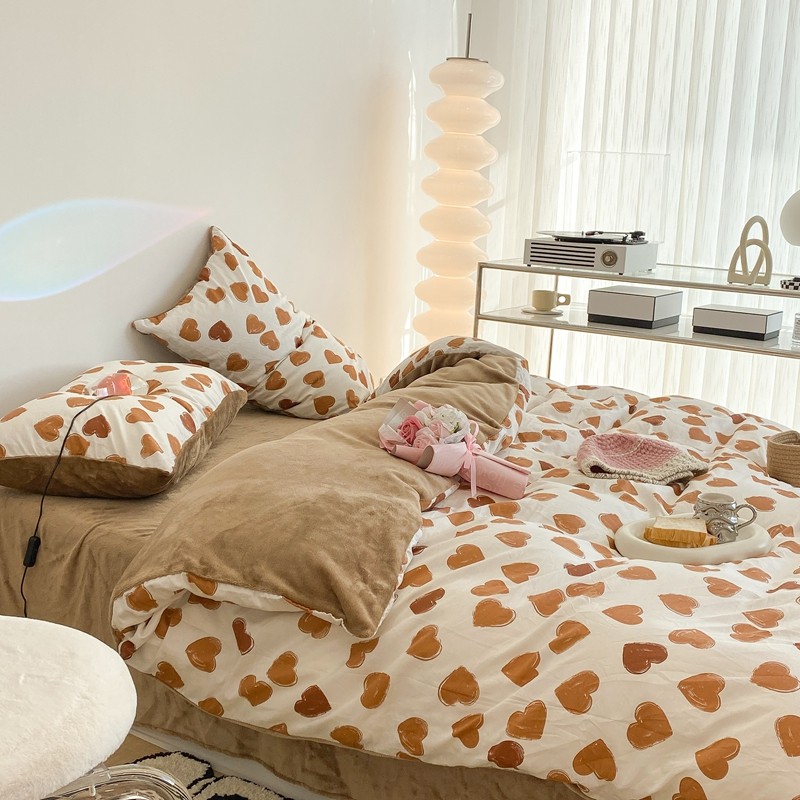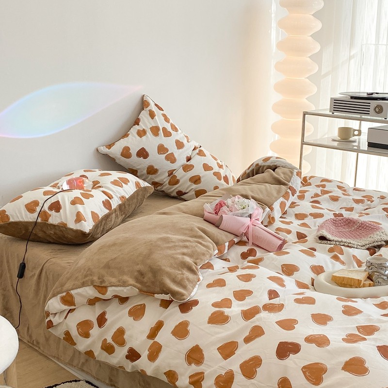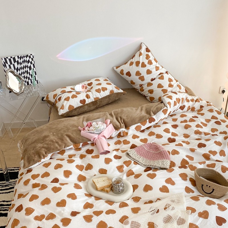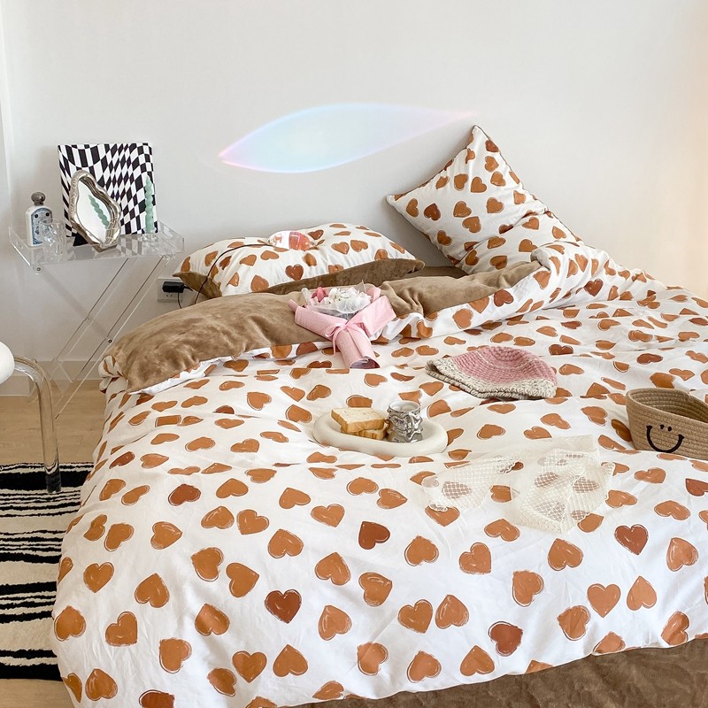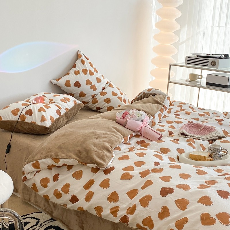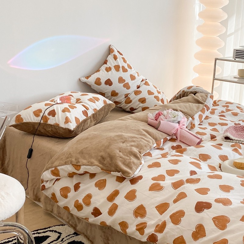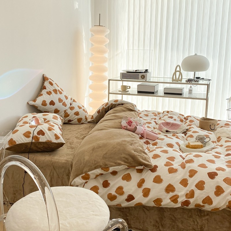 昔可家纺 2021新款棉加牛奶绒四件套 咖色小爱心