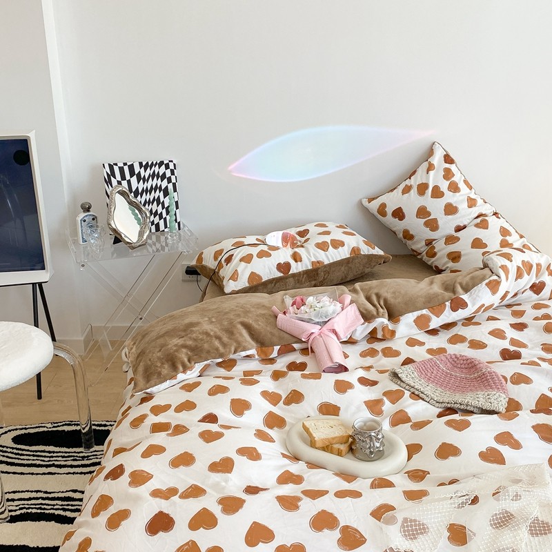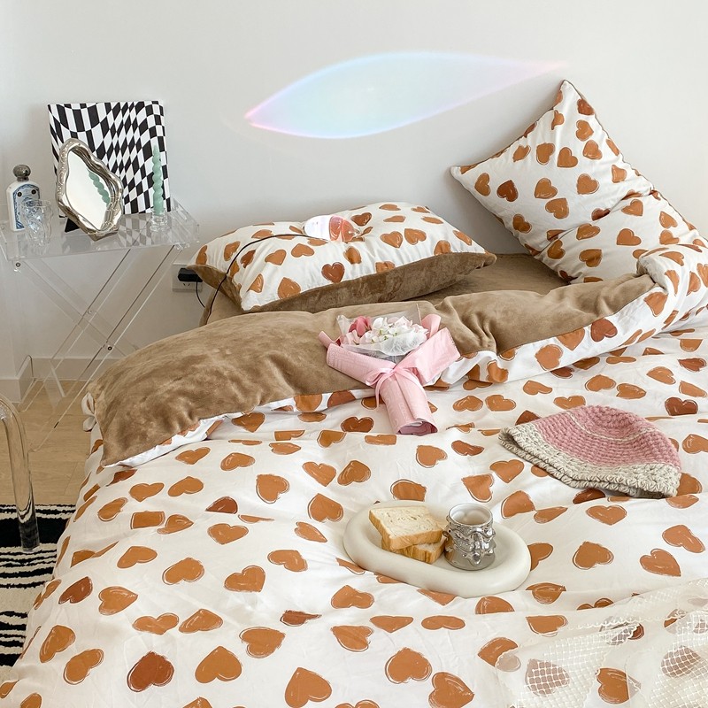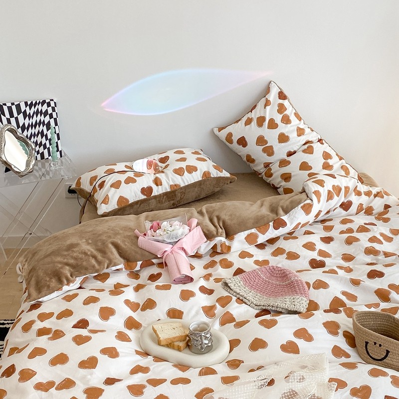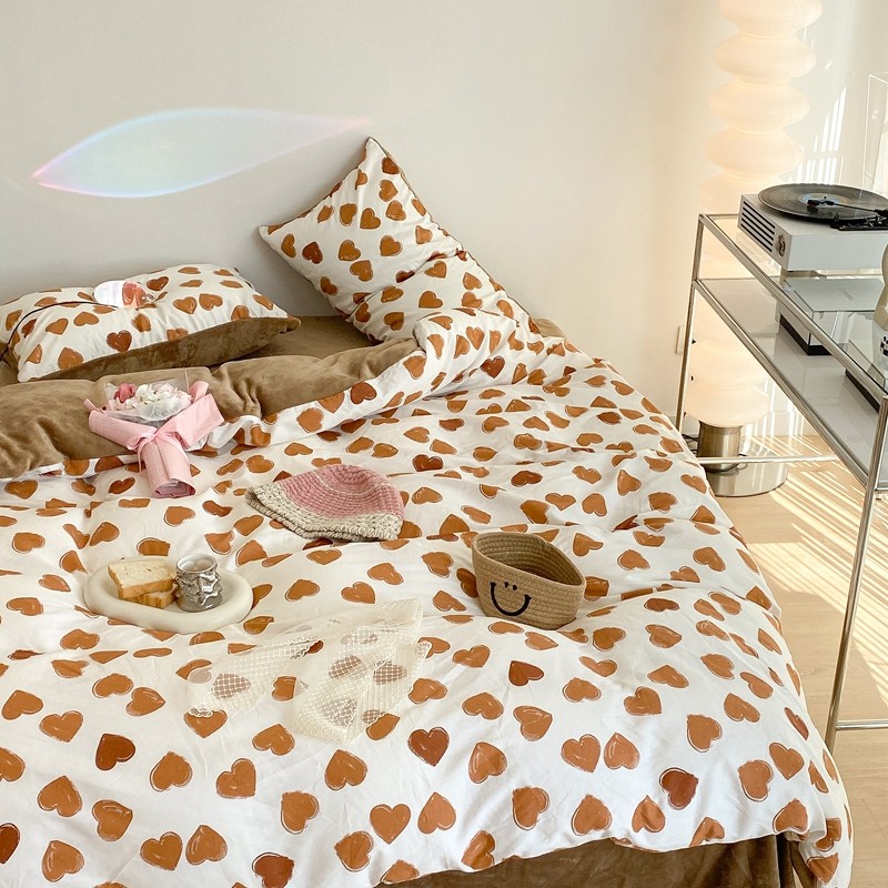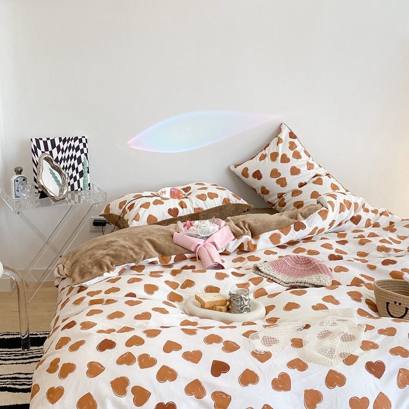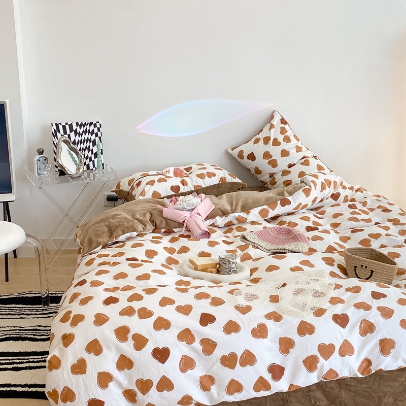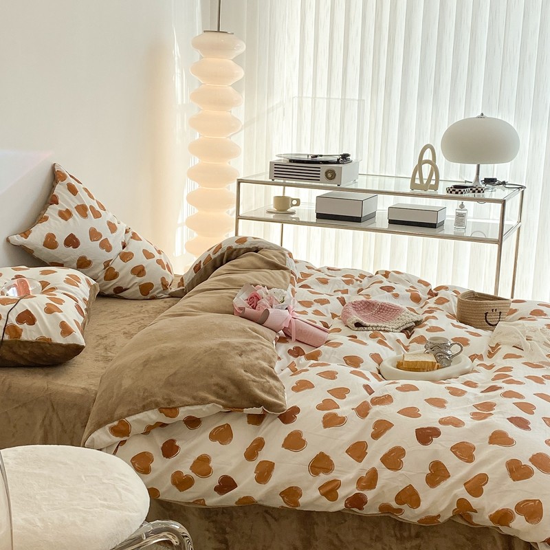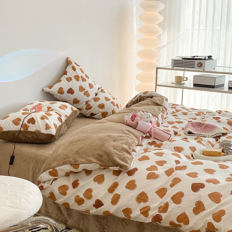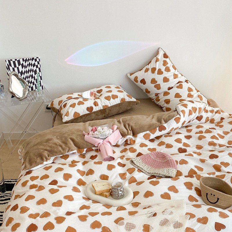 昔可家纺 2021新款棉加牛奶绒四件套 咖色小爱心