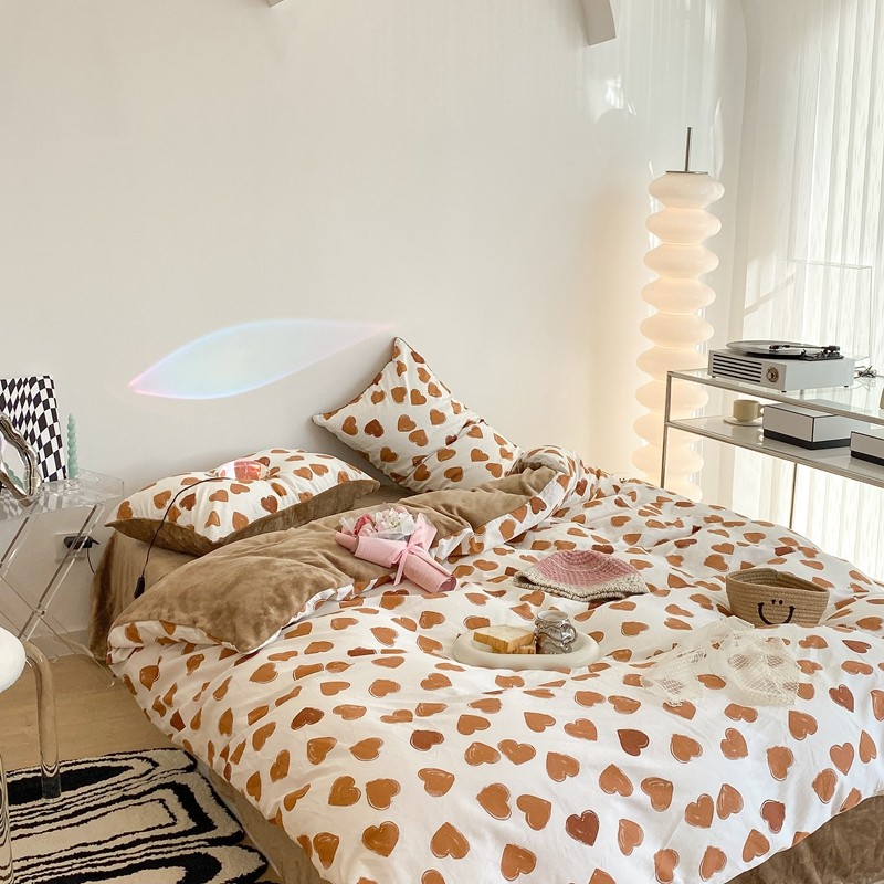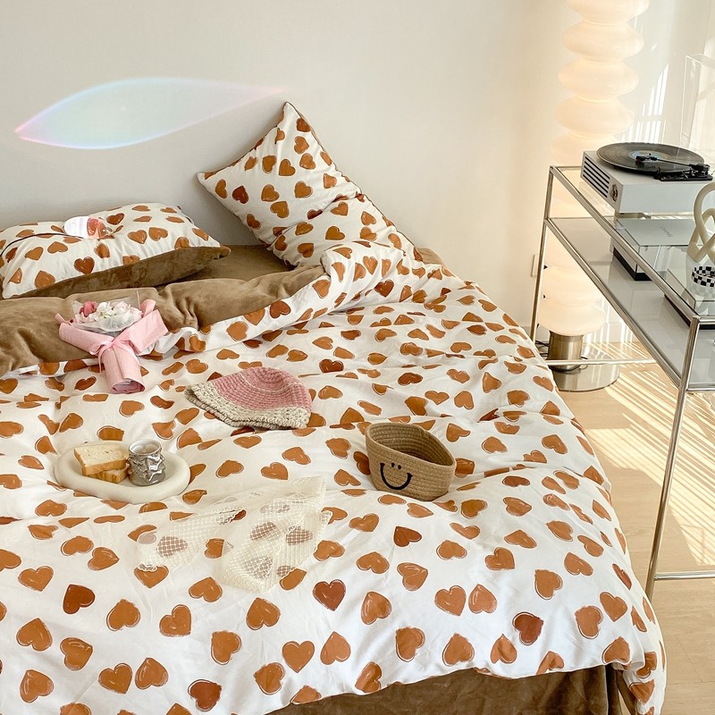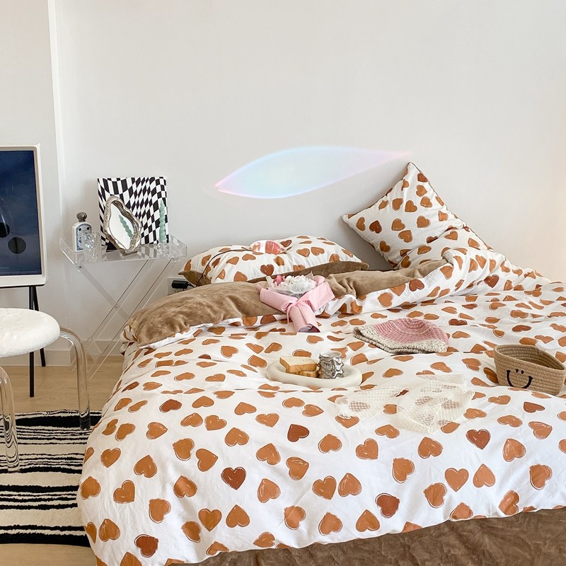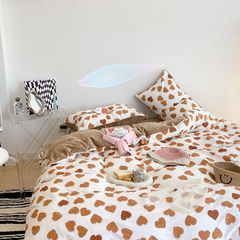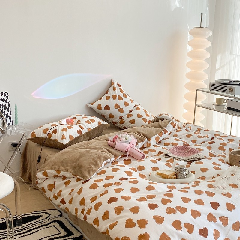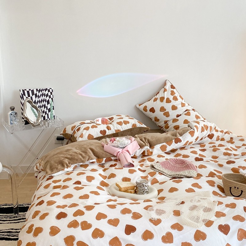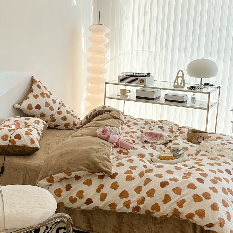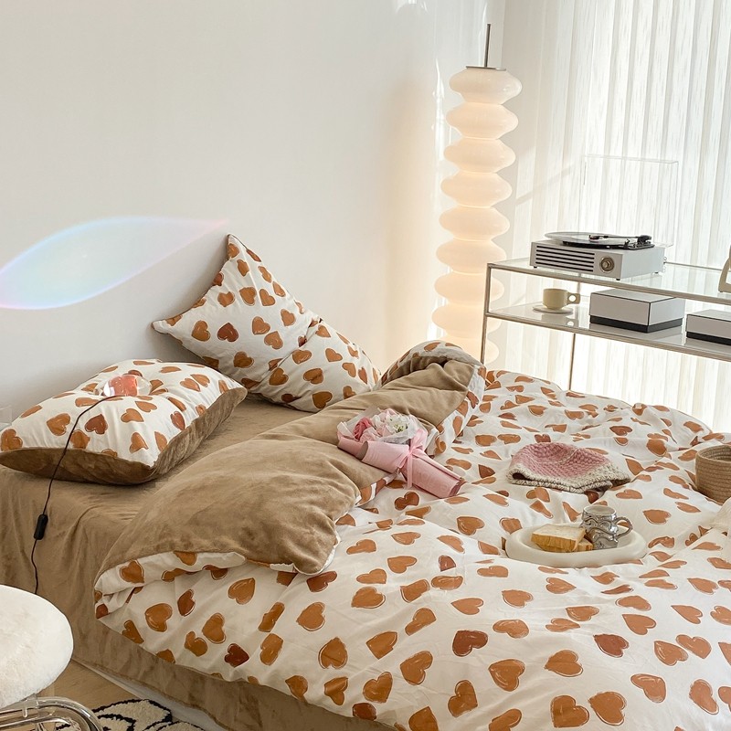 昔可家纺 2021新款棉加牛奶绒四件套 咖色小爱心