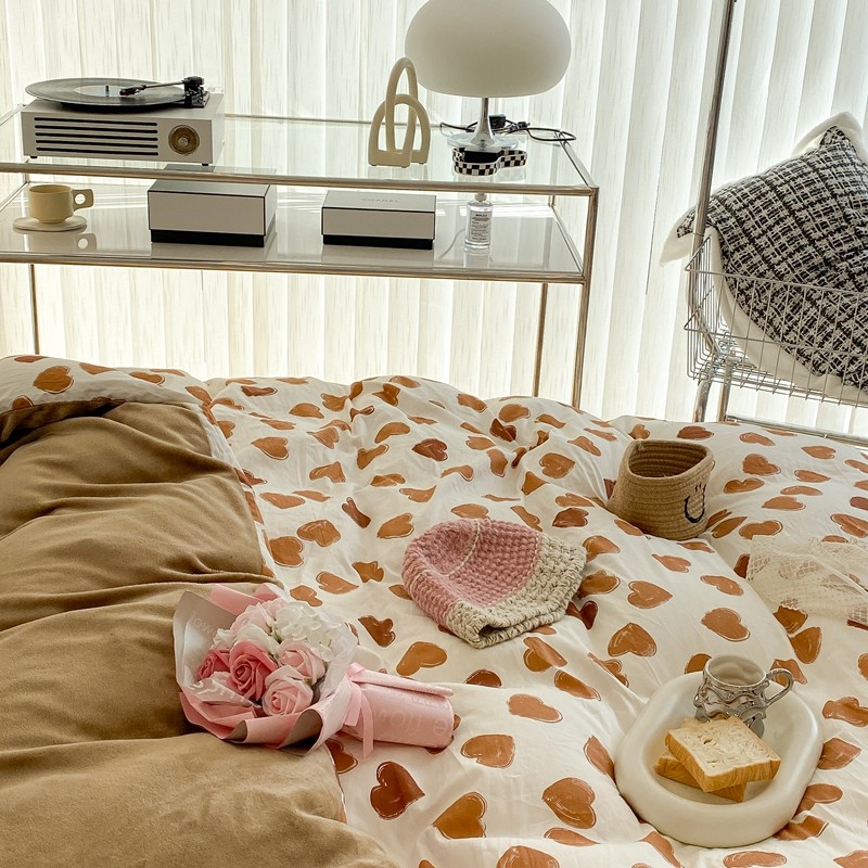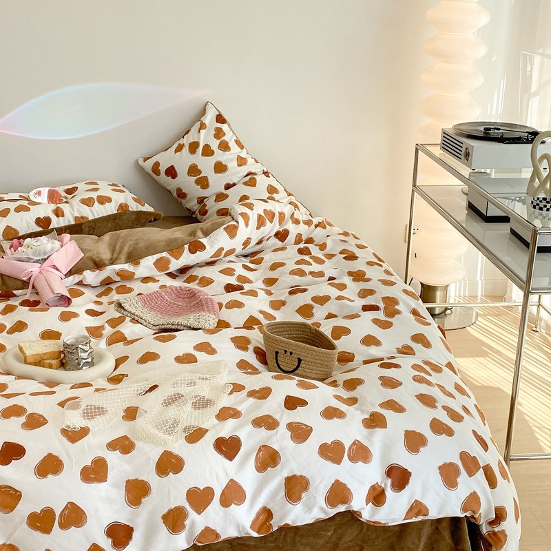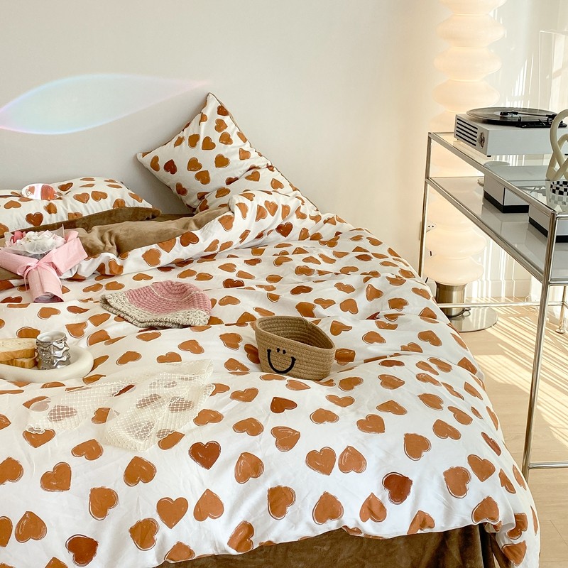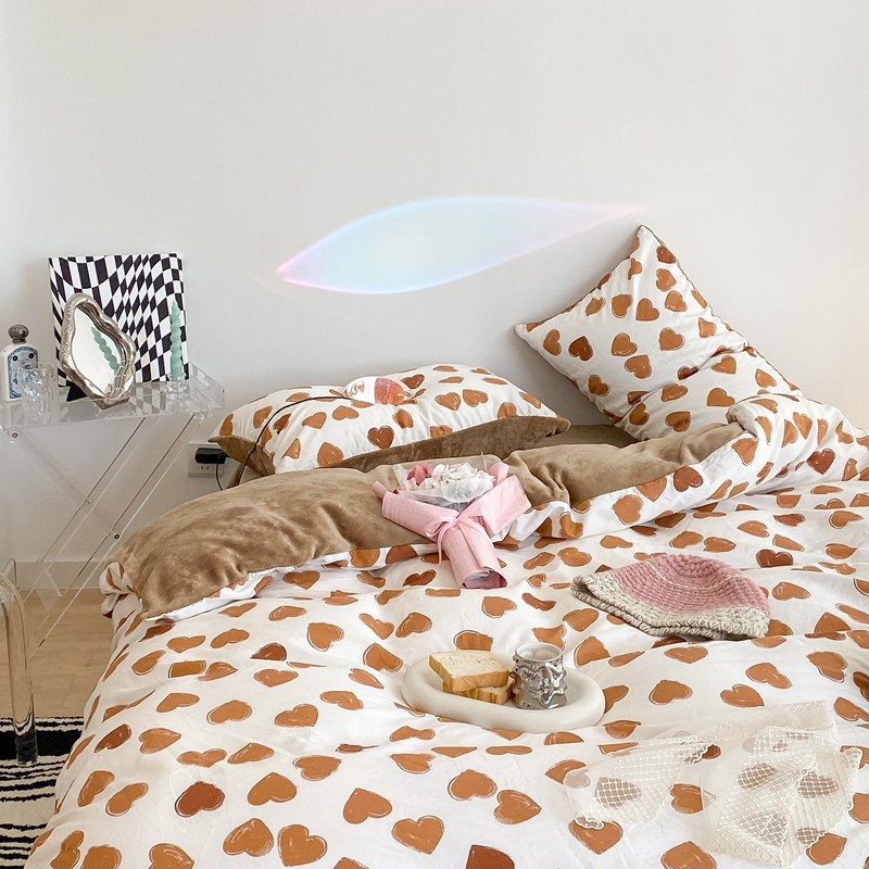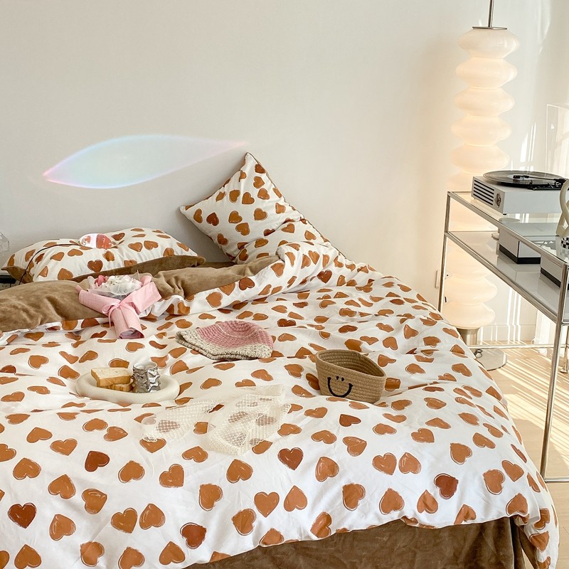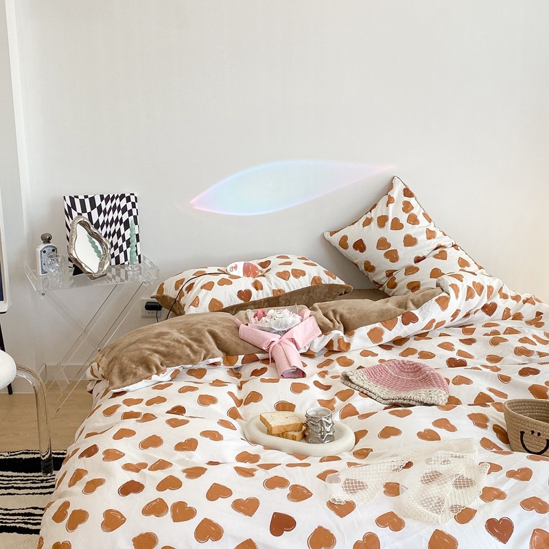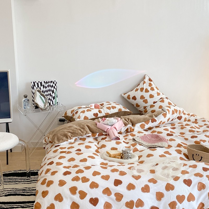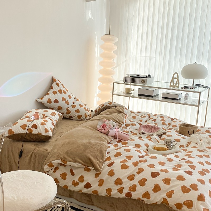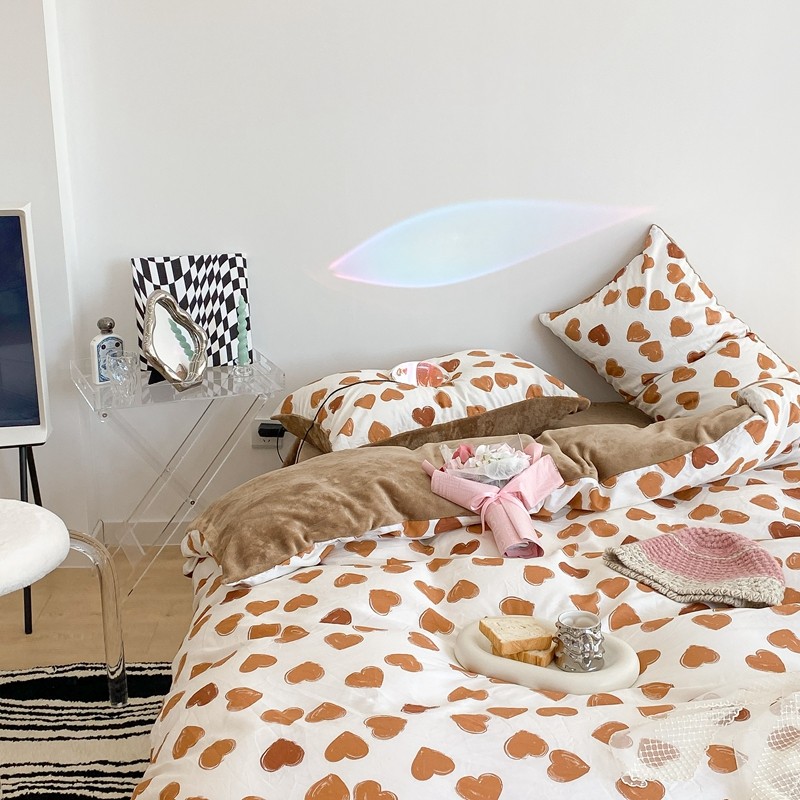 昔可家纺 2021新款棉加牛奶绒四件套 咖色小爱心