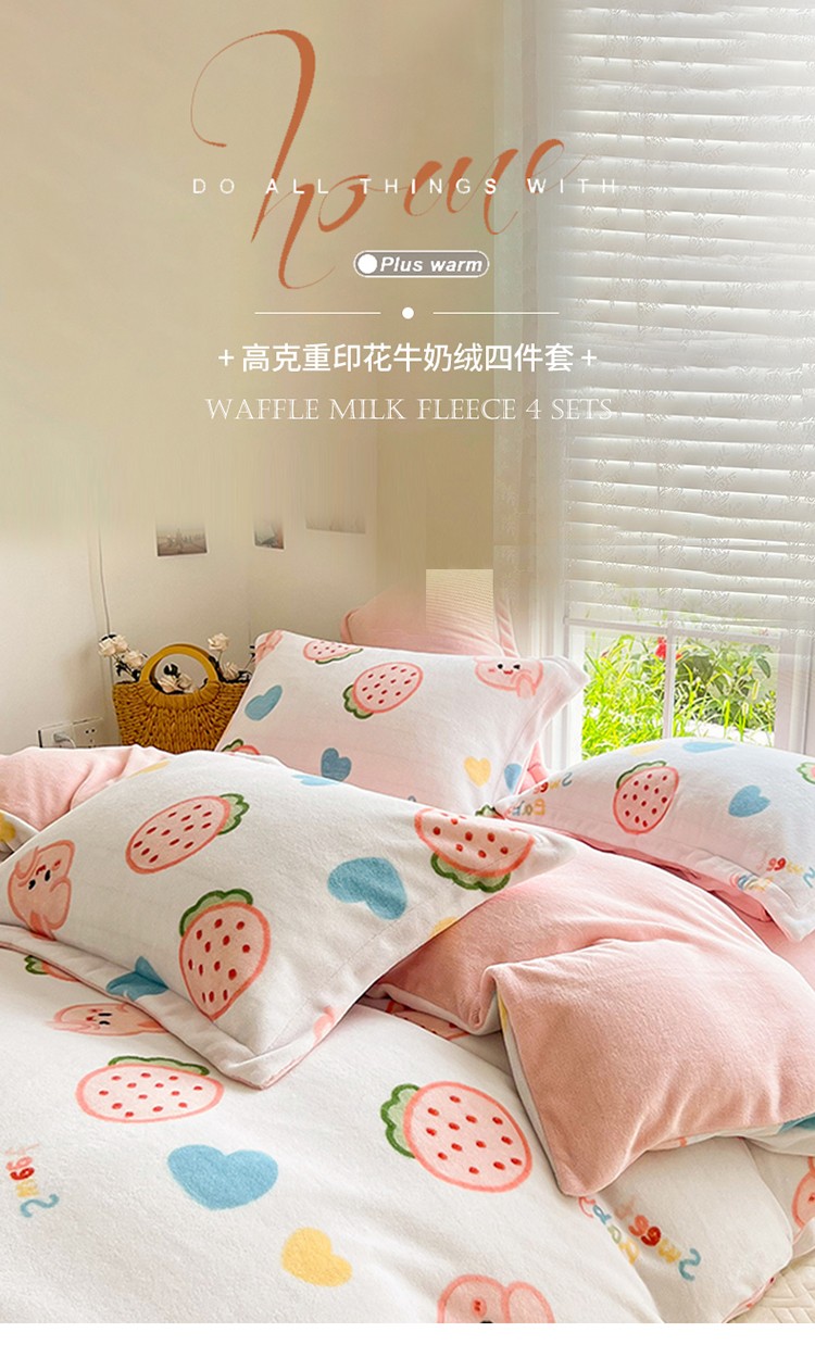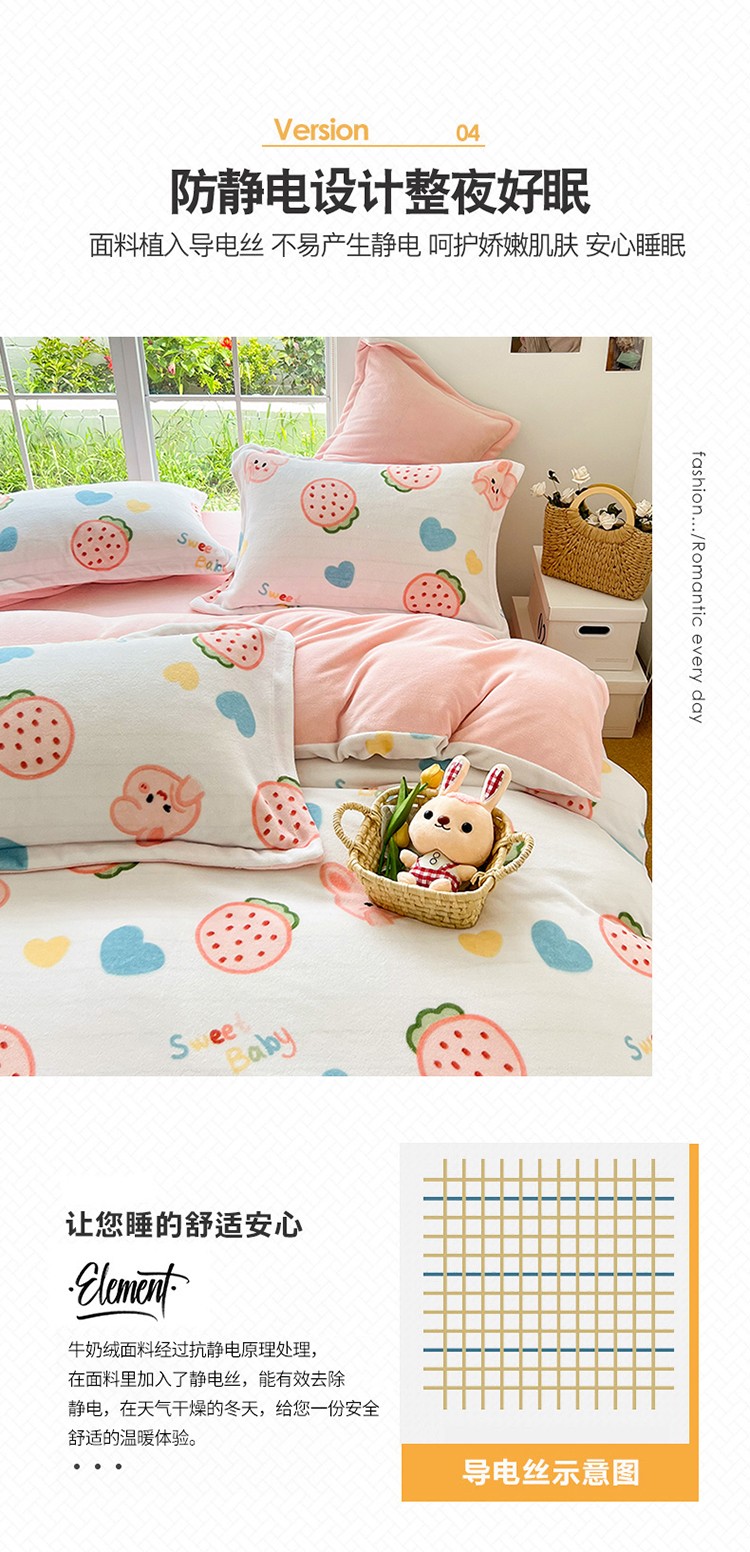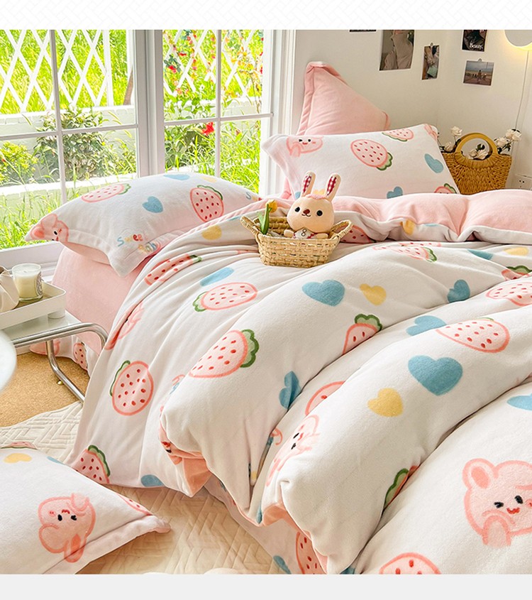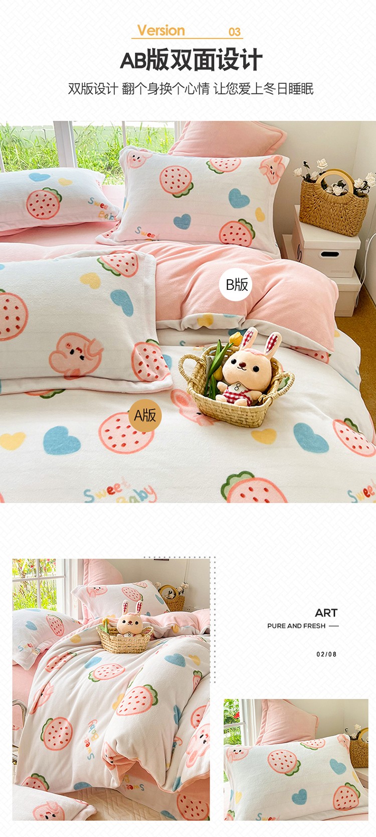 呗旺鹿 2022印花小清新加厚保暖牛奶绒四件套直播 草莓兔兔
