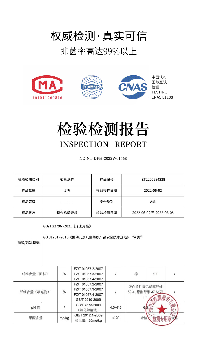 填充纤维种类: 大豆蛋白改性聚酯纤维