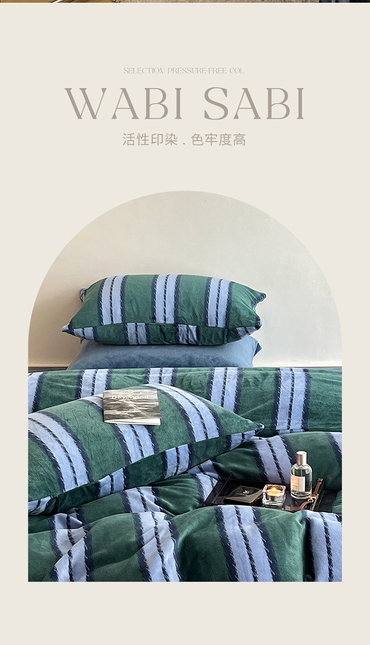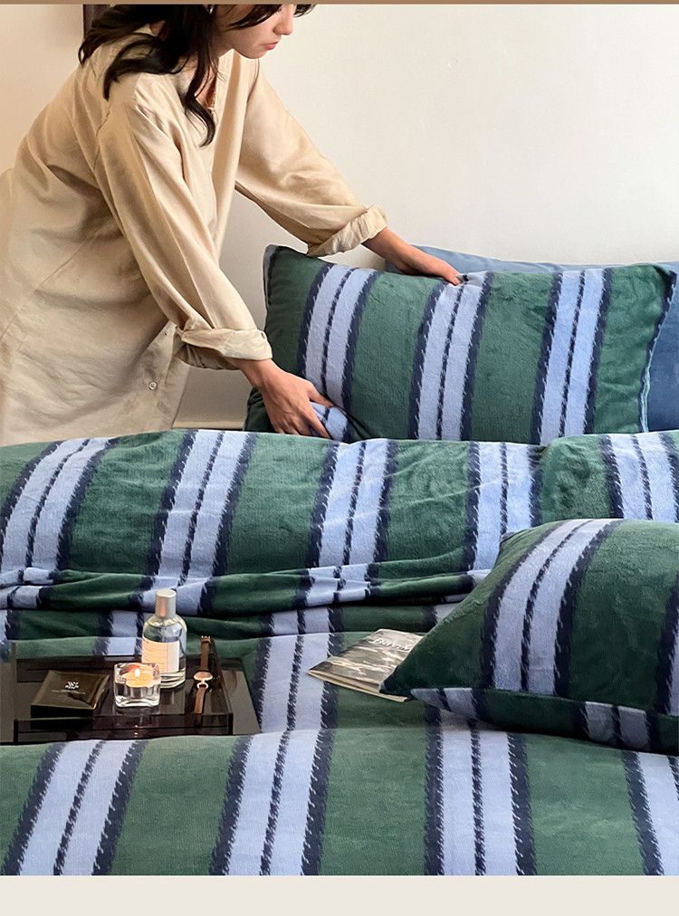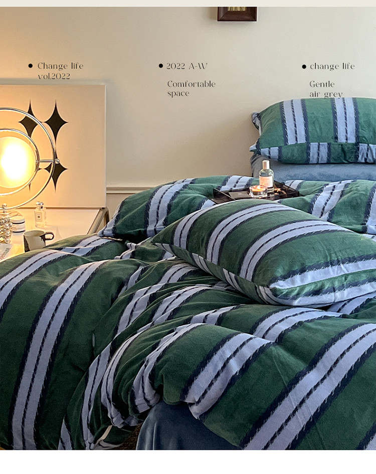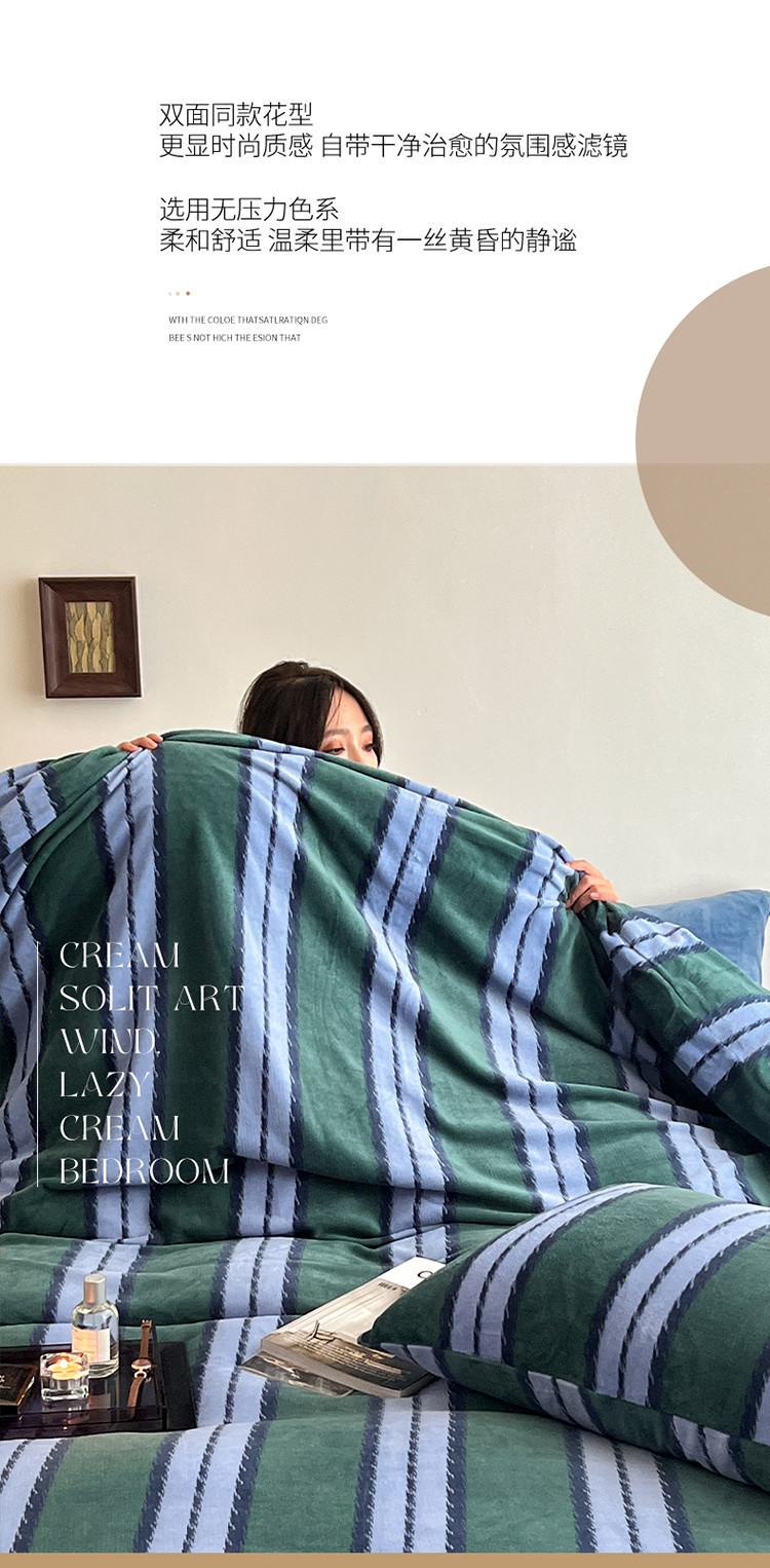 当前位置: 91家纺网 > 商品网购 > 床品套件 > 四件套 > 牛奶绒四件套 > 圆岛家纺 2022新款230克高克重牛奶绒保暖四件套 蓝松绿条
