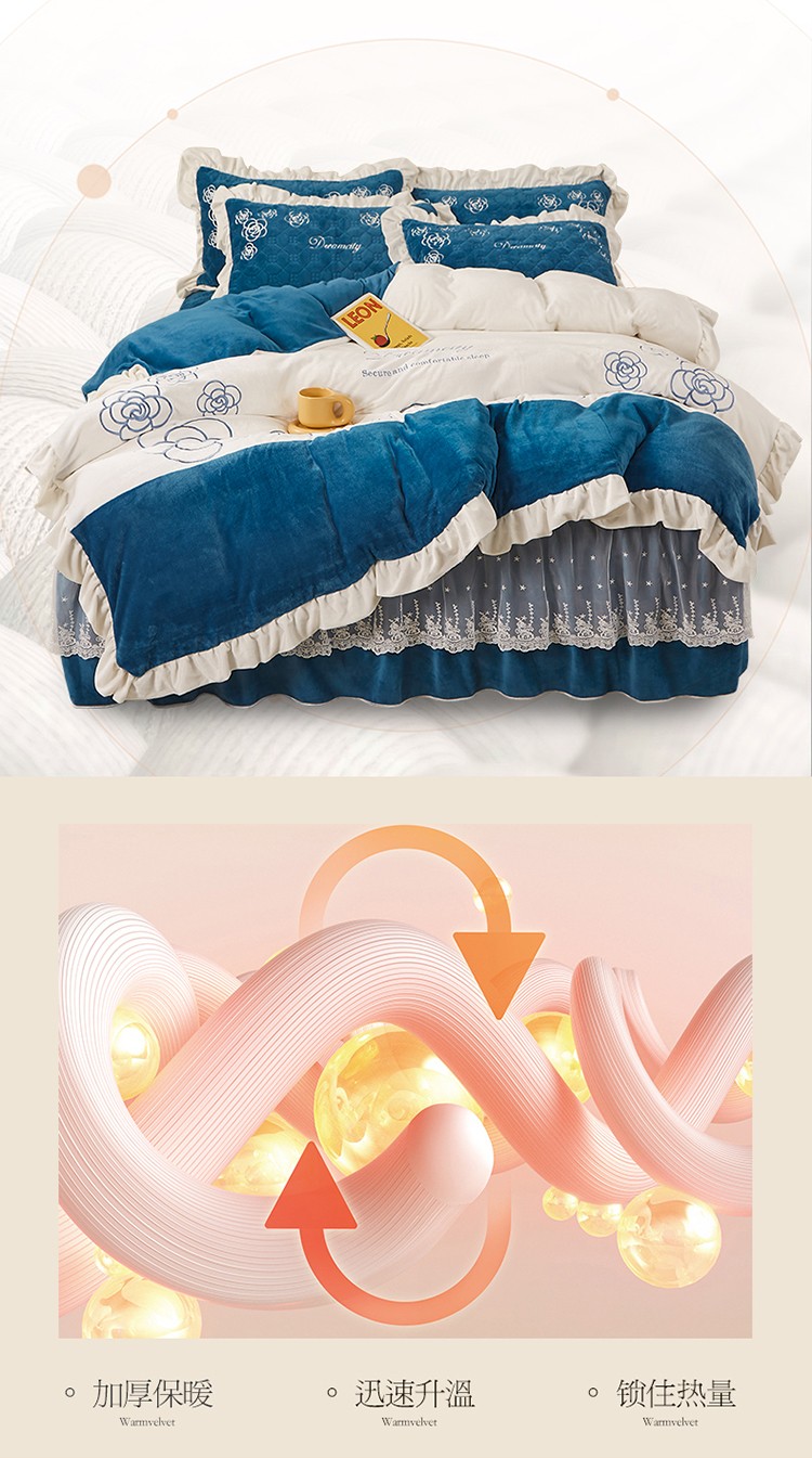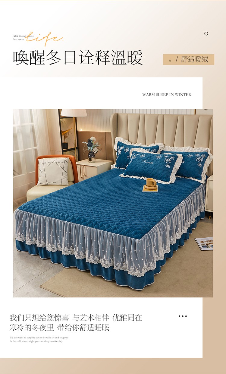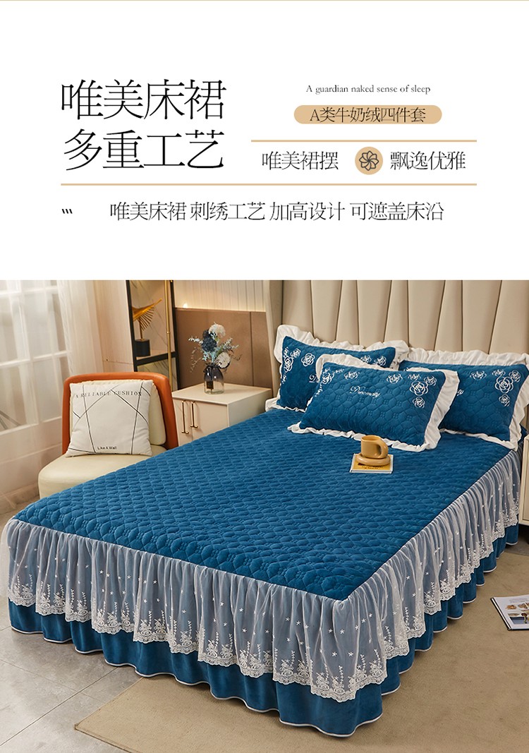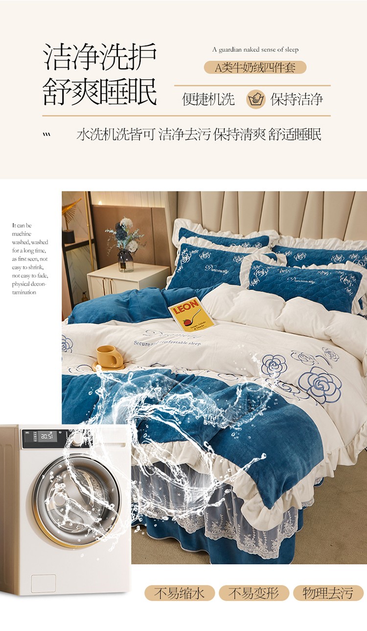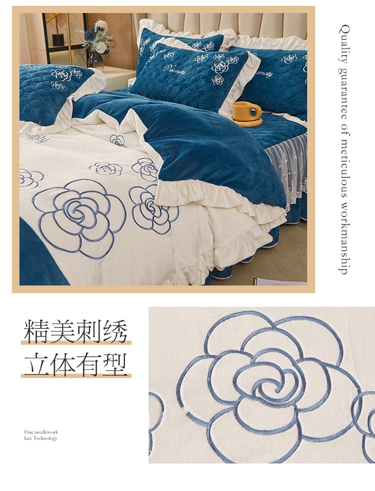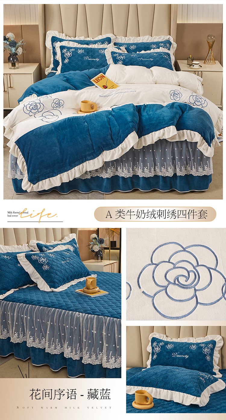 宜凡 2022新款A类牛奶绒绣花床裙三四件套 花间序语-藏蓝