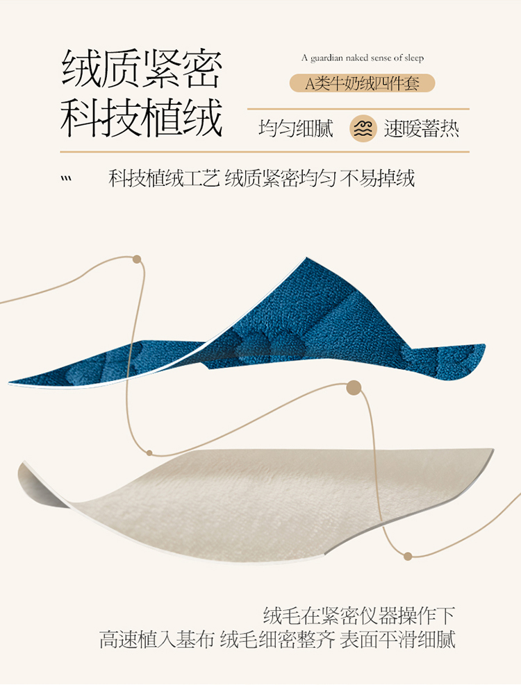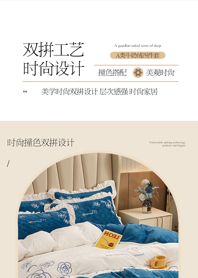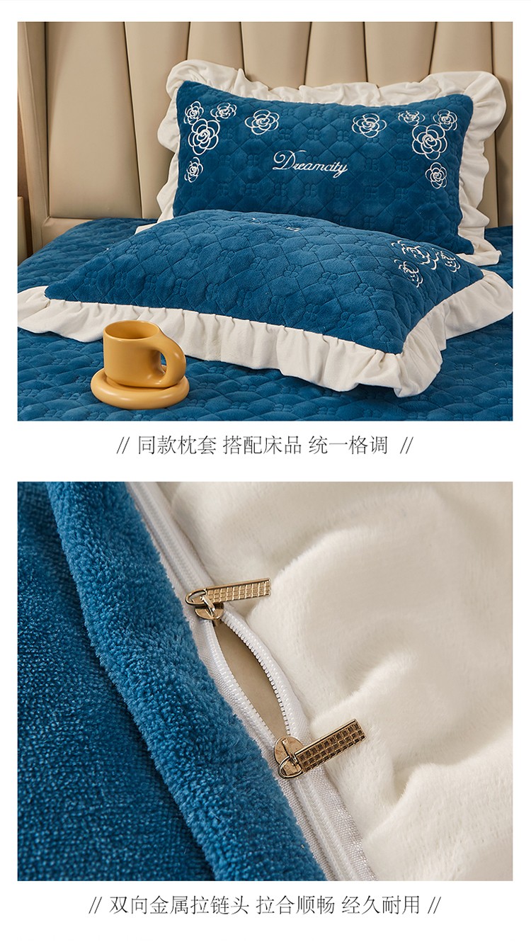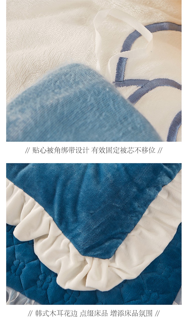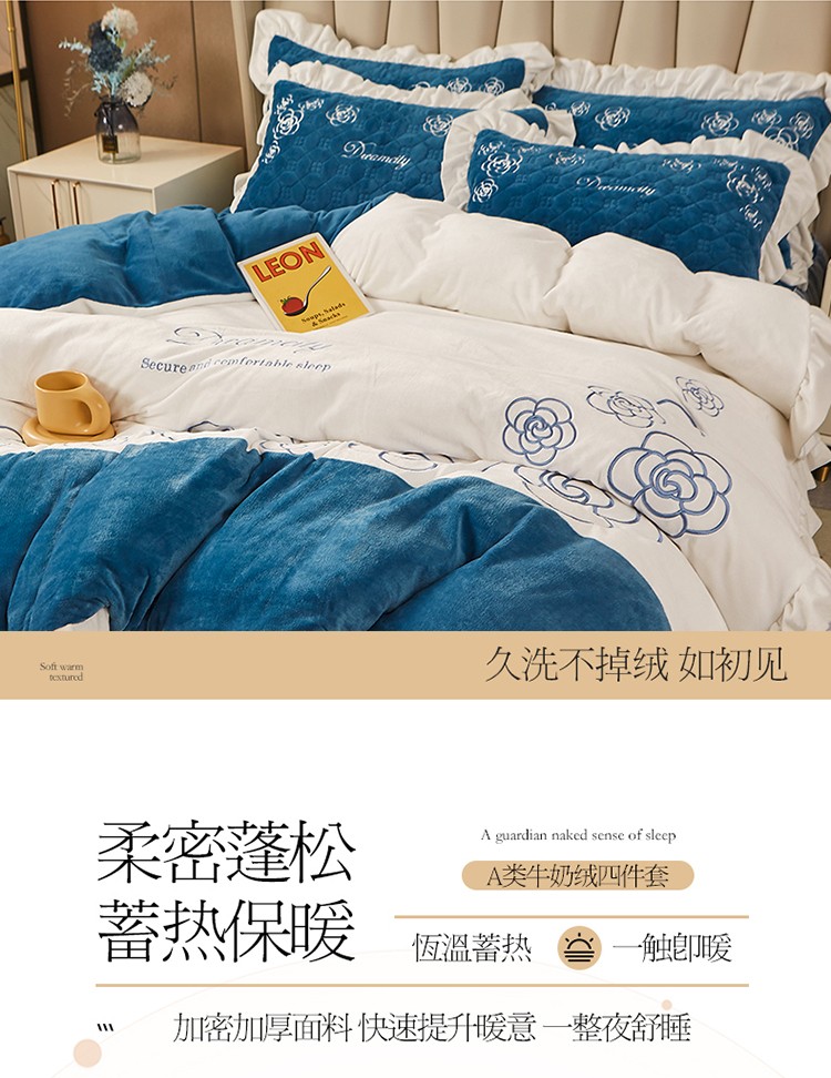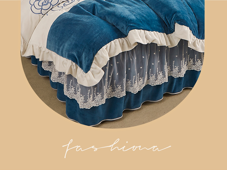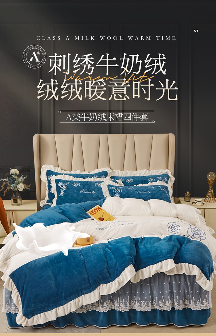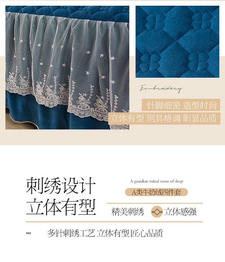 • 91家纺网 家纺一手货源 找家纺 宜凡 2022新款A类牛奶绒绣花床裙三四件套 花间序语-藏蓝
