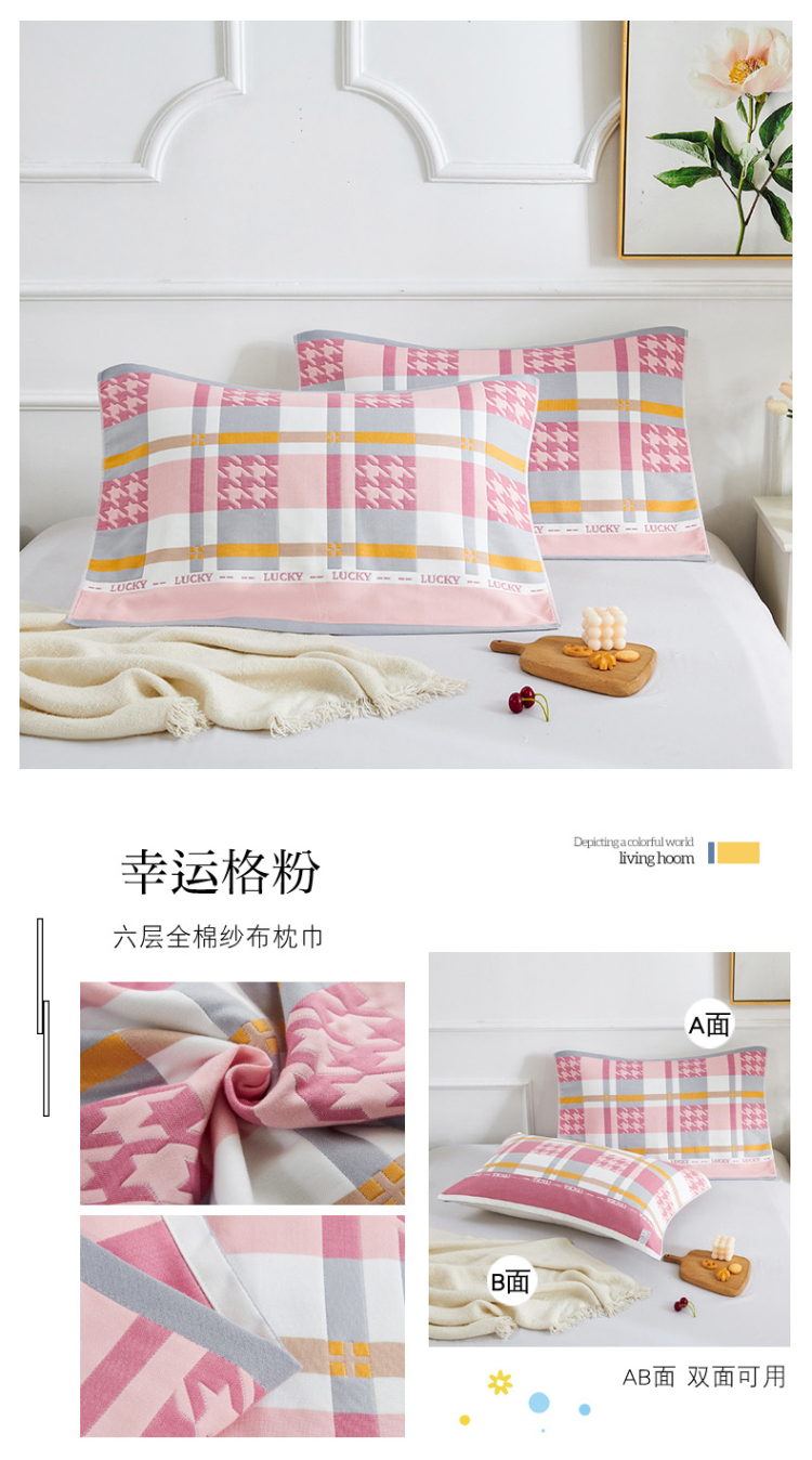 商品名称:棠薇 2023新款全棉6层纱布枕巾-简约系列 6层 幸运格粉53*80cm/对