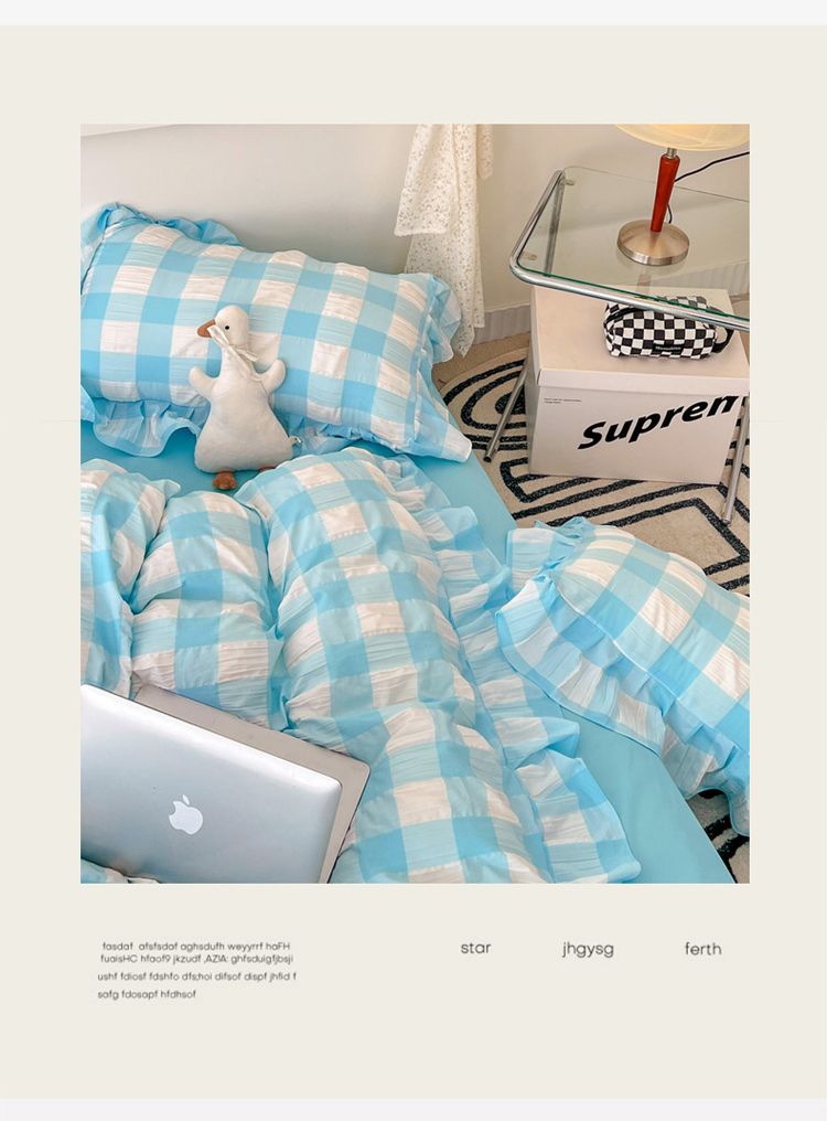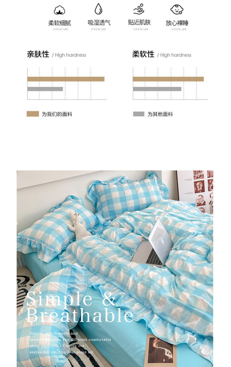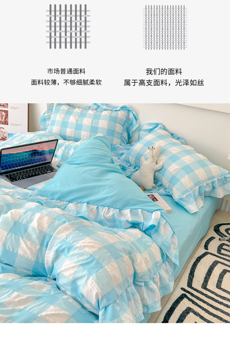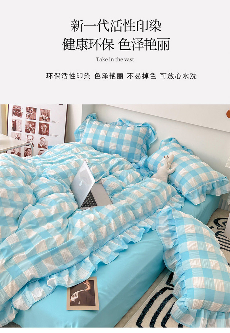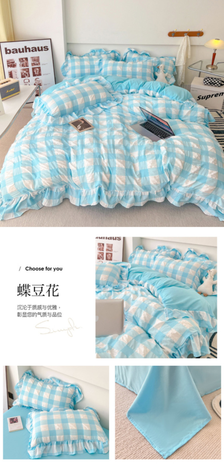 花伞2023JK风双色泡泡纱大花边磨毛四件套蝶豆花