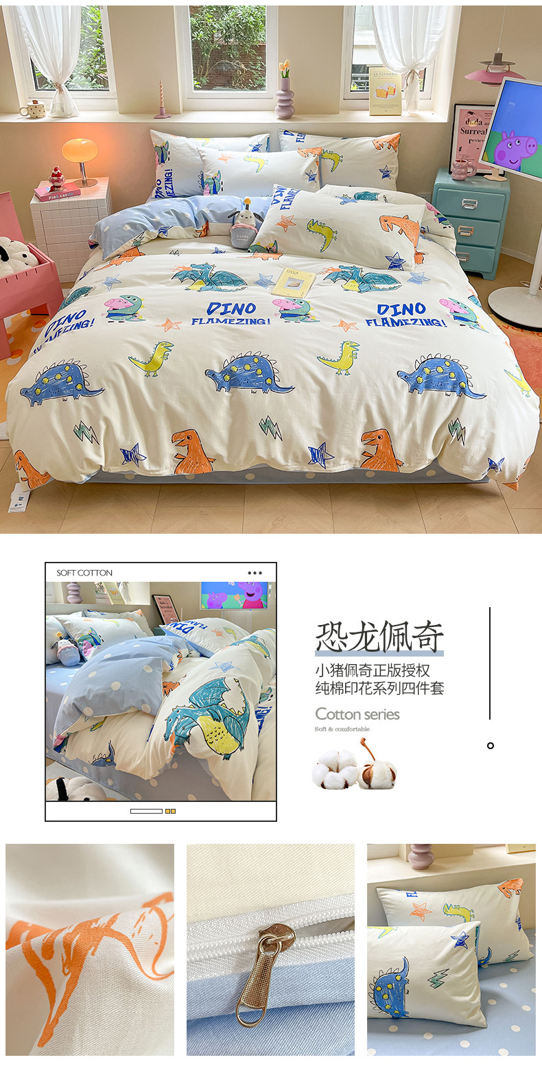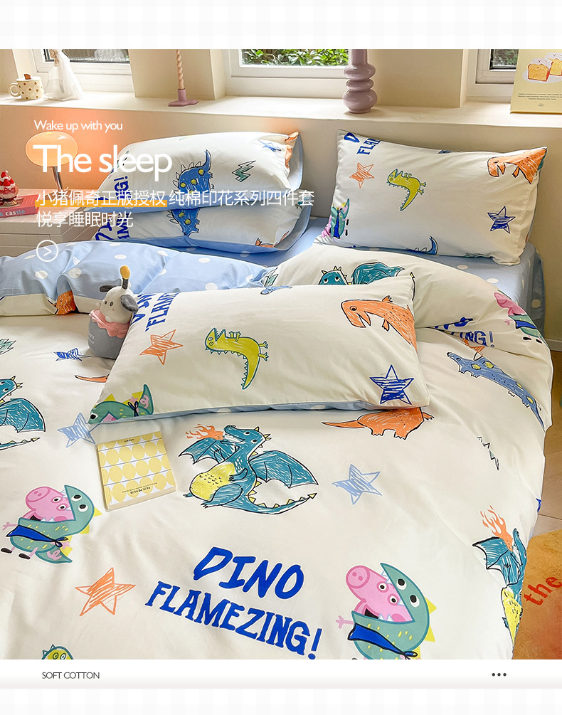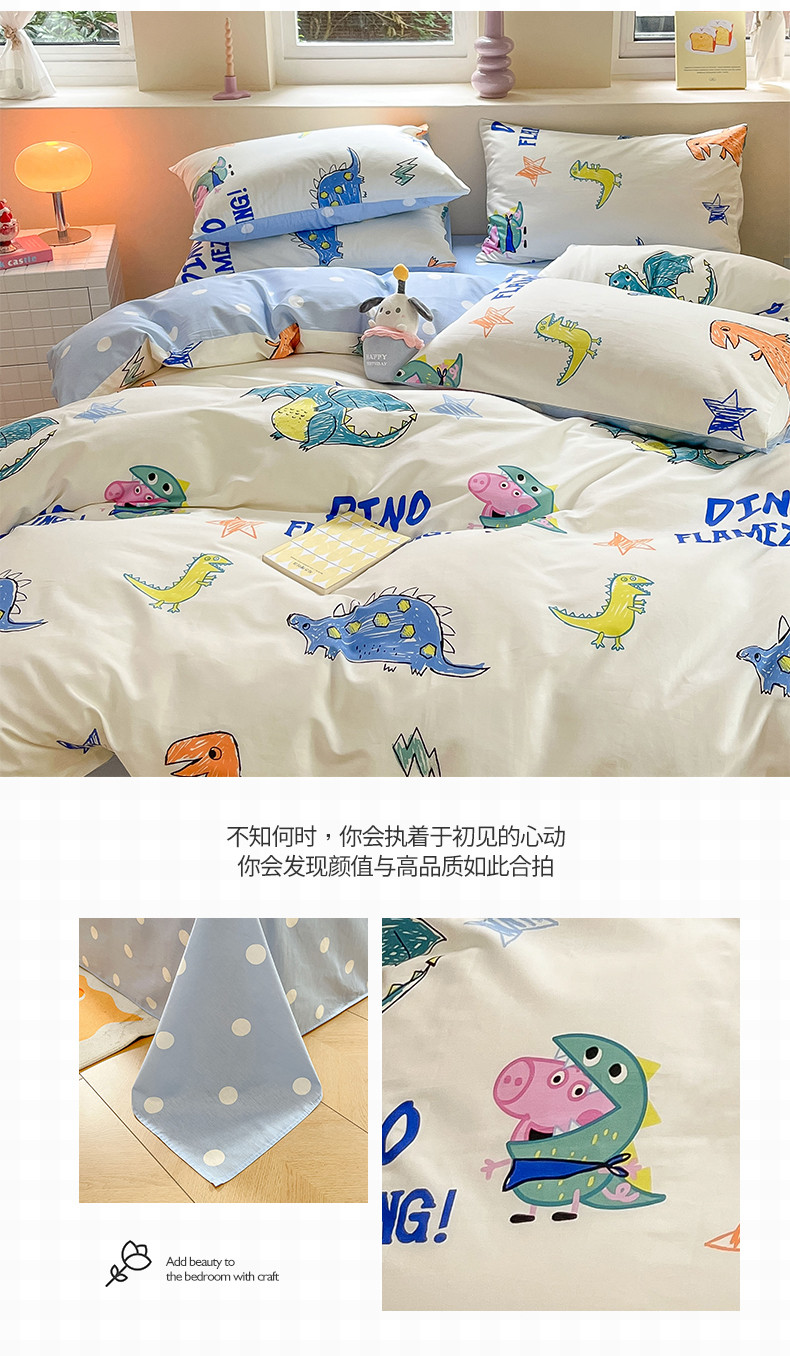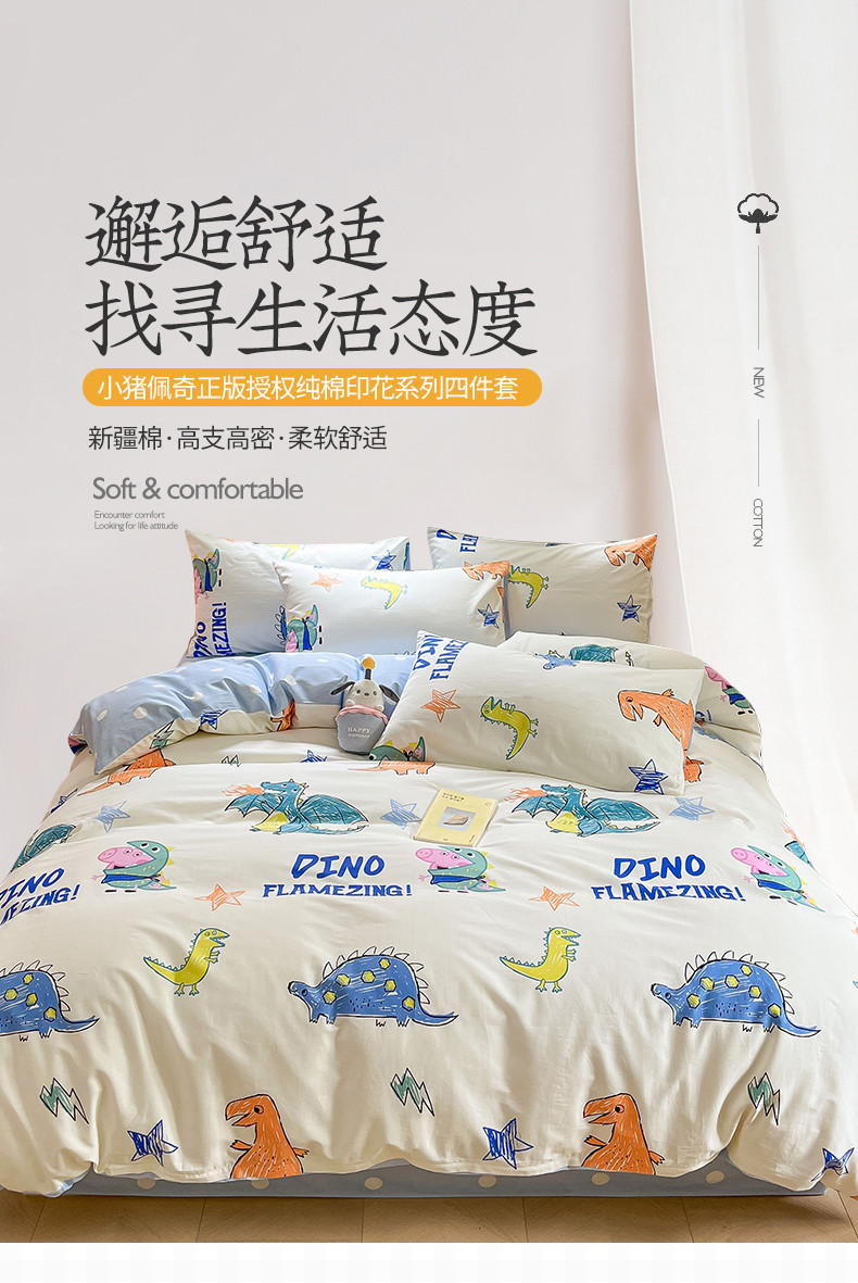商品名称:桃子家居 2023新款小猪佩奇正版授权纯棉印花系列四件套 小猪佩奇-恐龙佩奇