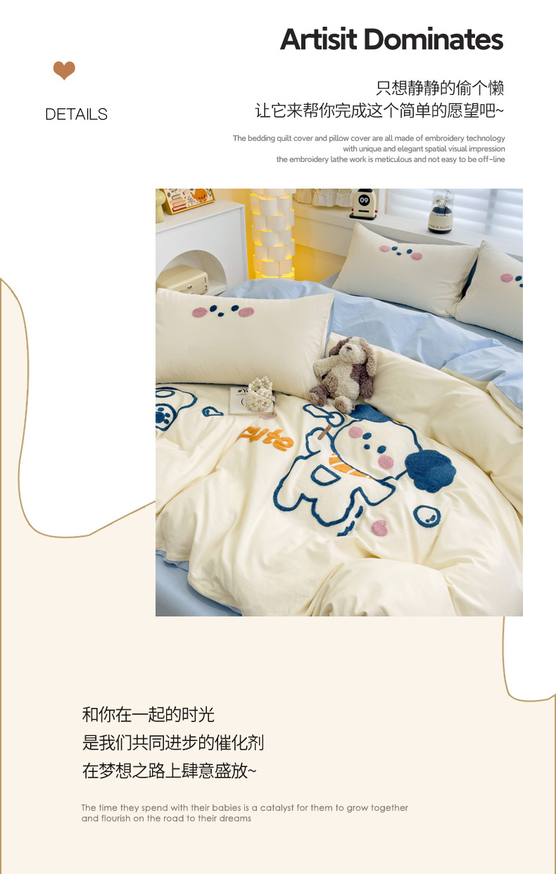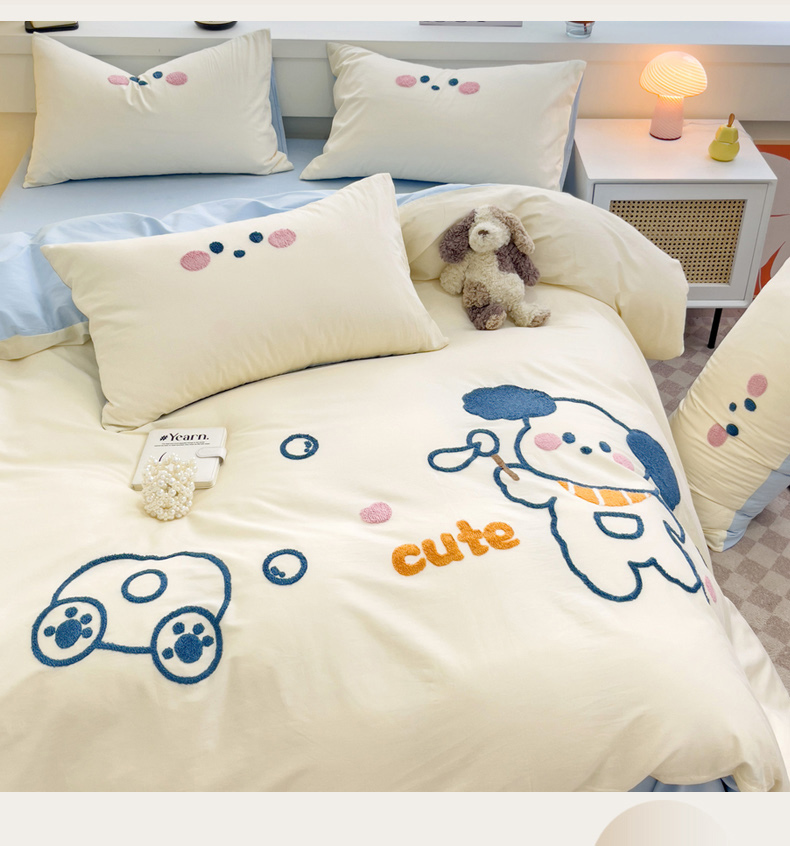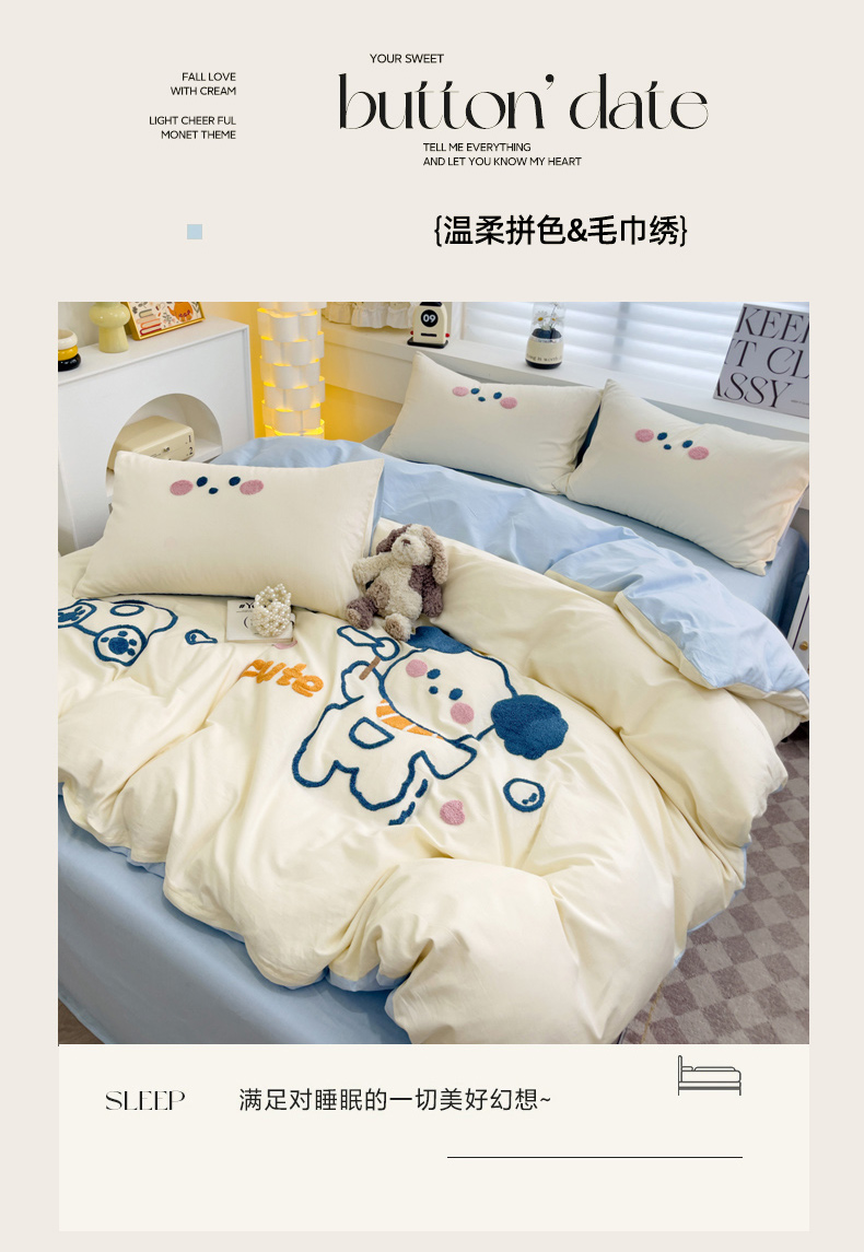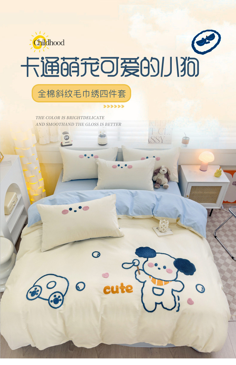 丽涵 2023新款全棉毛巾绣花卡通四件套三件套 小狗吹泡泡-天蓝