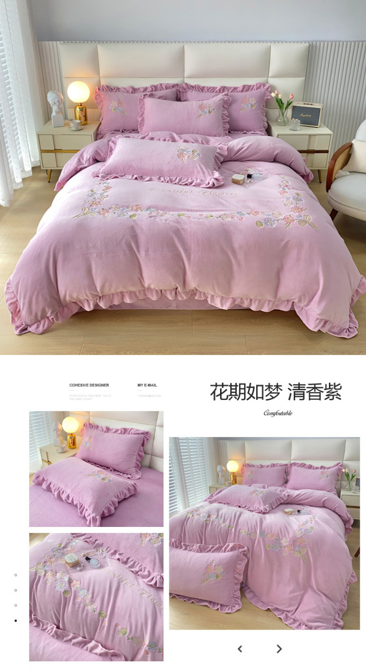 (总)星尚家纺 2024新款全消光A类230g牛奶绒韩版绣花绒四件套-绚丽花语,豆沙粉,浪漫紫,雾霾蓝,樱花粉,晨雾绿